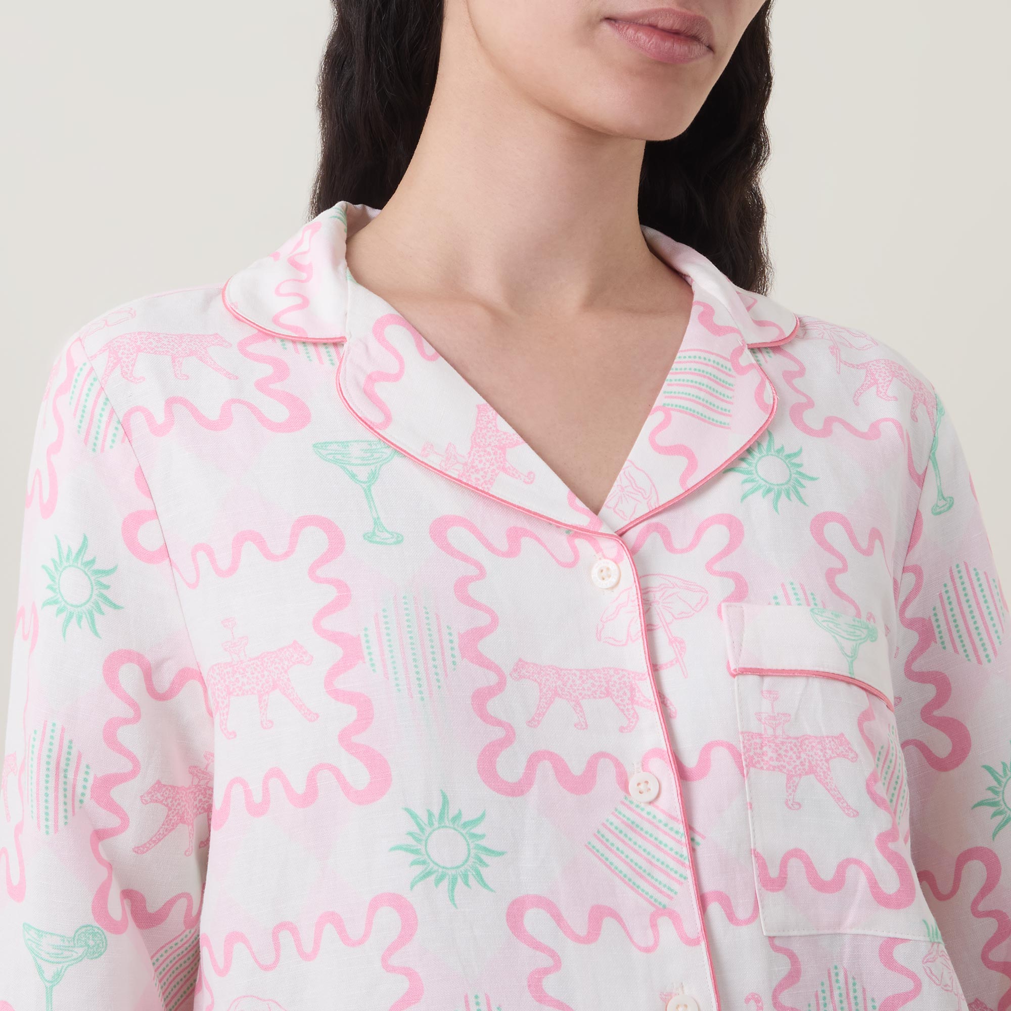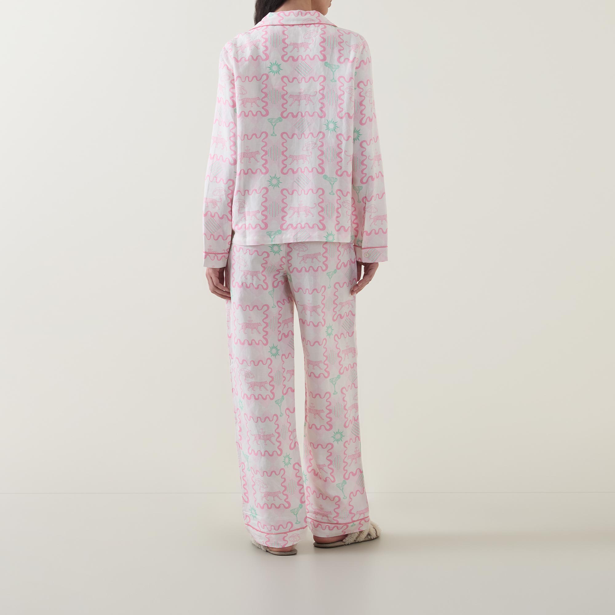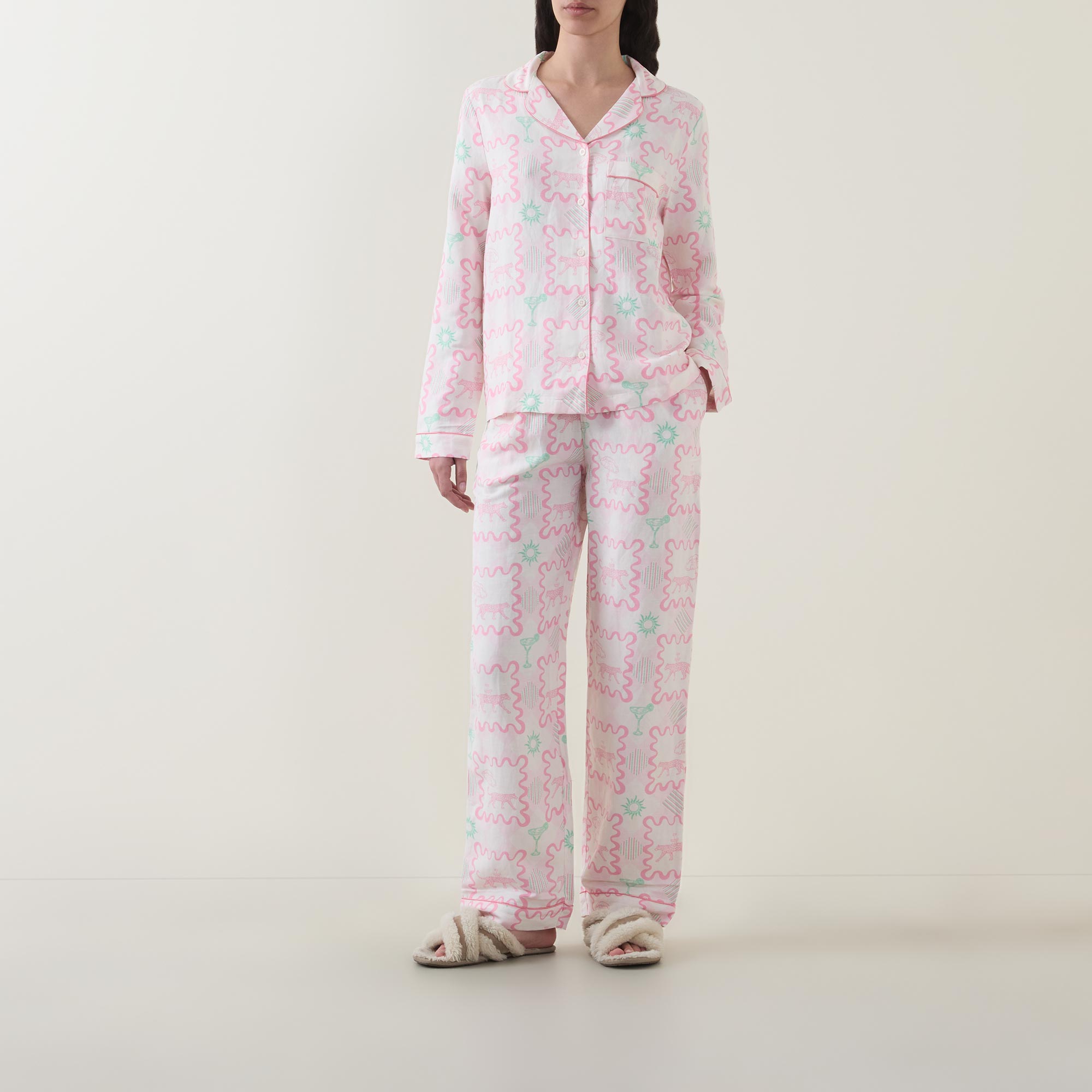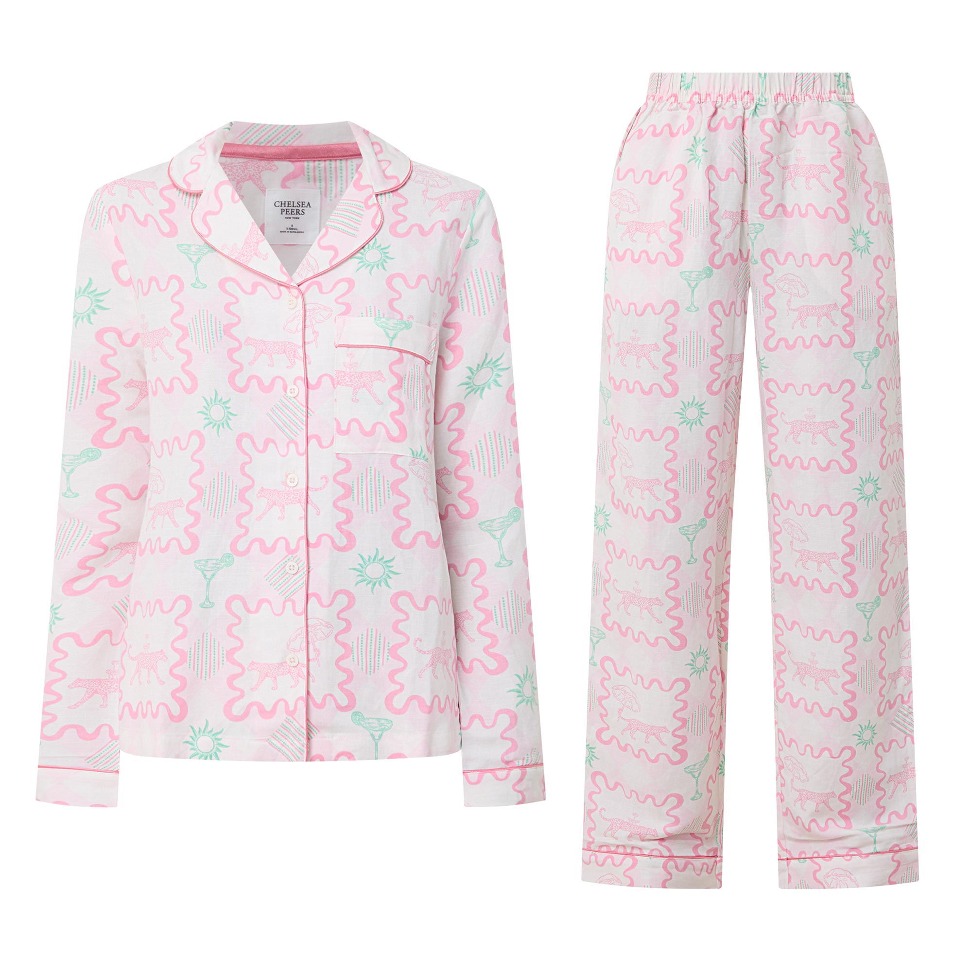 - Two-piece set: Top: Notched lapel collar, long sleeves, one chest patch pocket, front button fastening, straight hem, contrast piping; Trousers: Mid-rise, straight-leg, elasticated waistband, two side entry pockets, clean hems, contrast piping, printed design throughout