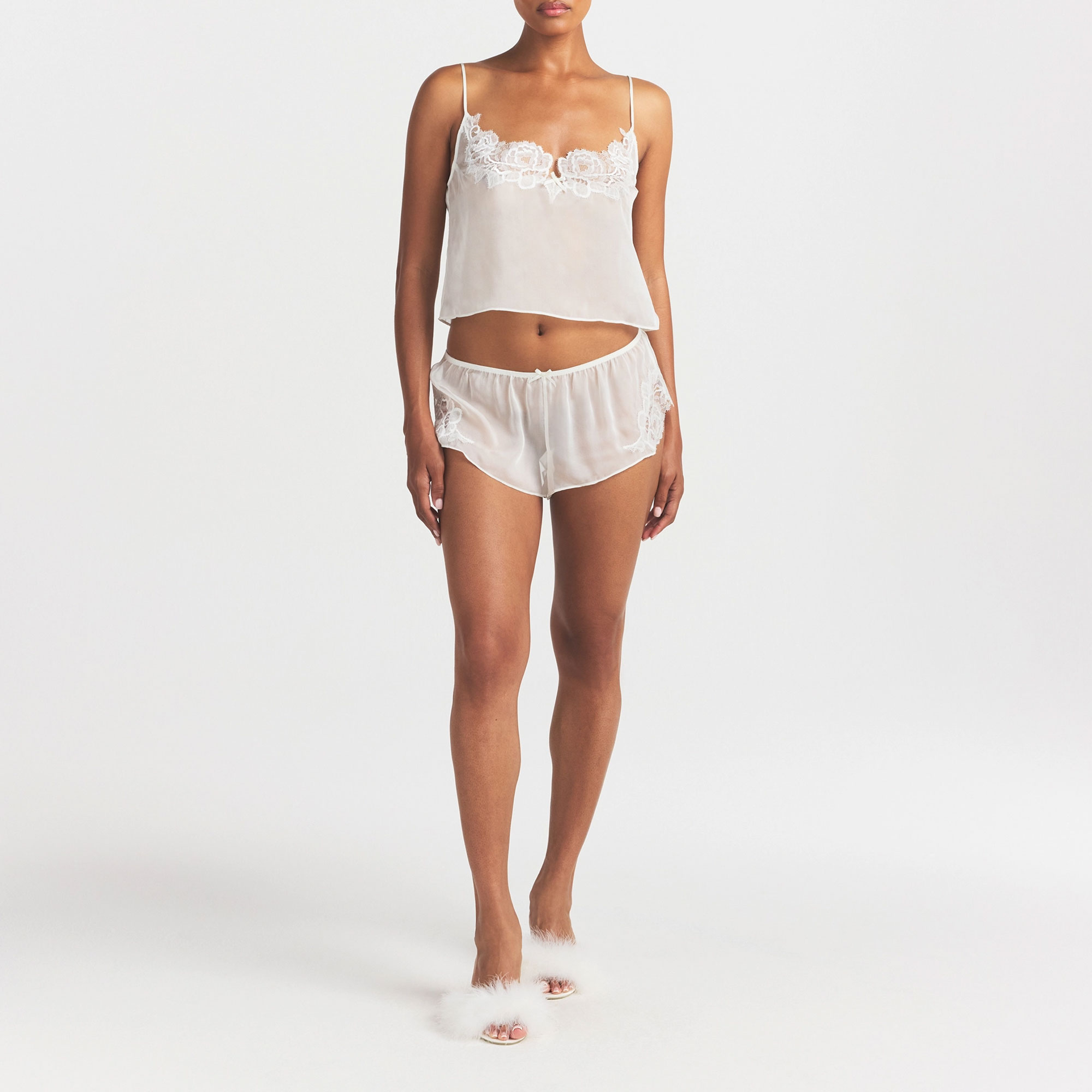 Love at first sight. This cami and short set features delicate lace appliqué at the neckline and leg openings, finished with a satin bow at the centre front. The easy, cropped cami and relaxed shorts make it the perfect honeymoon pick.