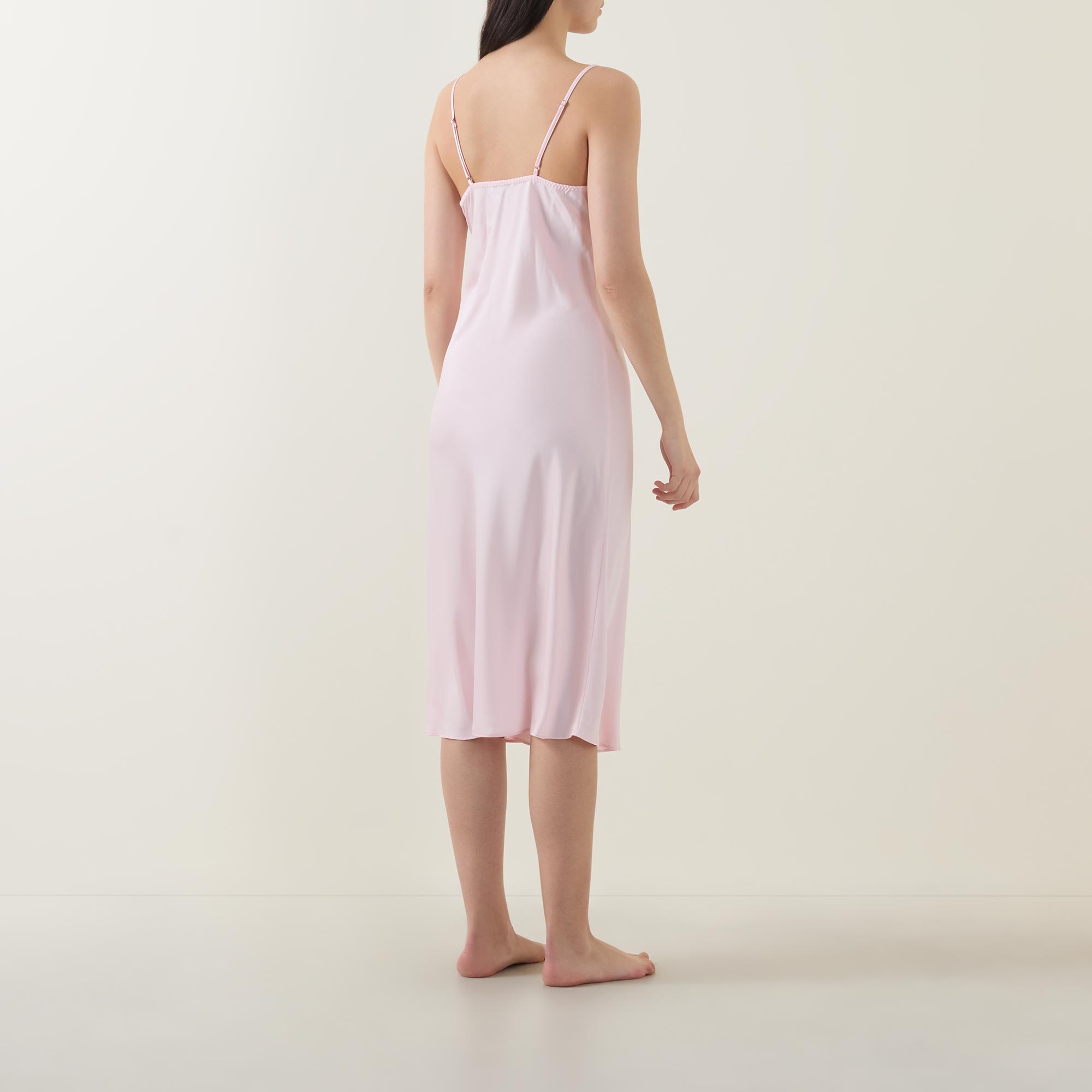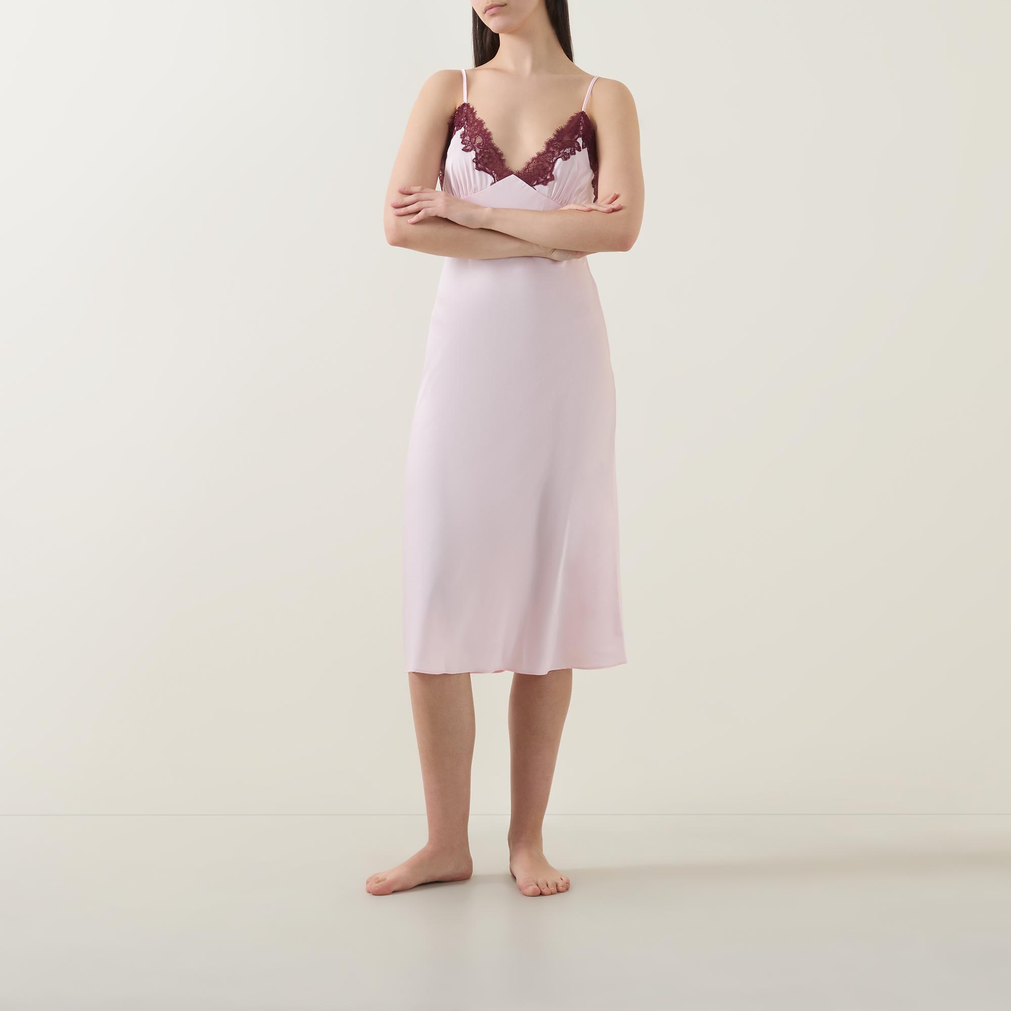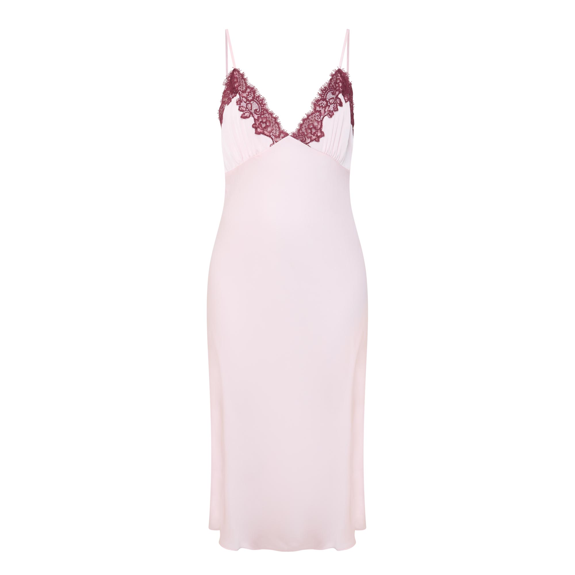 • V-neckline, adjustable straps, long length, lace embellished trims, smooth satin fabric