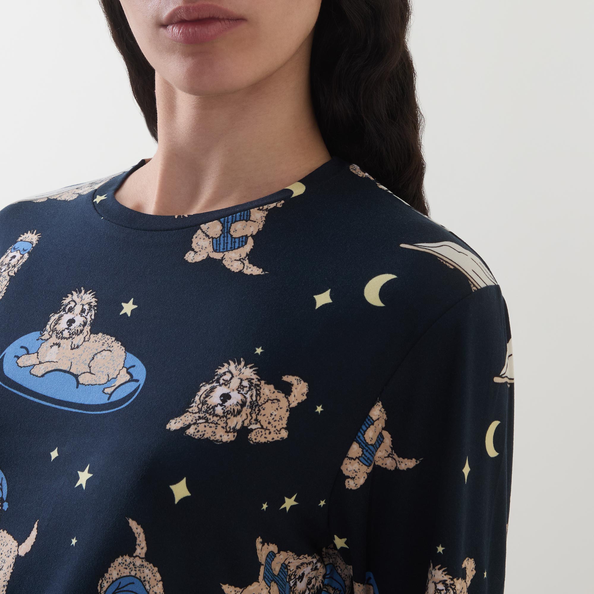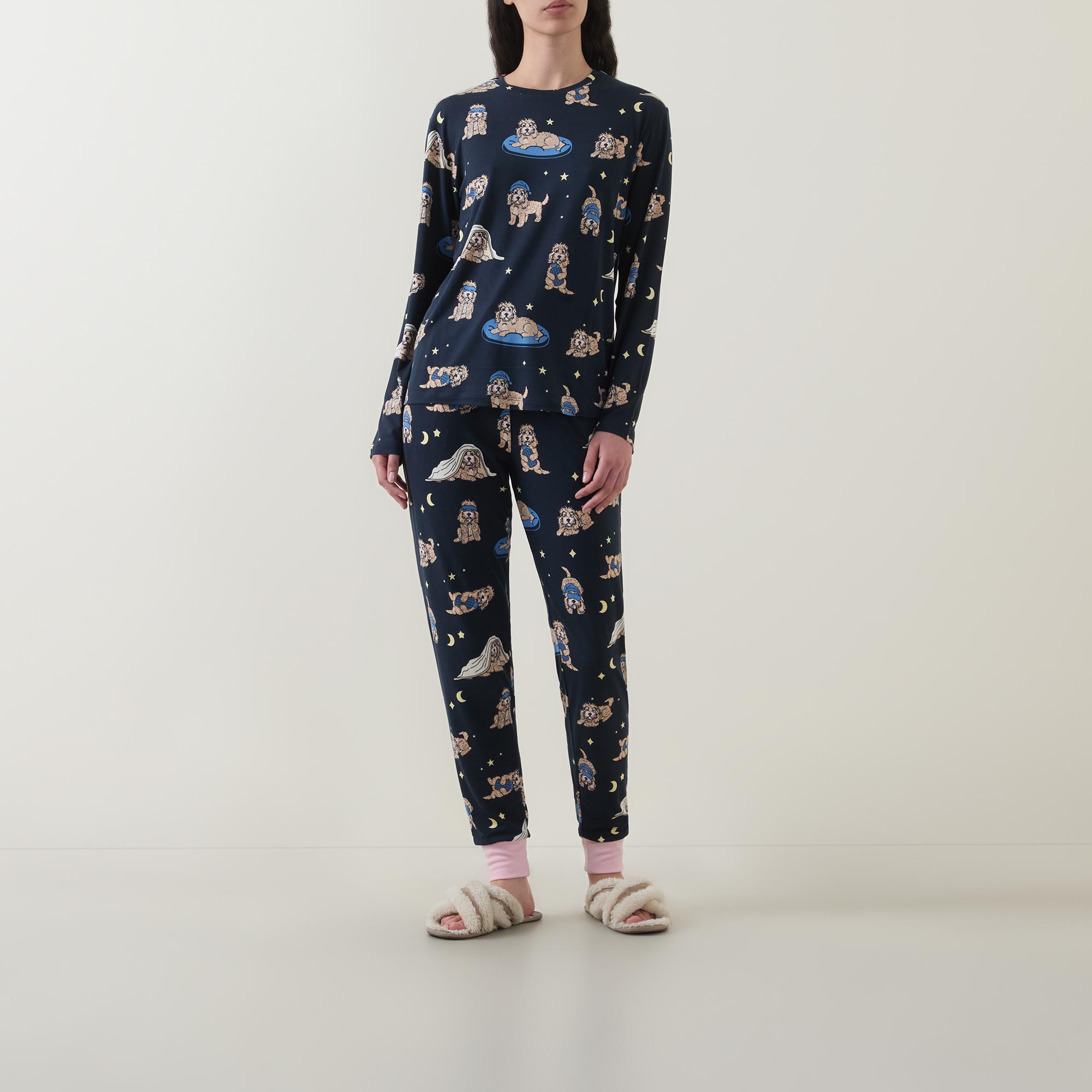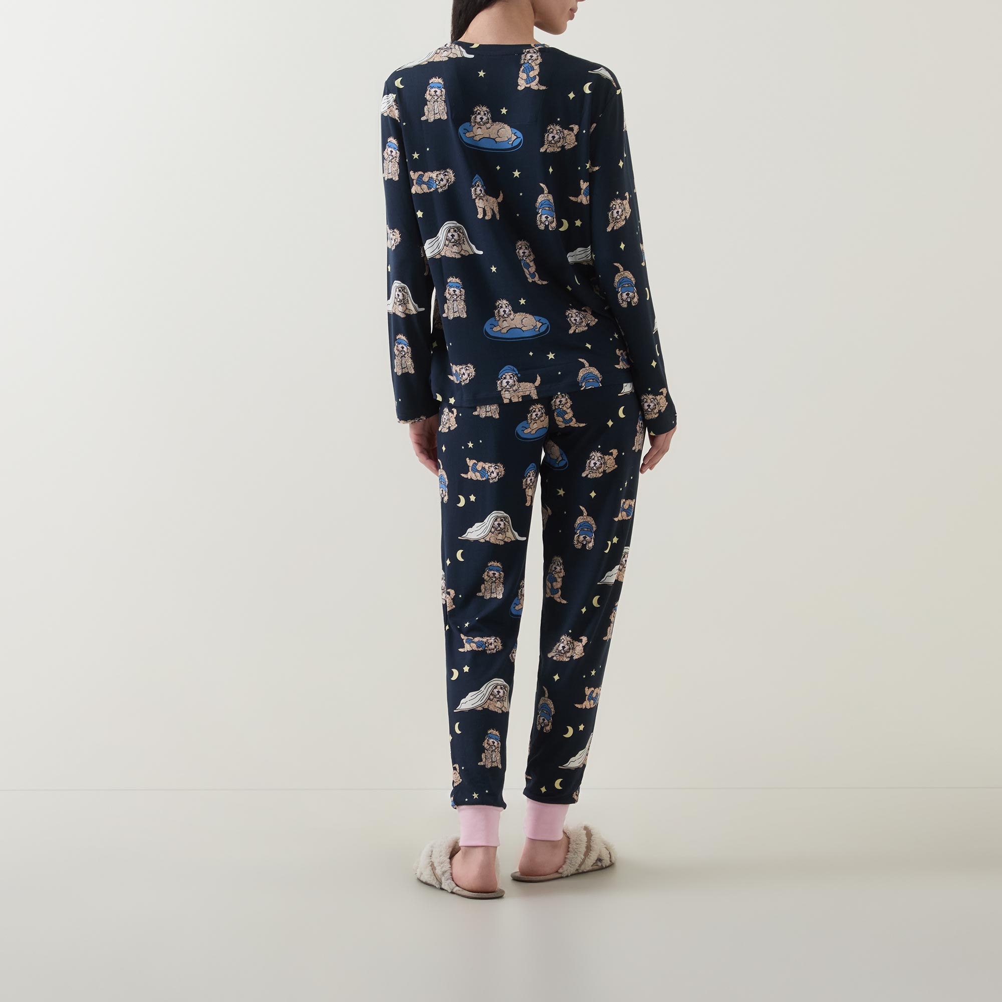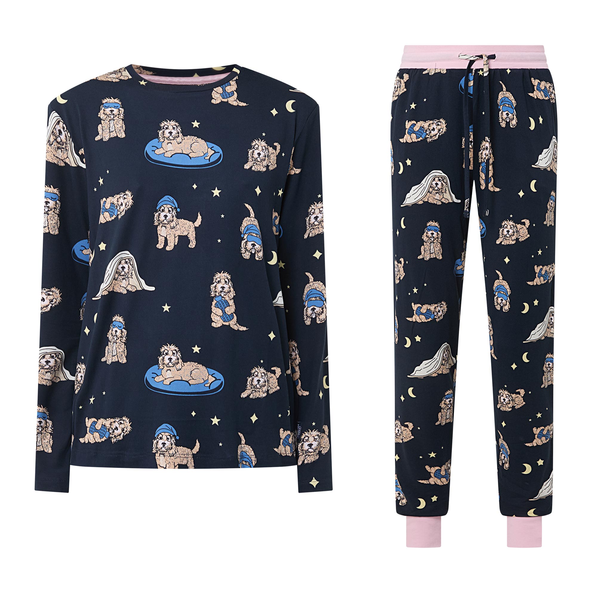 - Two-piece set: Top: Round neck, long sleeves, straight hem, dog print, smooth finish. Bottoms: Mid-rise, slim-leg, full-length, elasticated waistband, adjustable drawstring fastening, two in seam pockets, cuffed ankles, contrast trims, dog print, smooth finish
