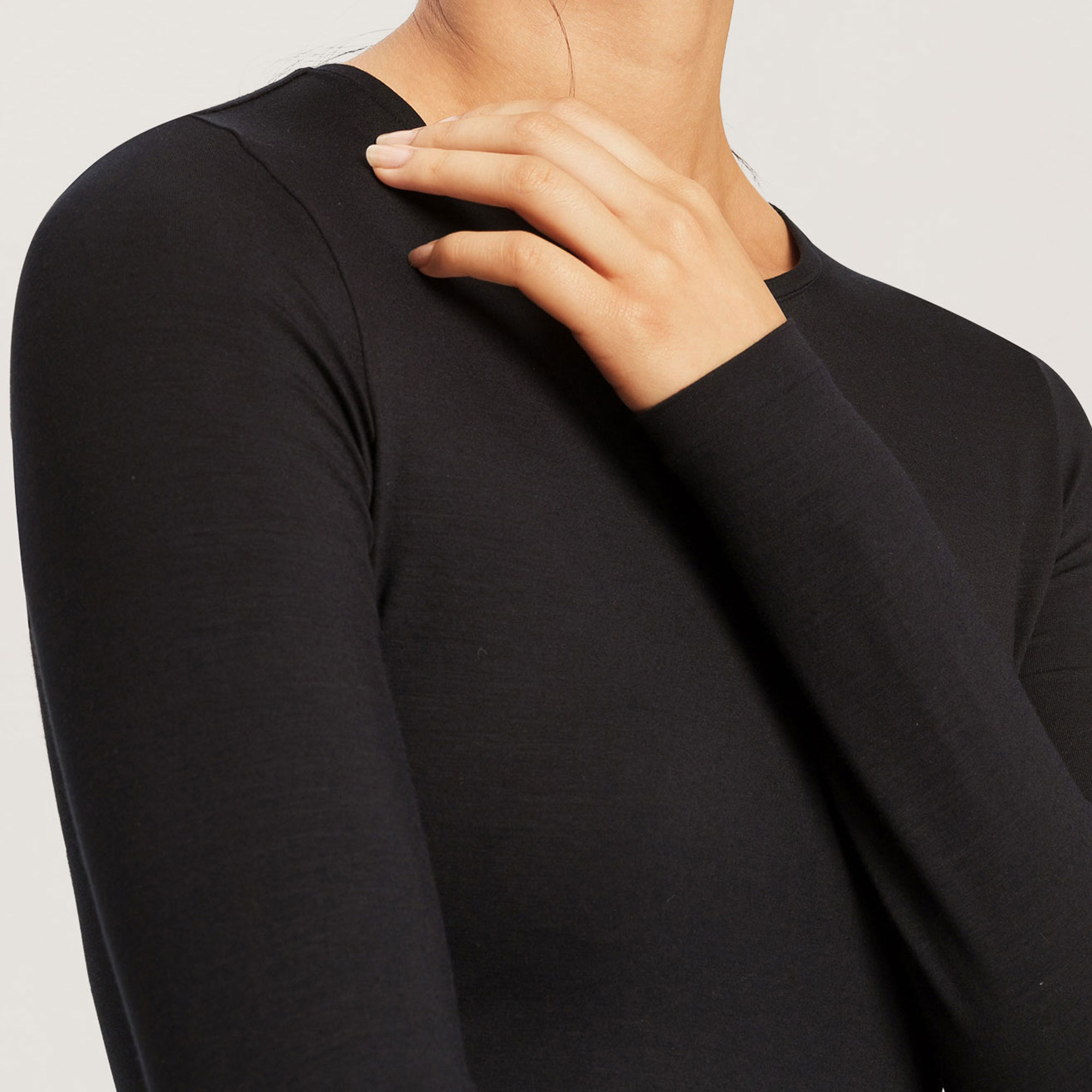 - Long sleeves, round neckline, tonal stitching, smooth fabric