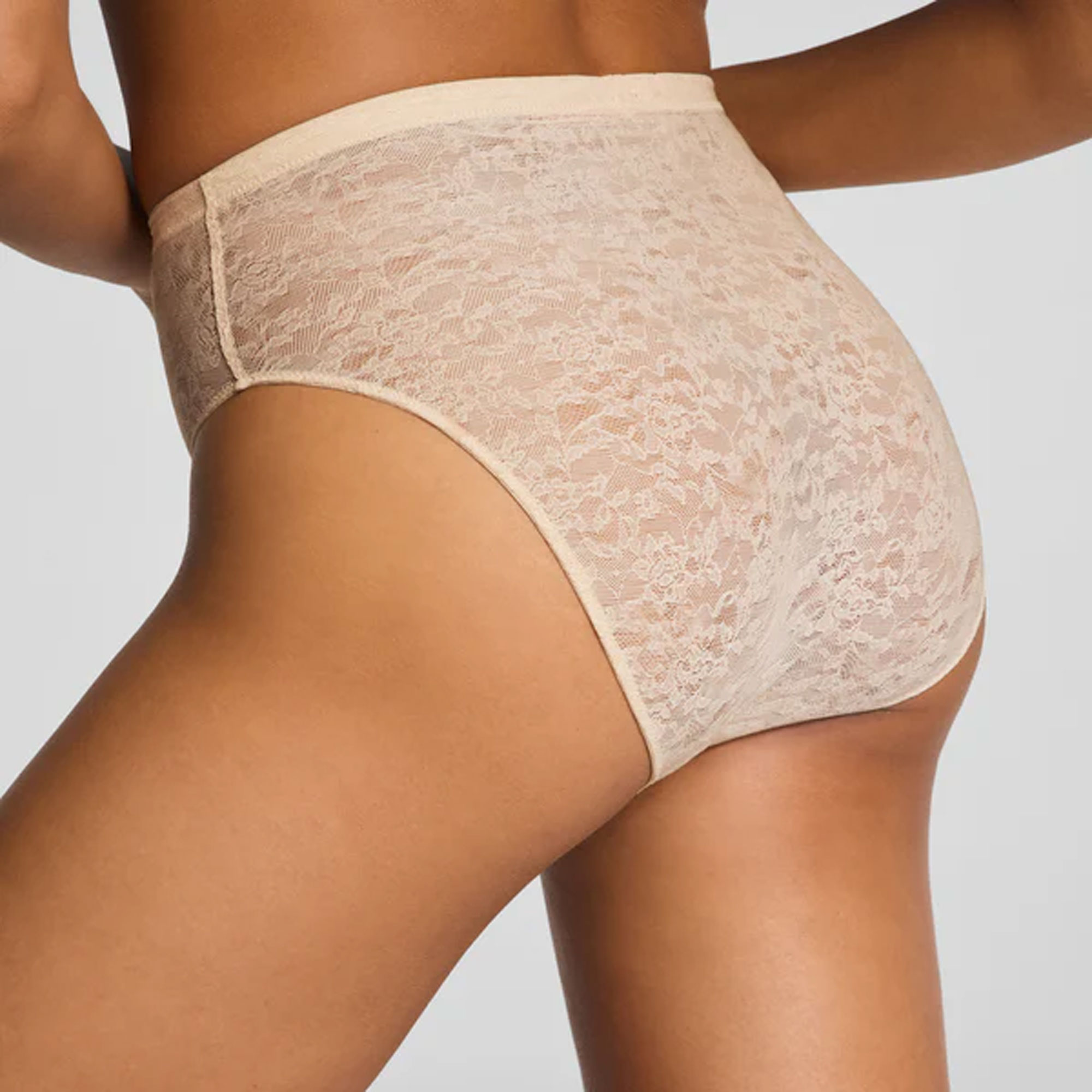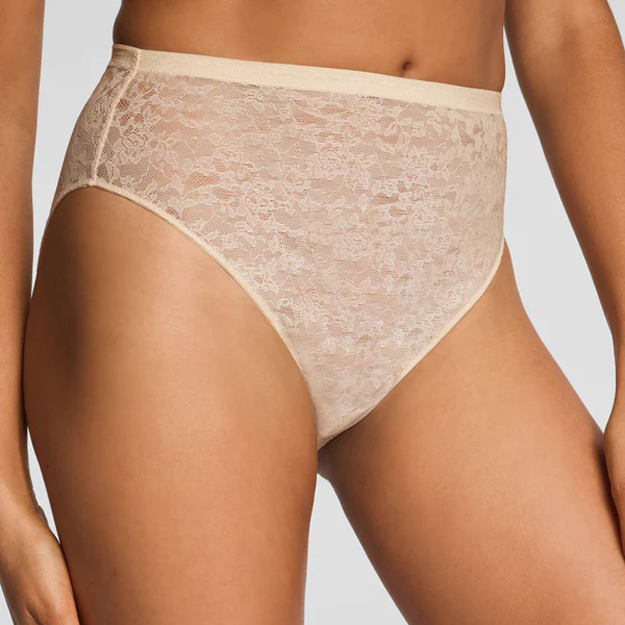 - Elasticated waistband, full coverage, floral lace structure, sheer finish