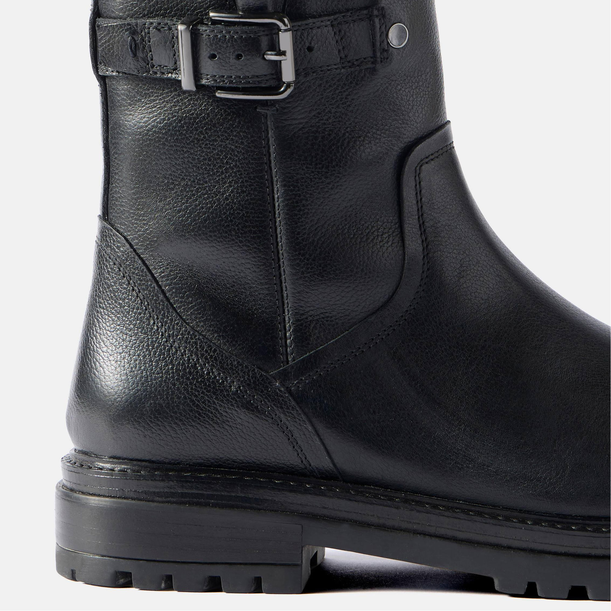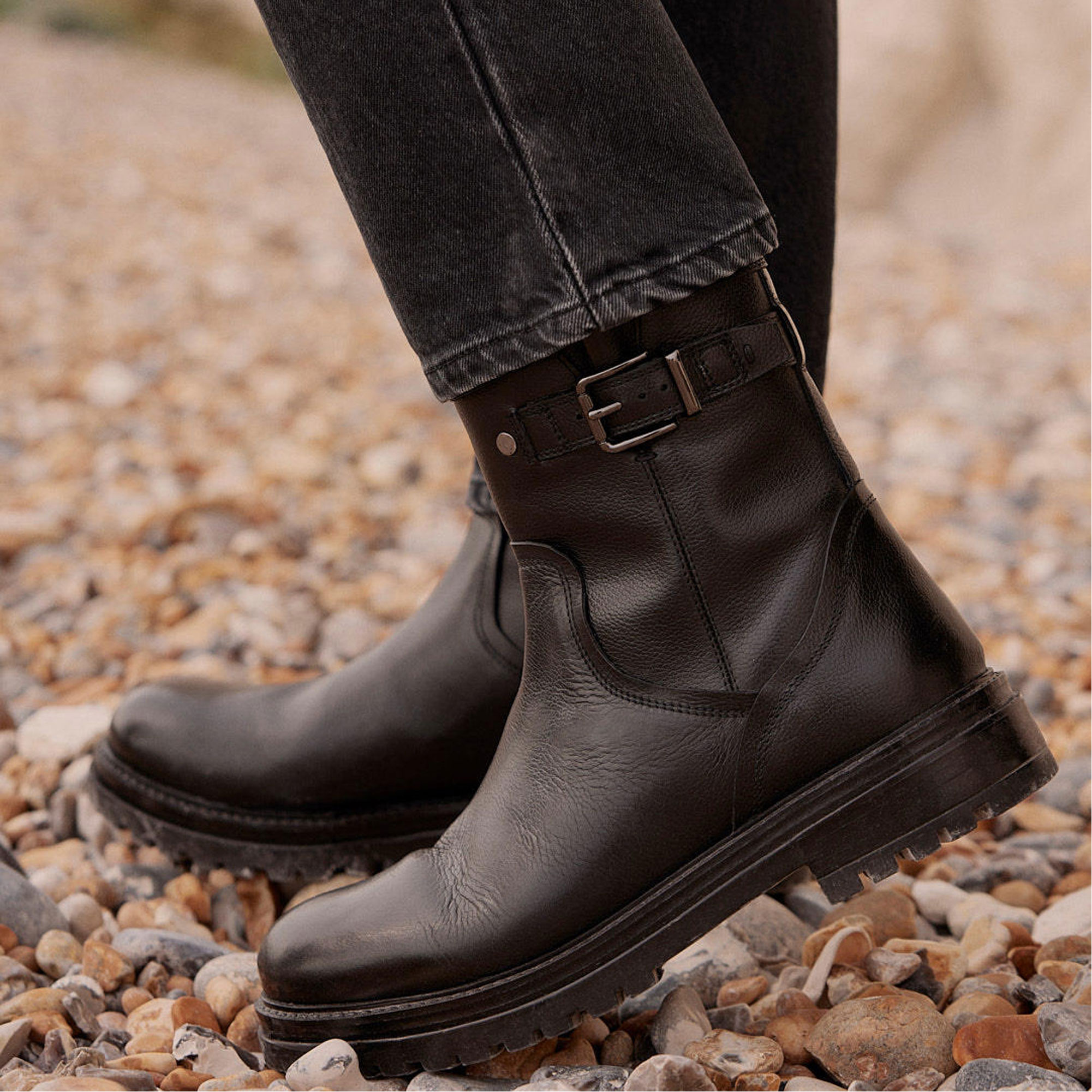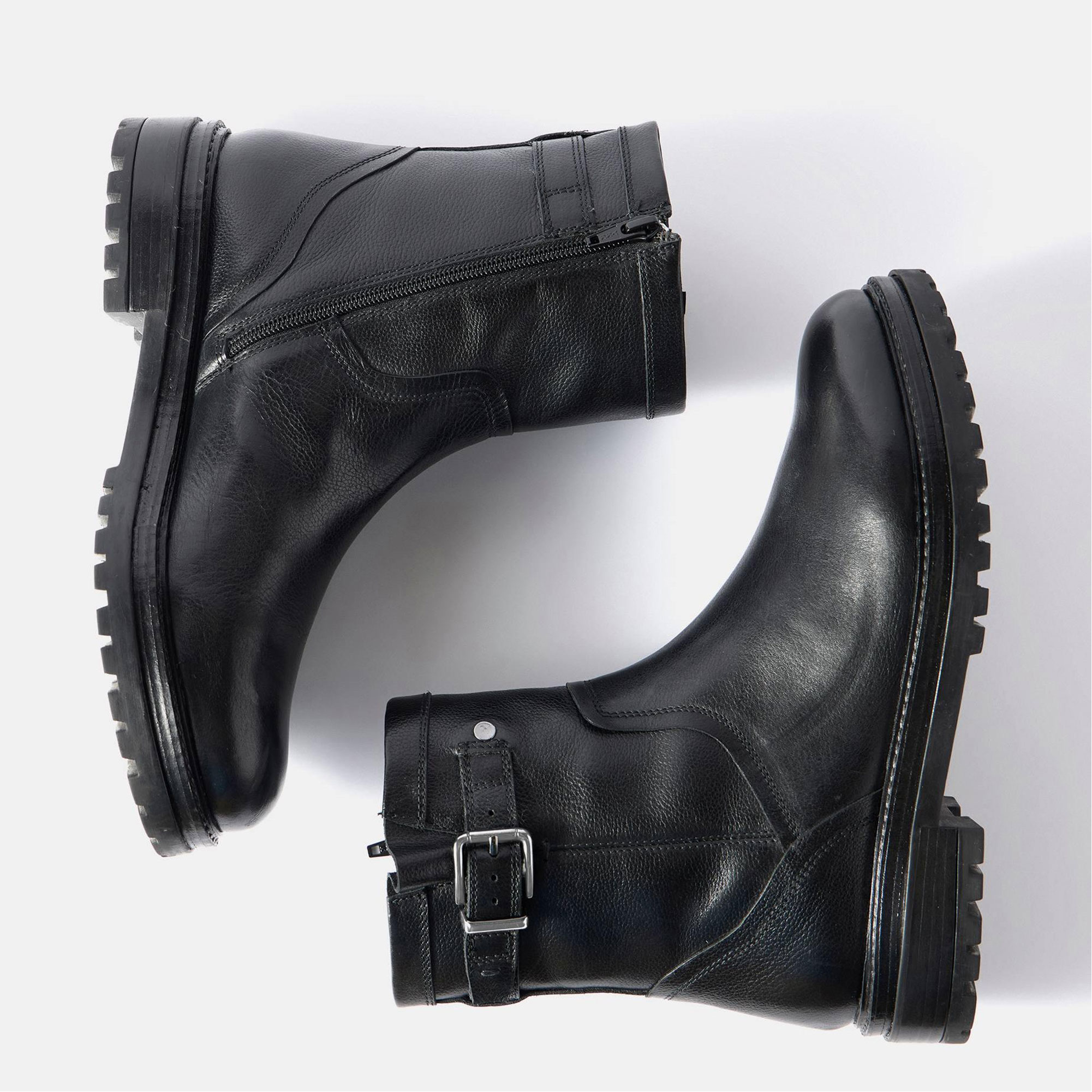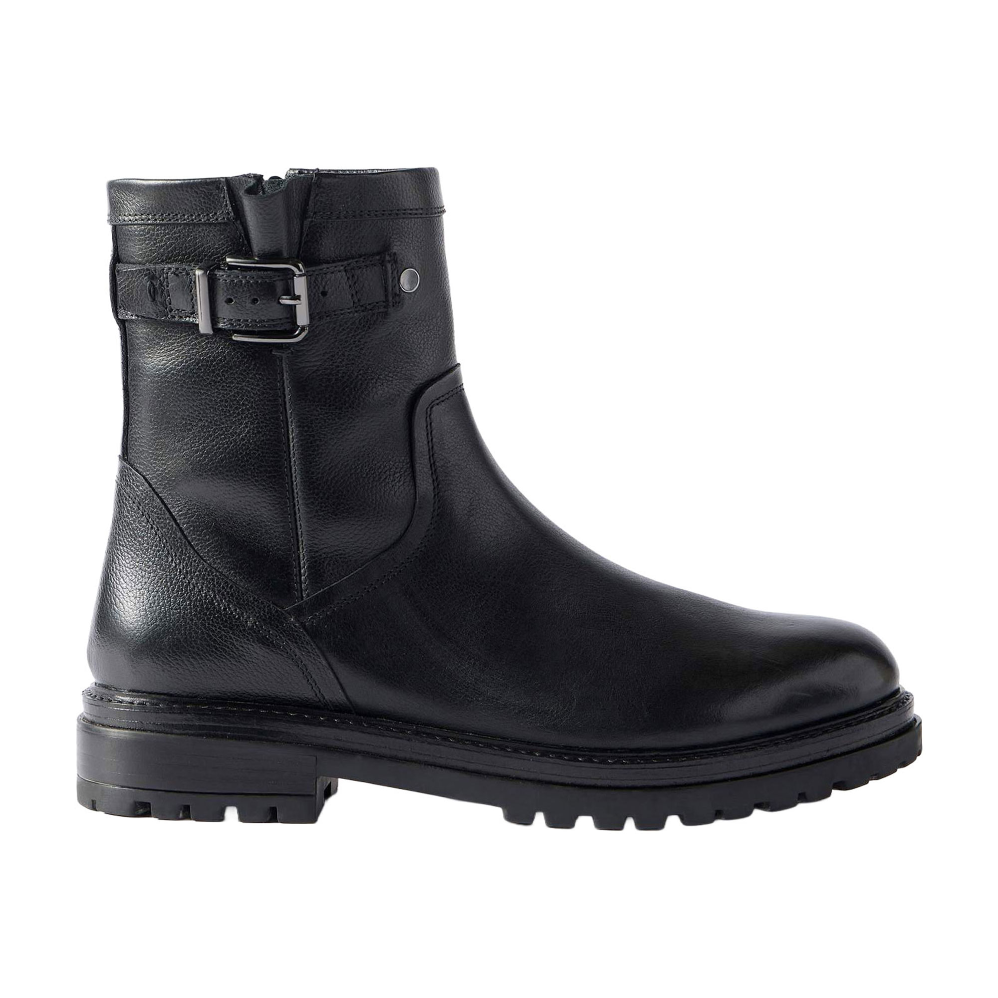 - Leather upper, ankle style, round toe, flat cleated heel, side buckle detail, side zip fastening