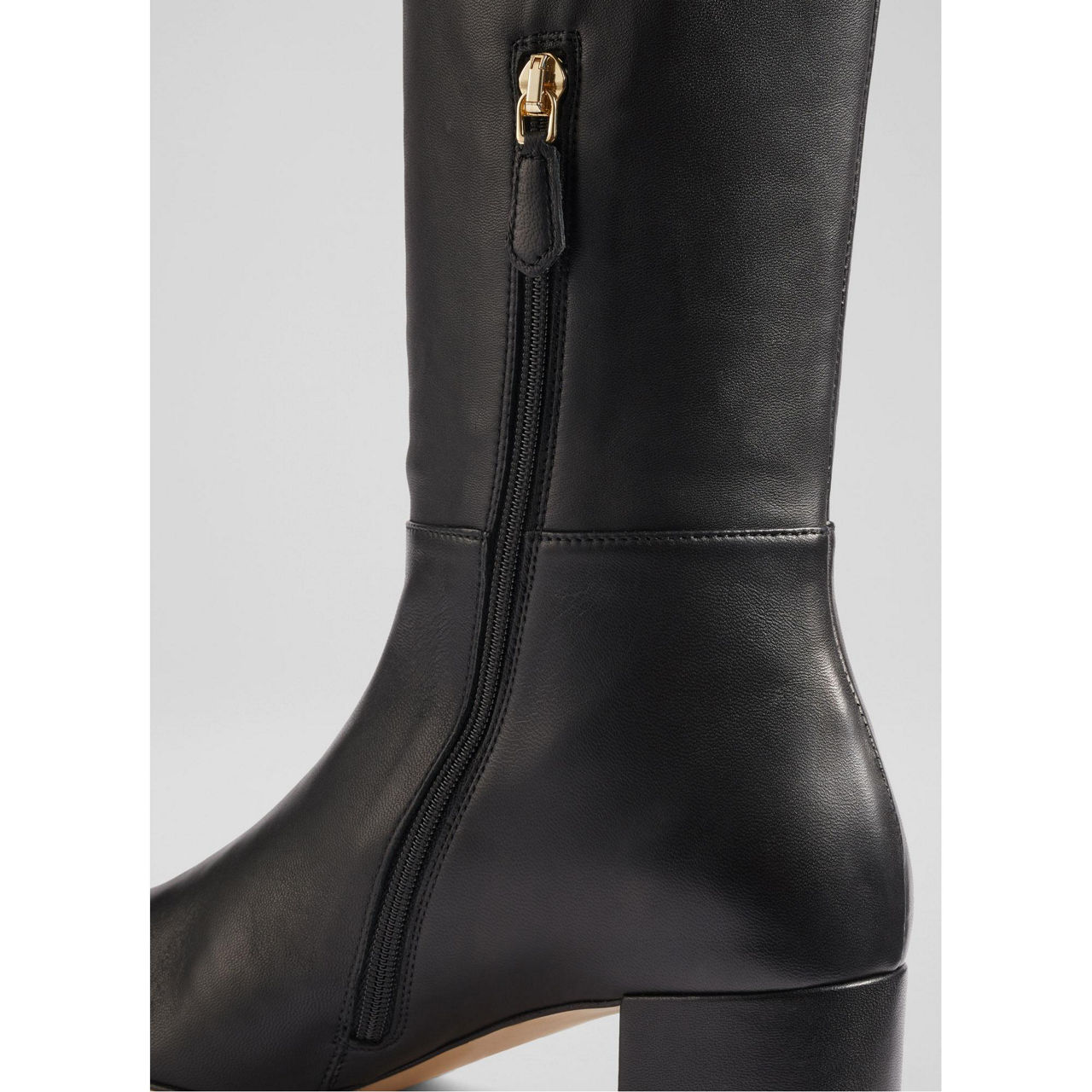 - Knee height, zip fastening, block heel, round toe.