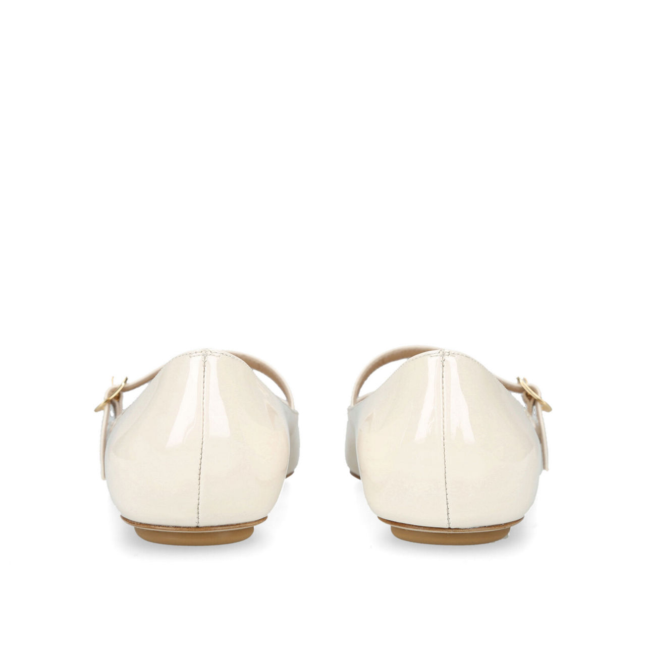 - Pointed toe, buckle fastening across the foot, enclosed heel, patent finish, gold-tone hardware