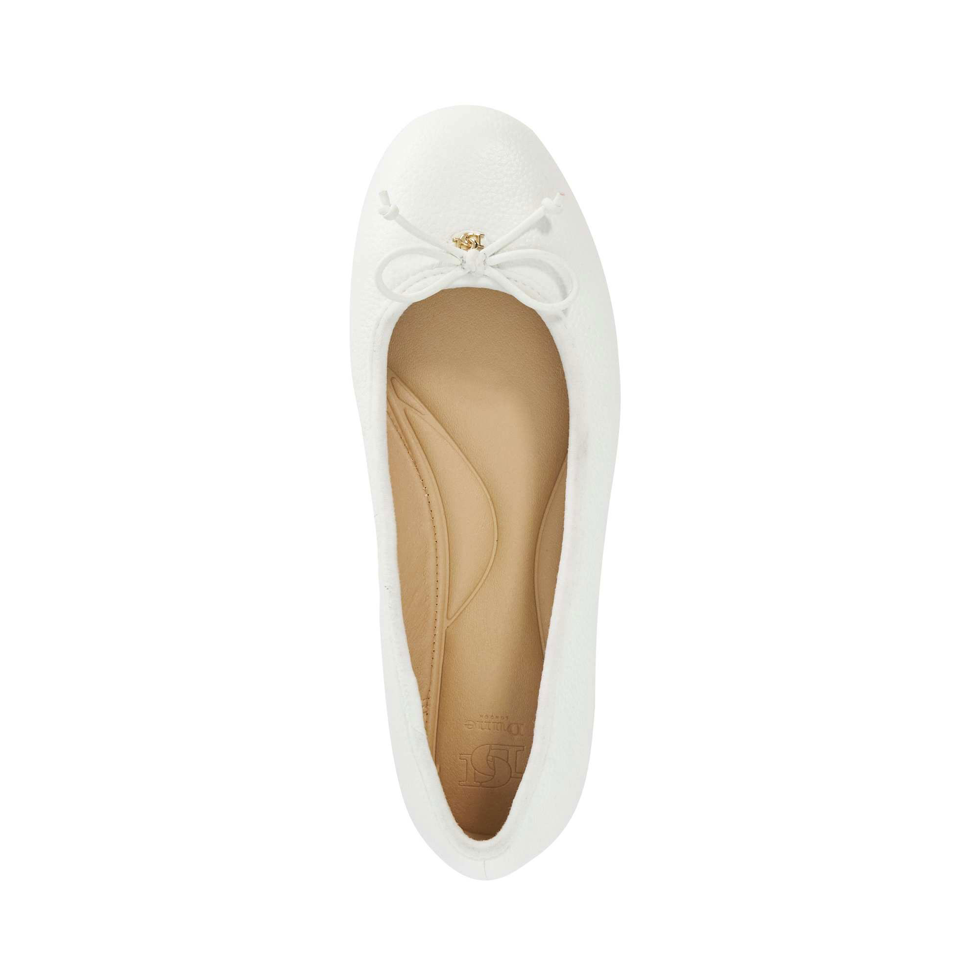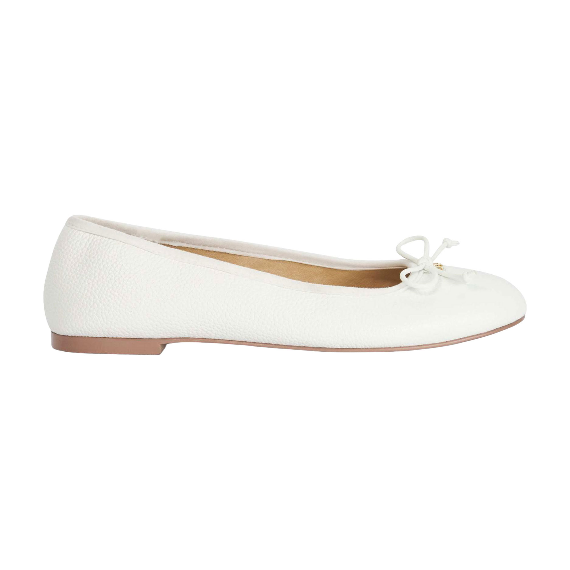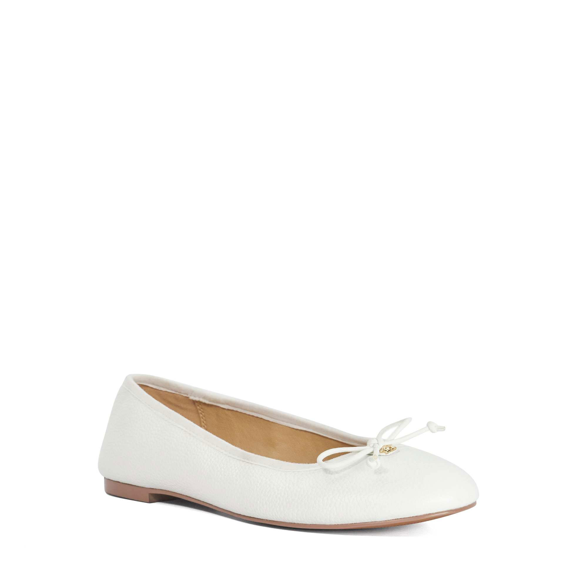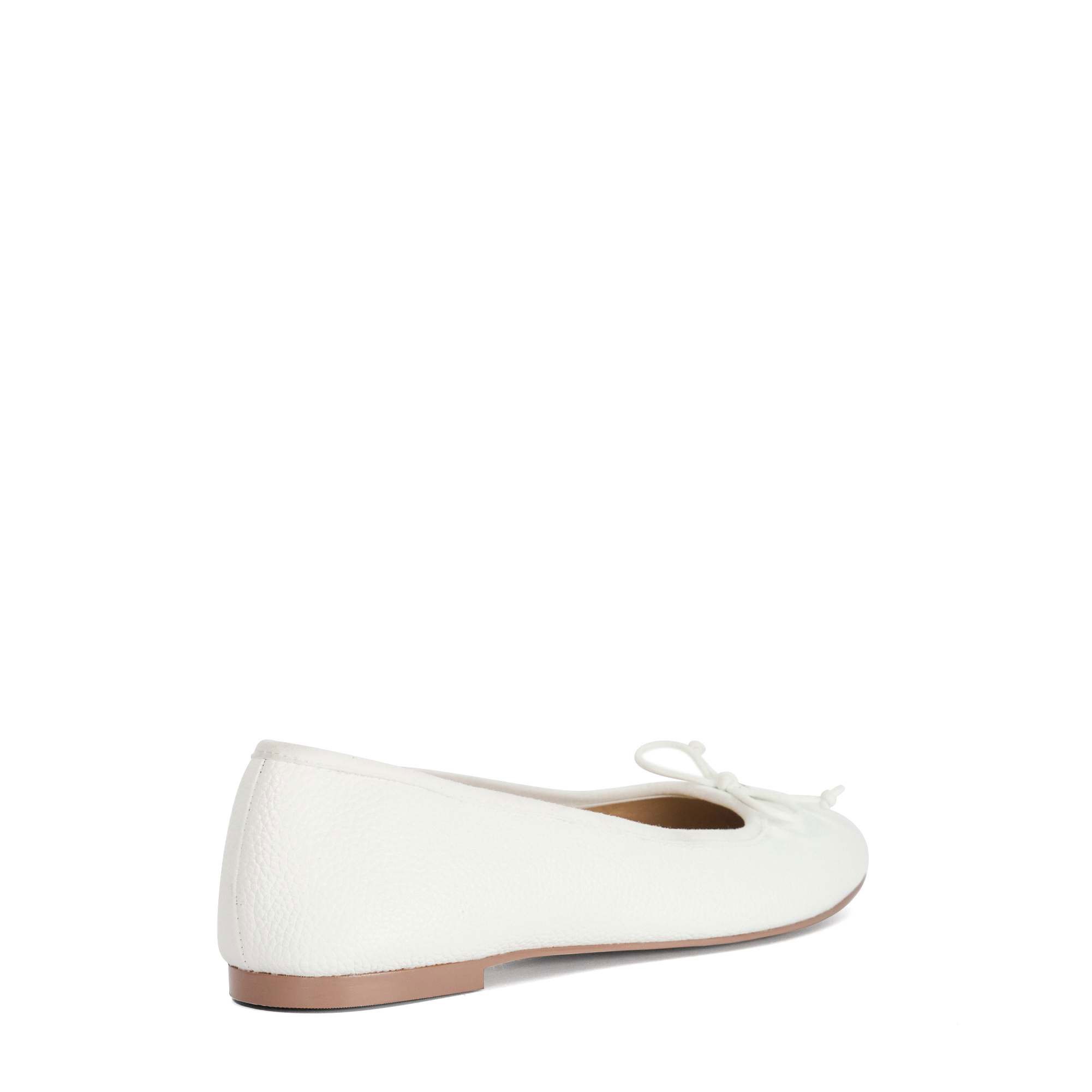- Leather, ballet style, slip-on silhouette, bow detail, rubber sole, round toe, flat heel