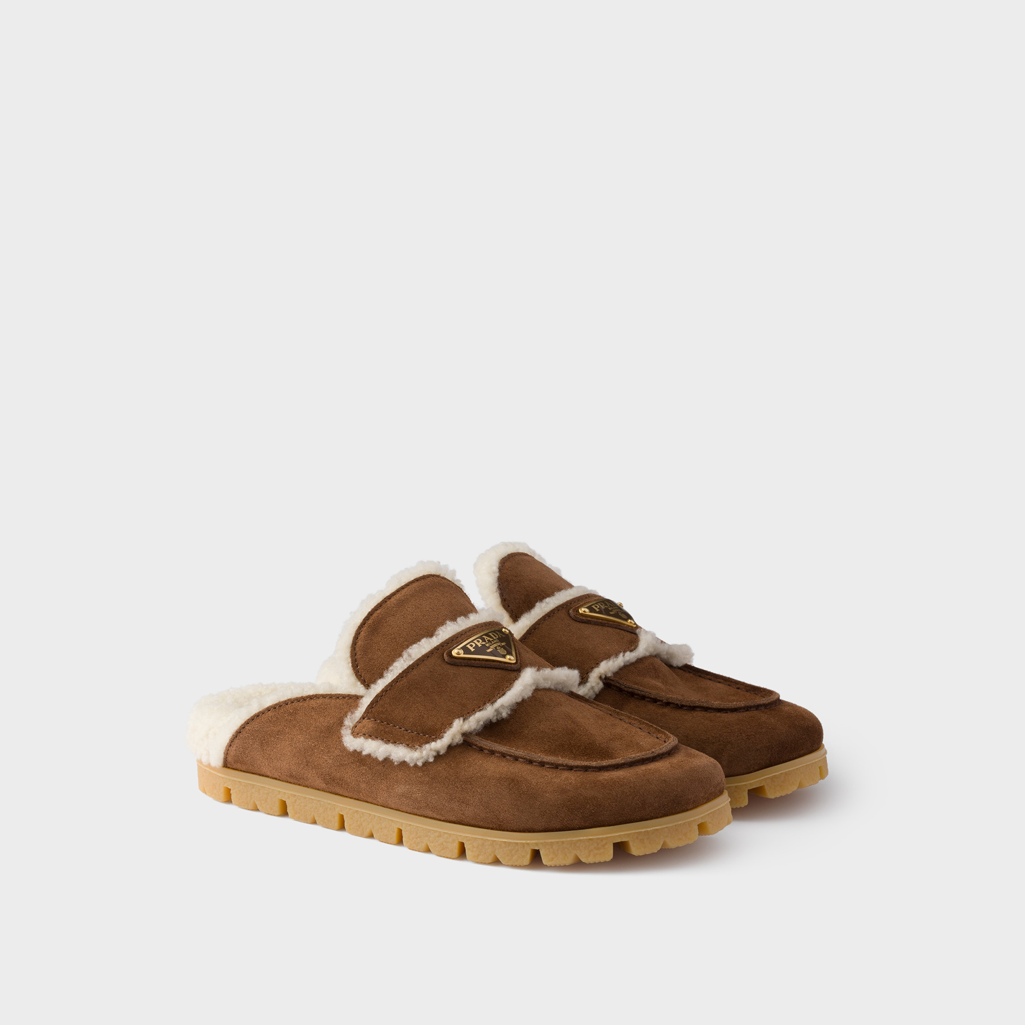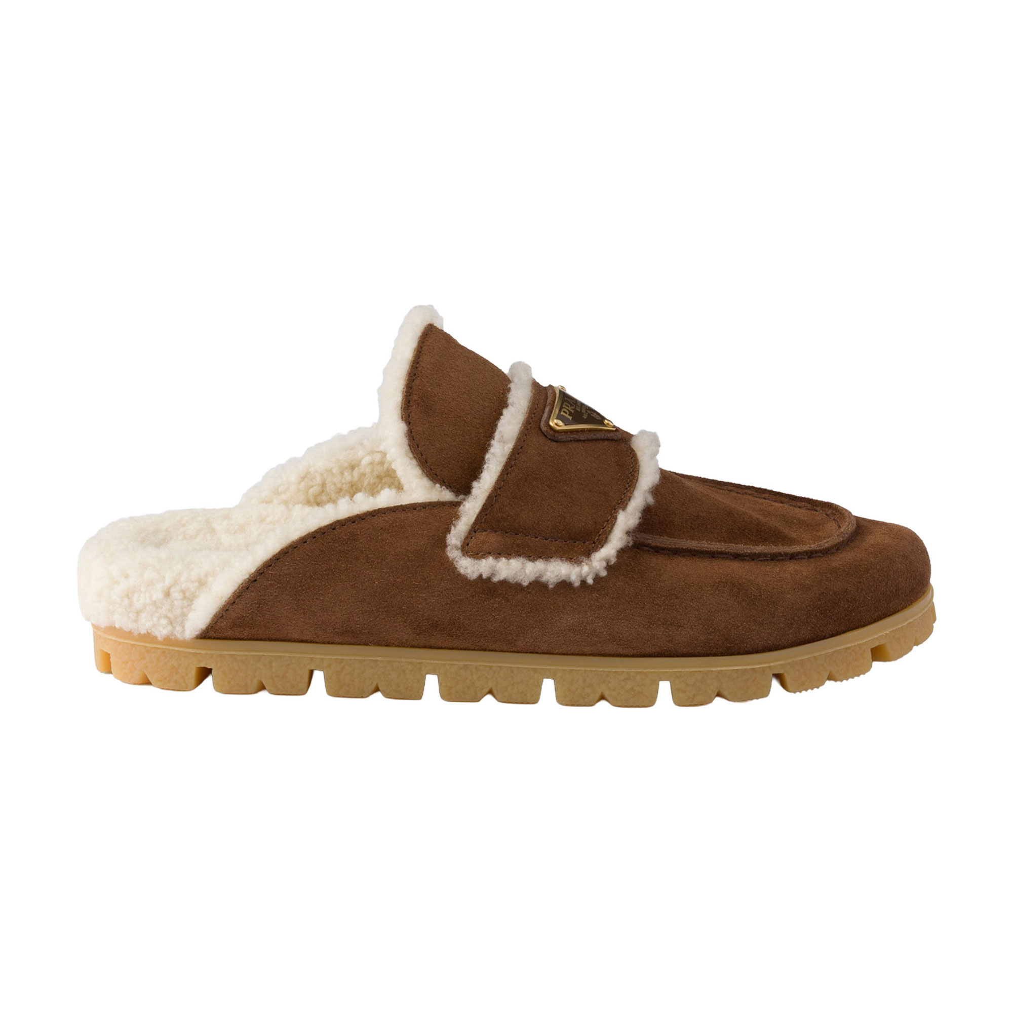 - Shearling lining, enamelled metal triangle logo, rubber lug tread sole