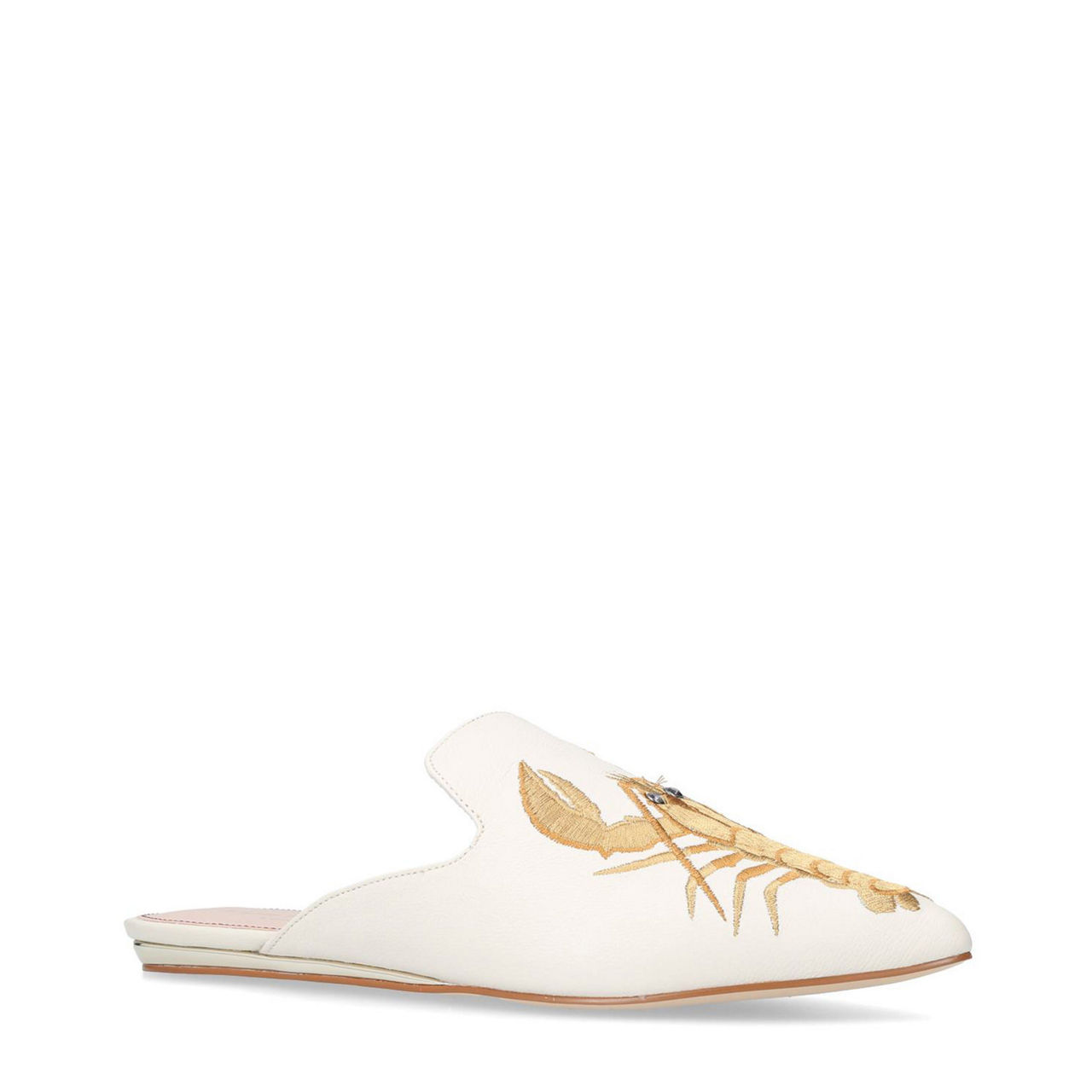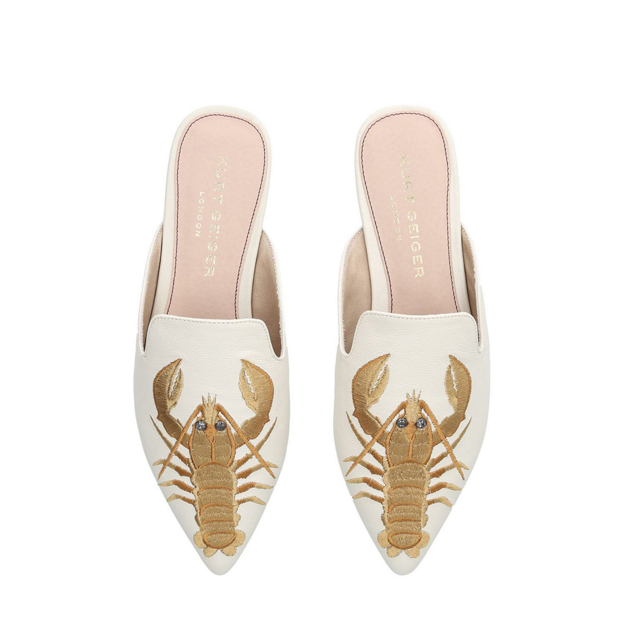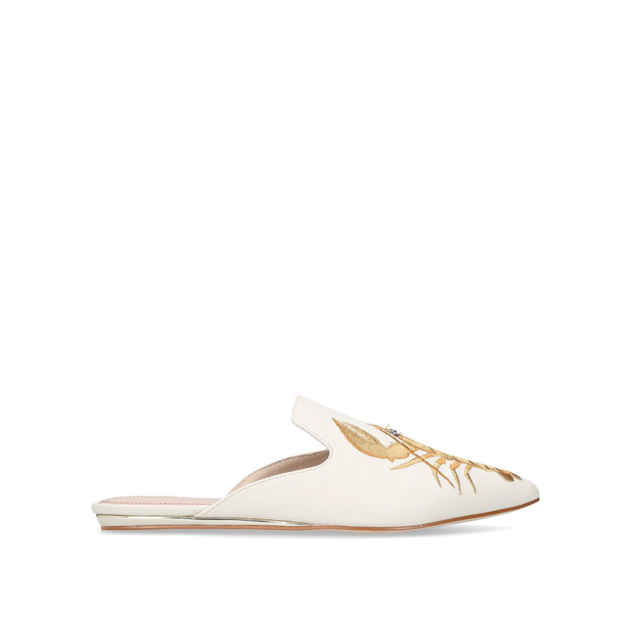 A pair of lavish slides will accompany you from day-to-night throughout the summer season. Kurt Geiger London's Otter works a sleek profile with flat sole, pointed toe and chalky white leather vamp. Garnished with golden lobster embroidery, these open heel shoes assert themselves as stylish statement of choice.