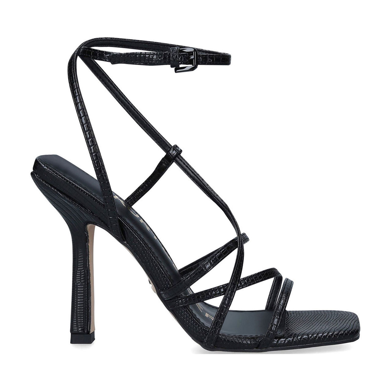 - Strappy sandal, squared toe, buckle fastening ankle strap, textured finish, stiletto heel