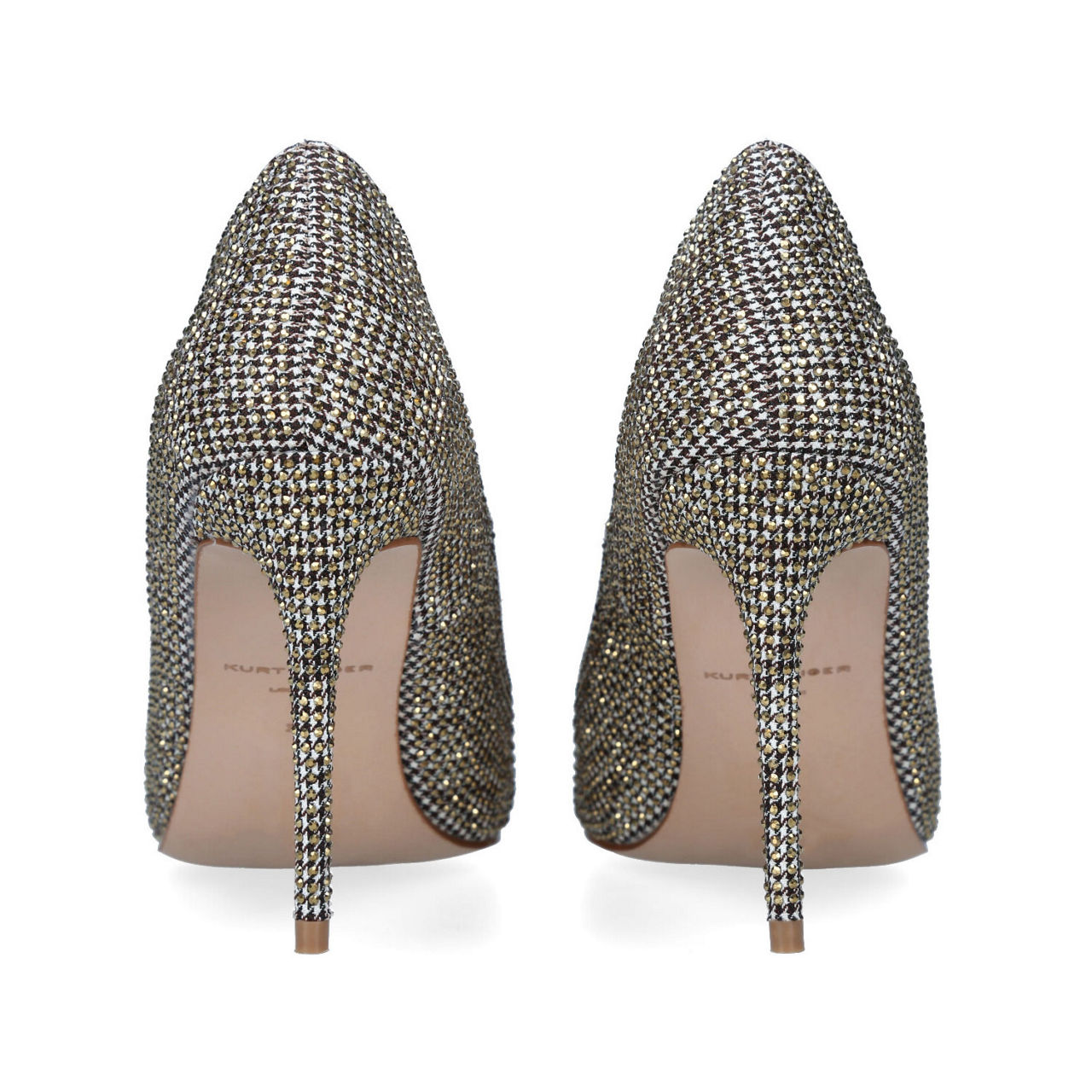 The Belgravia court heel features a beige fabric in houndstooth design topped with gold crystals. The stiletto heel sits across from the pointed toe.