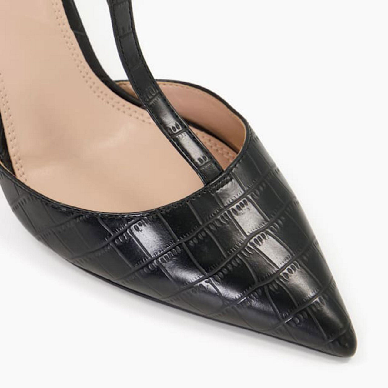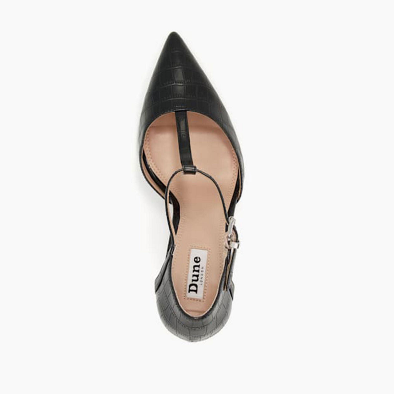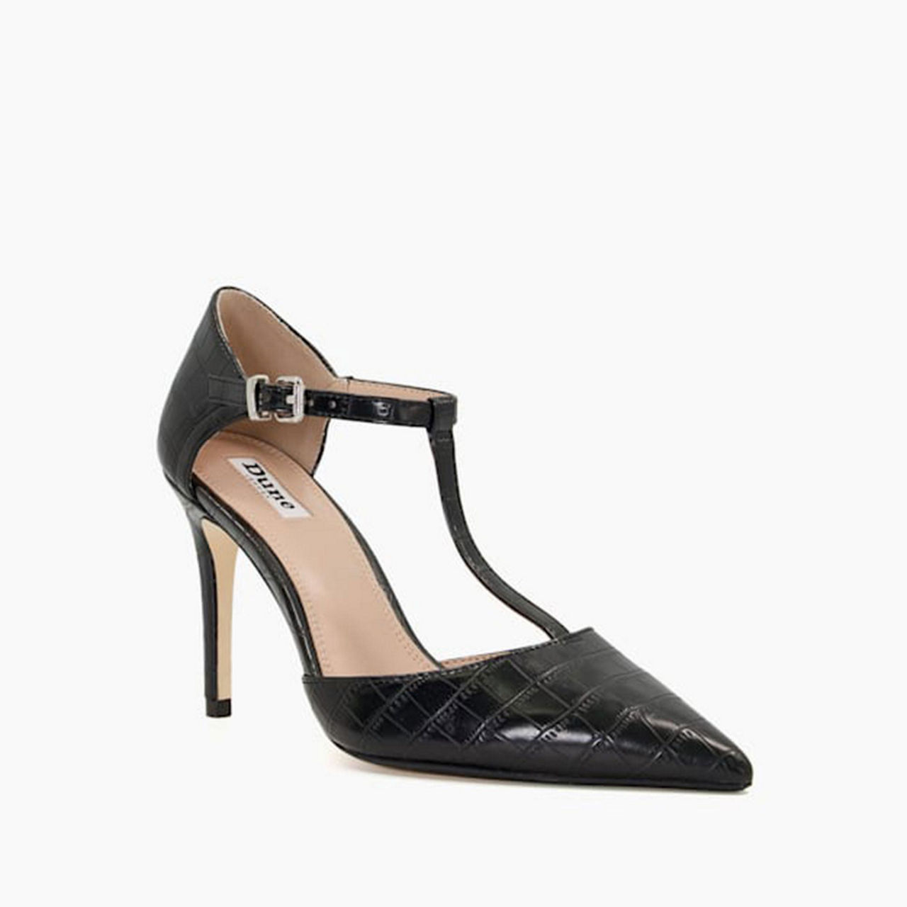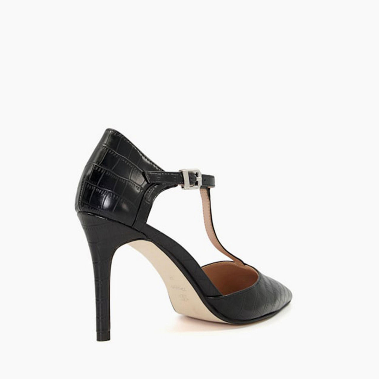 - Pointed toe, stiletto heel, T-bar strap, adjustable ankle strap, faux croc effect