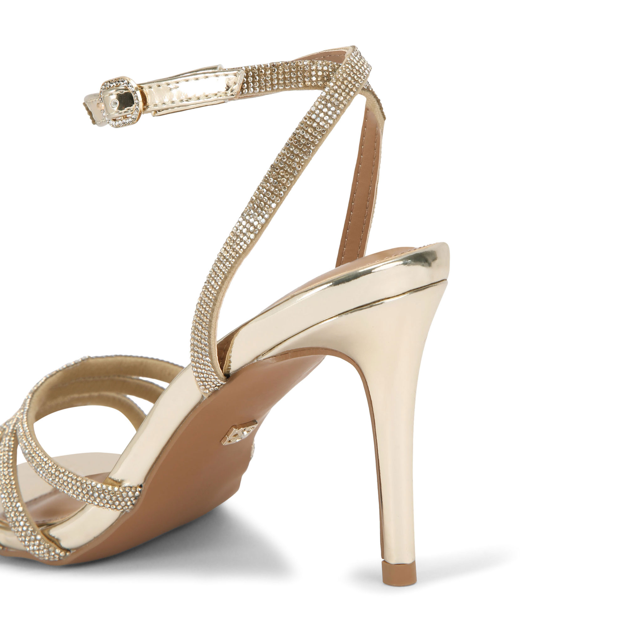 - Gold straps across the upper, small gold-tone buckle fastening on the ankle straps, heeled