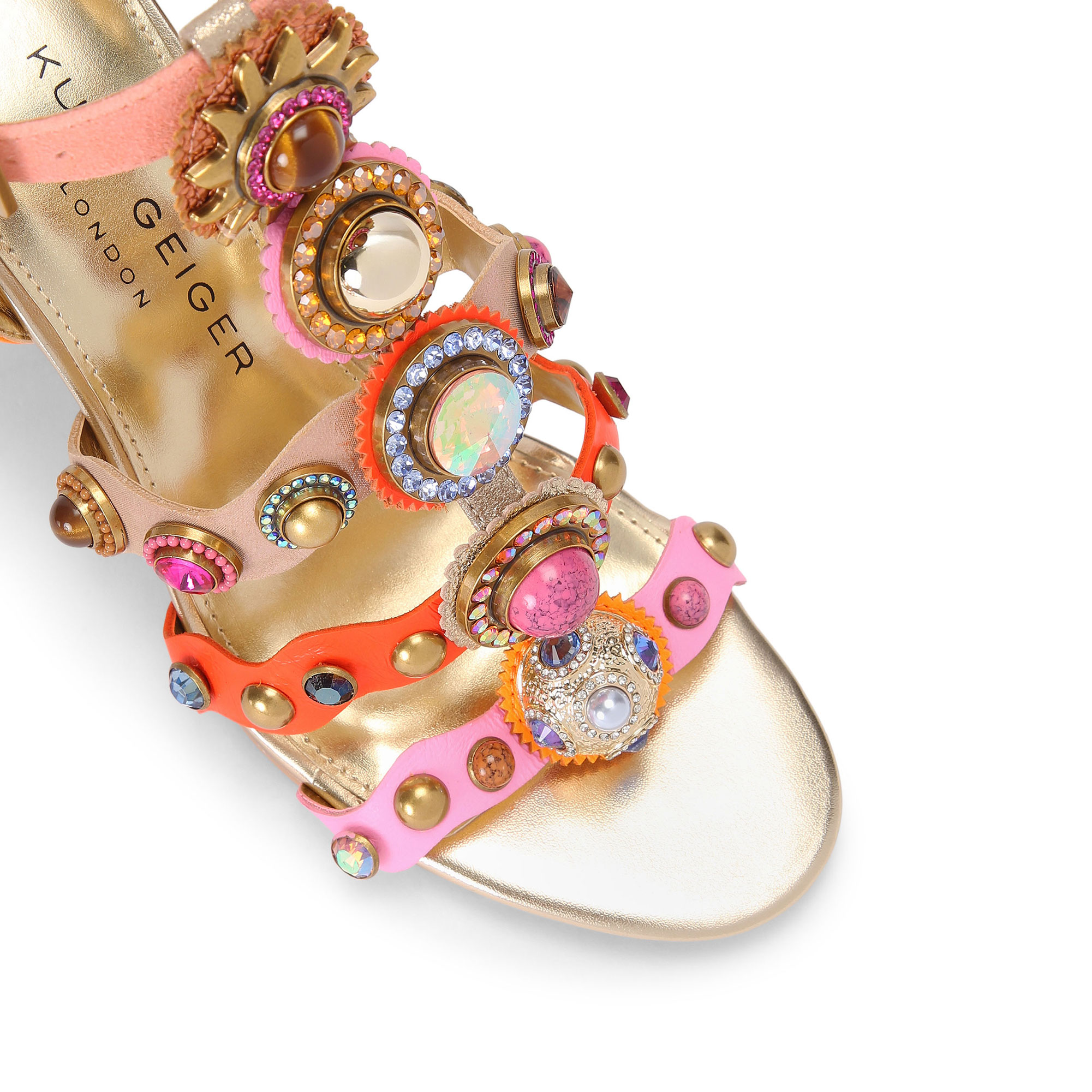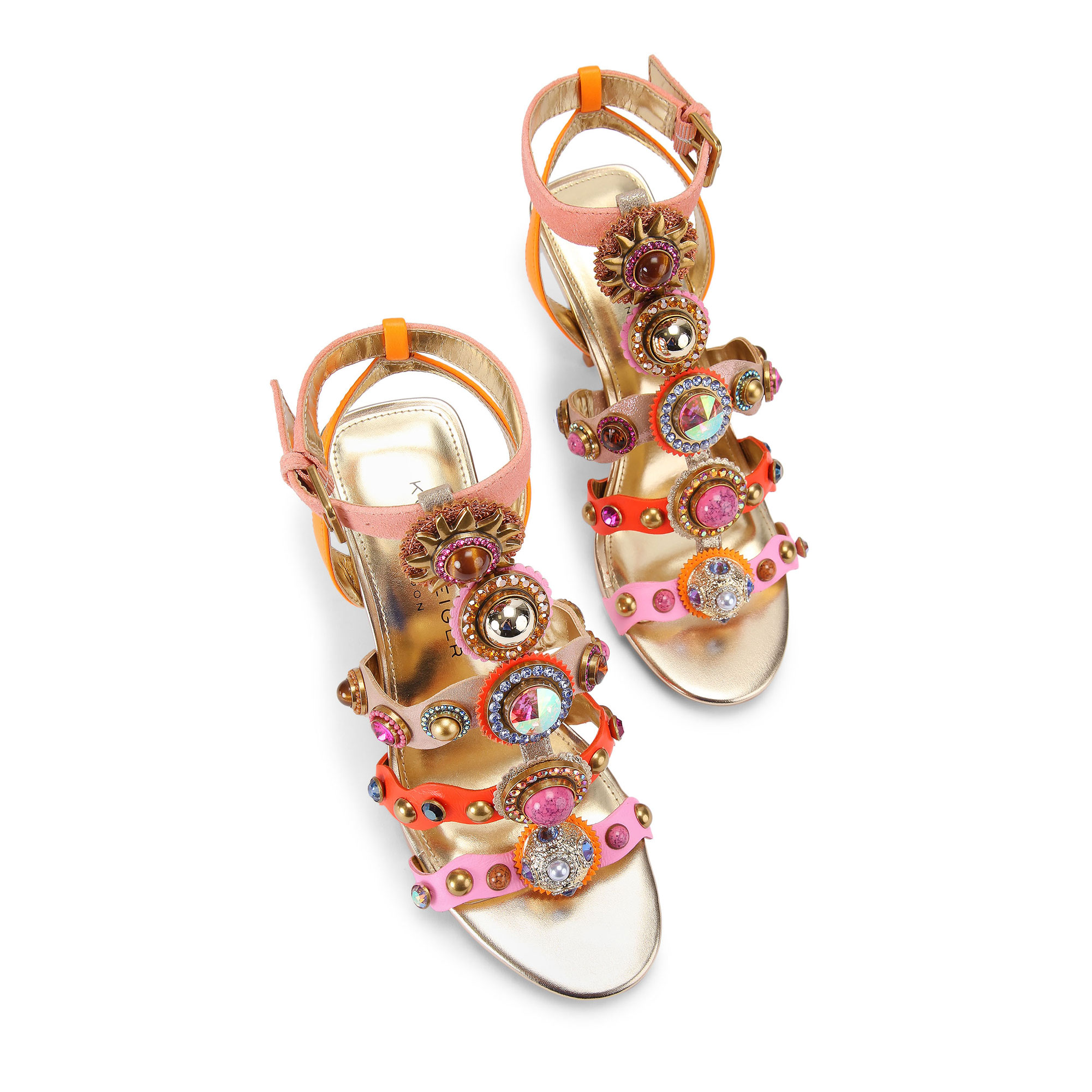 • High gladiator heel design, multi-colour upper, large stone and crystal embellishment, antiqued brass buckle fastening