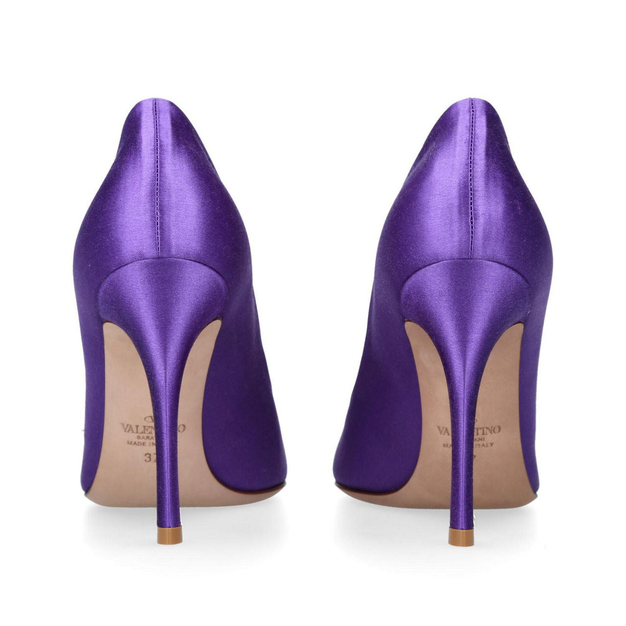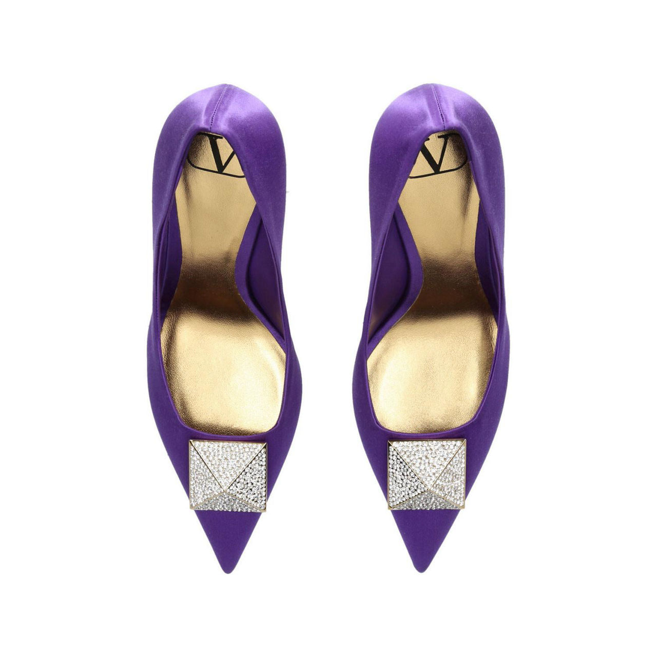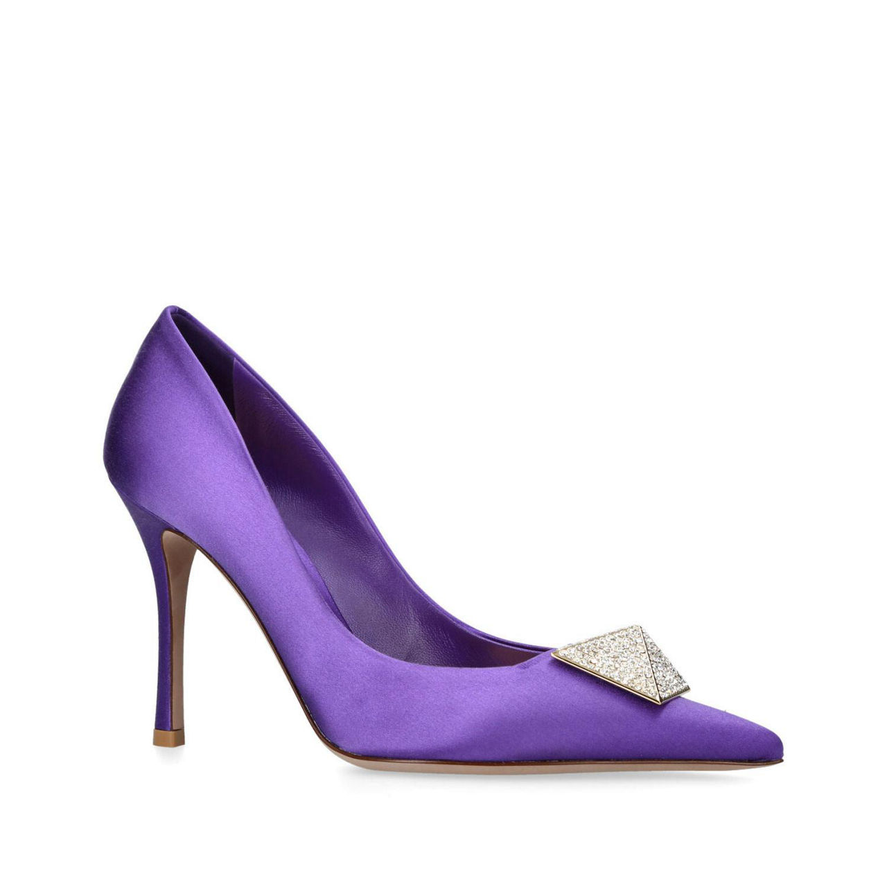 - Satin fabric, point toe, stiletto heel, oversized Rockstud detail, stone embellishment