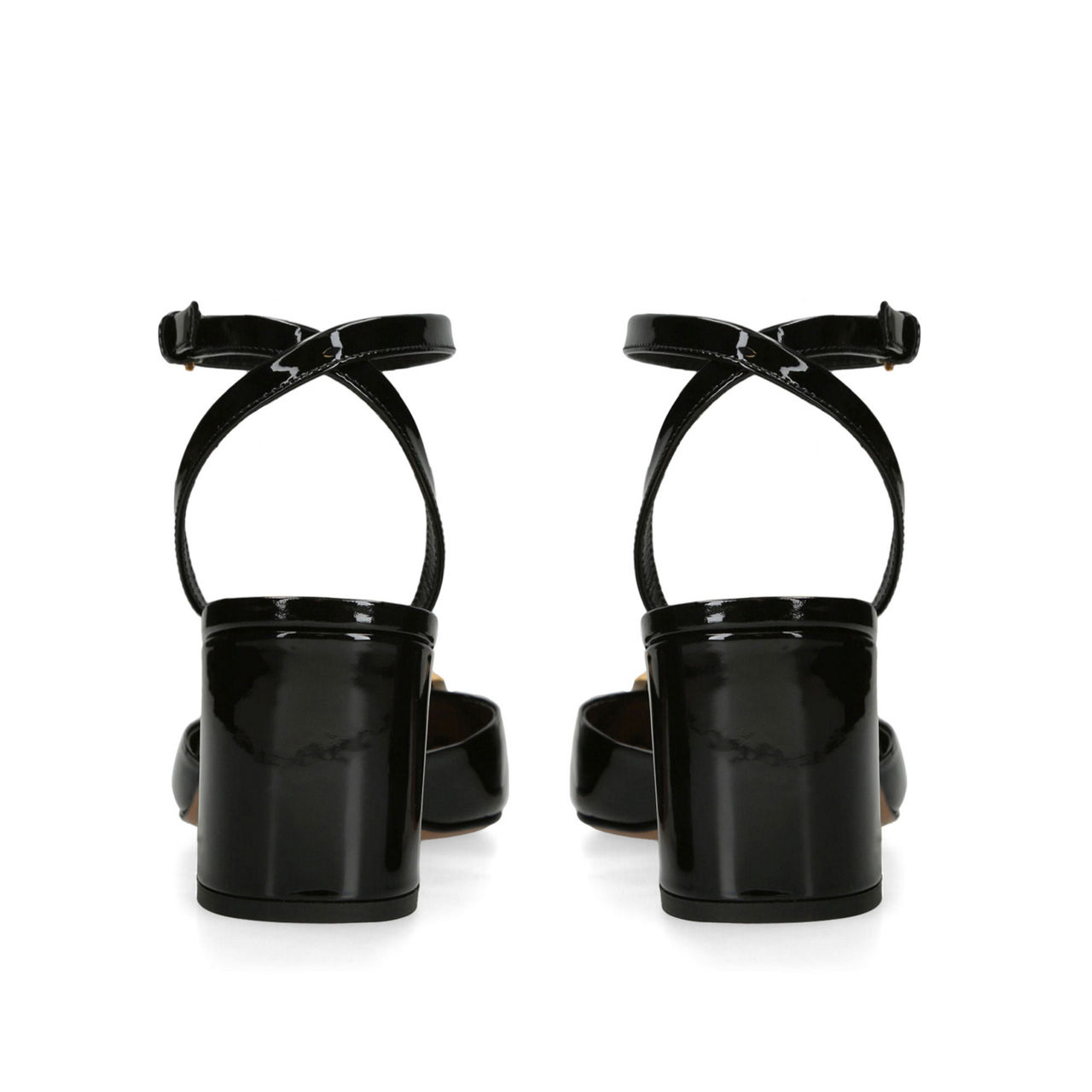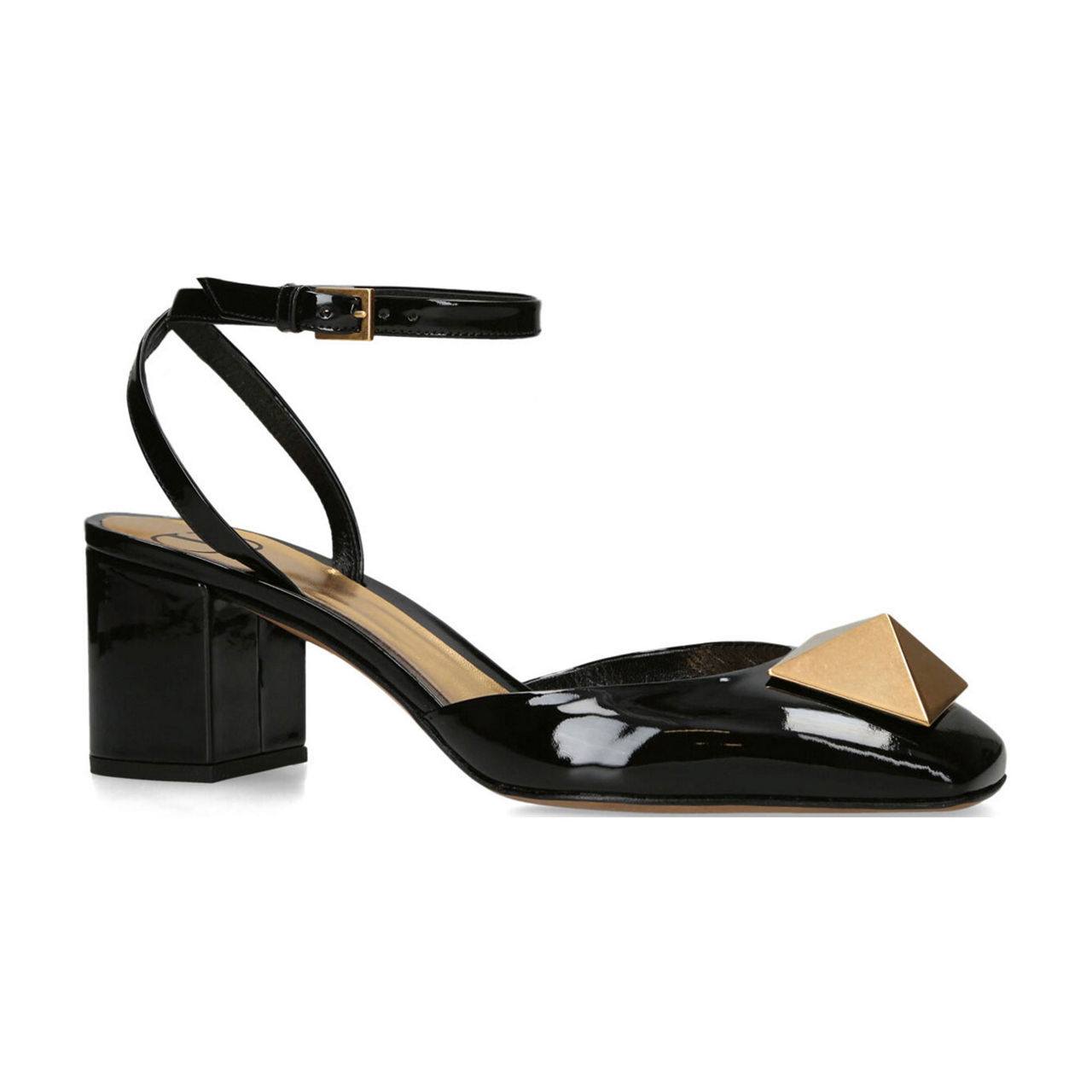 - Squared toe, adjustable ankle strap, block heel, gold-tone stud detailing, glossy patent finish
