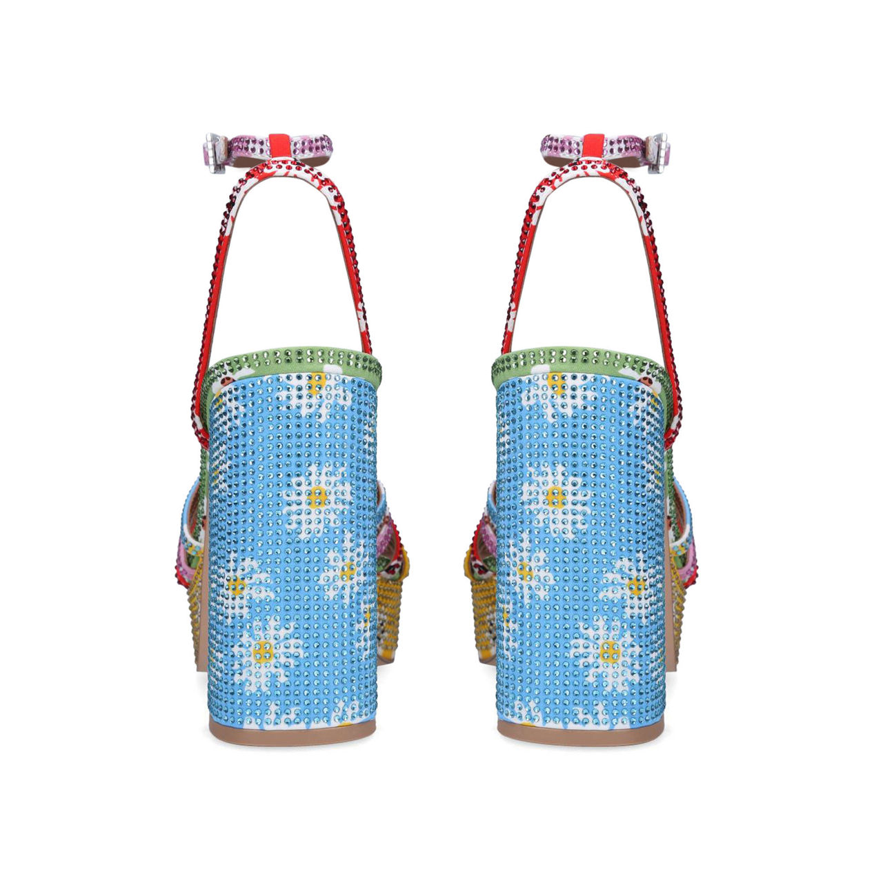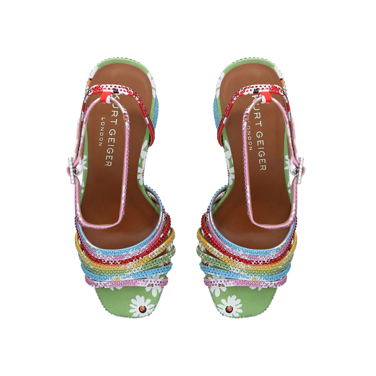 Kurt Geiger London's Pierra styles are full of colourful fun for a party-filled summer. This pair of platform sandals works a strappy design in floral print fabric, given a full luxe treatment with all-over gem embellishments. Slip on the retro-inspired design with your favourite party outfit for maximum glamour.