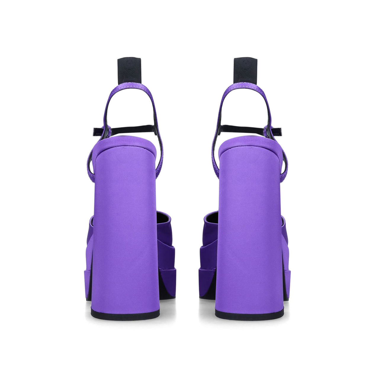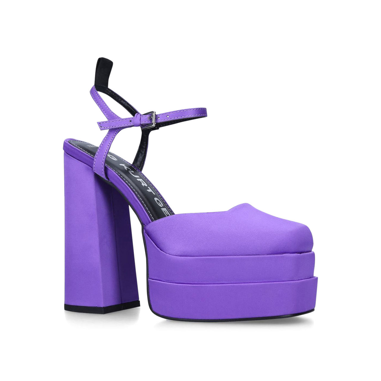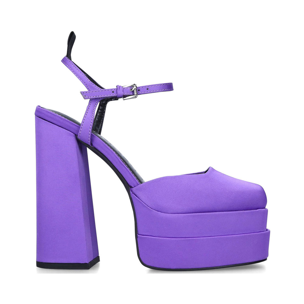 - Stacked platform sole, closed square toe, ankle strap fastening, branded pull tab, satin.