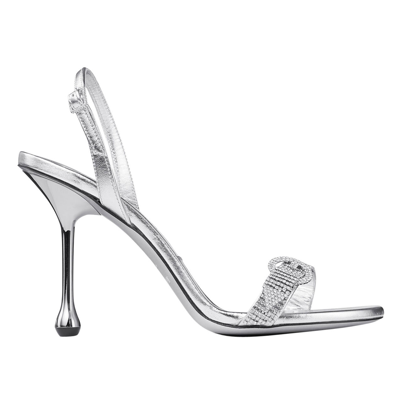 • Drop stiletto heel, round open toe, embellished toe strap with buckle detail, adjustable ankle strap with embellished buckle fastening, metallic finish