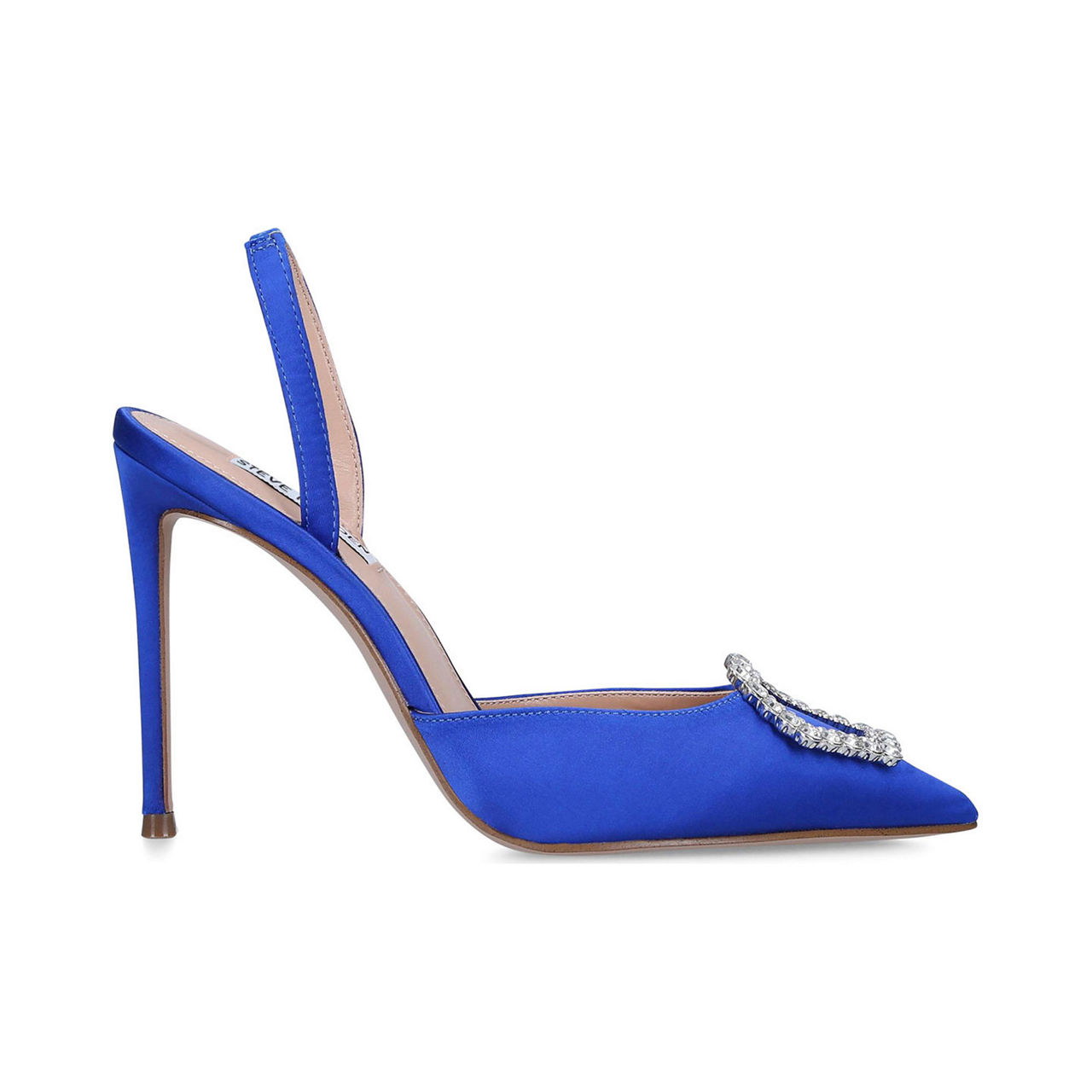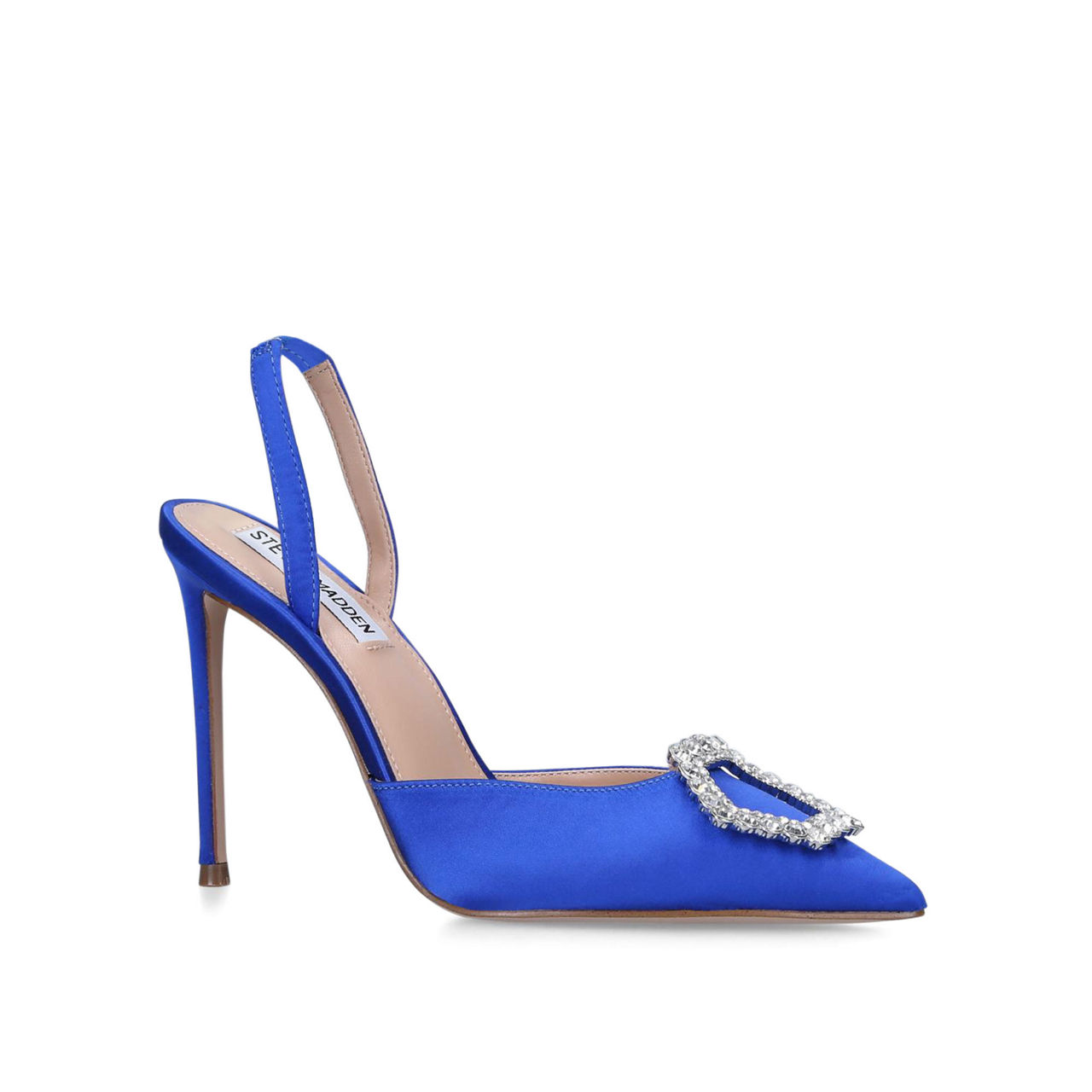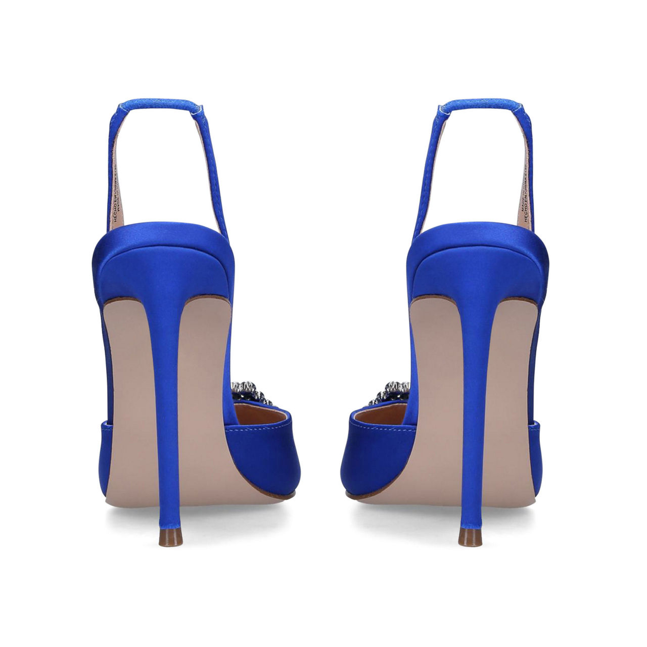 • Stiletto heel, pointed toe, embellished buckle detail, elasticated heel strap.