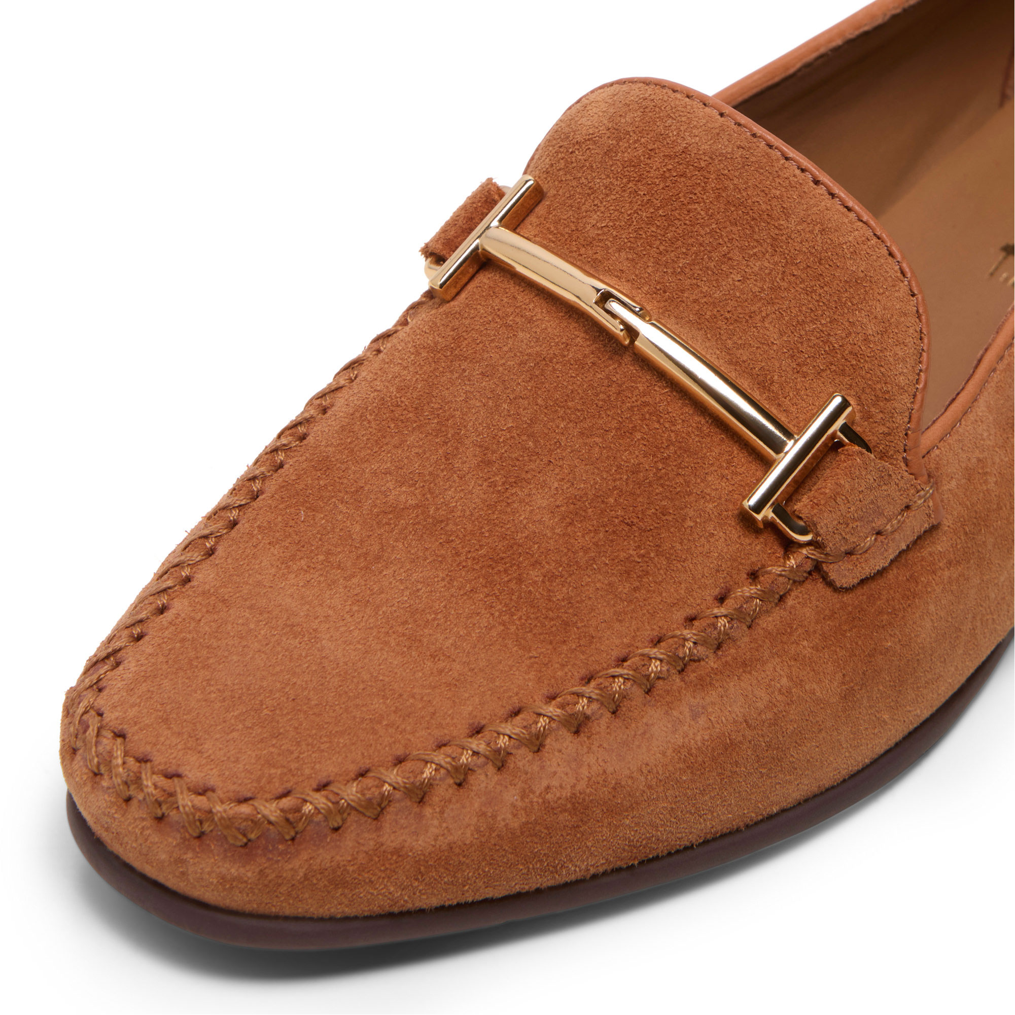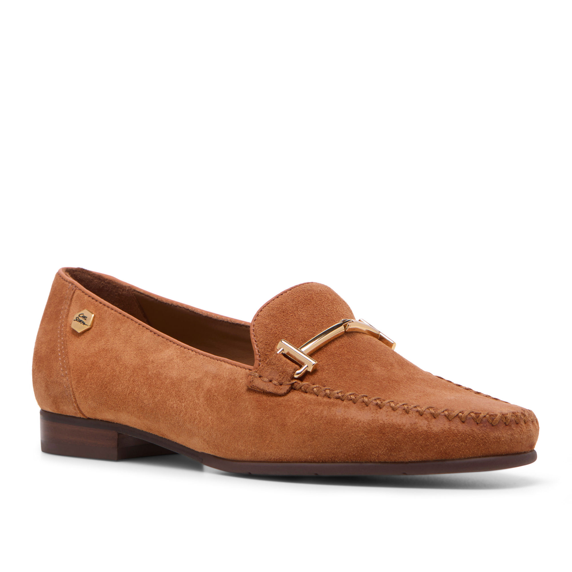 • Moccasin silhouette, polished metal hardware, low-profile sole, smooth leather upper, horsebit detail, slip-on design, low stacked heel, leather-lined interior, cushioned footbed, durable rubber outsole