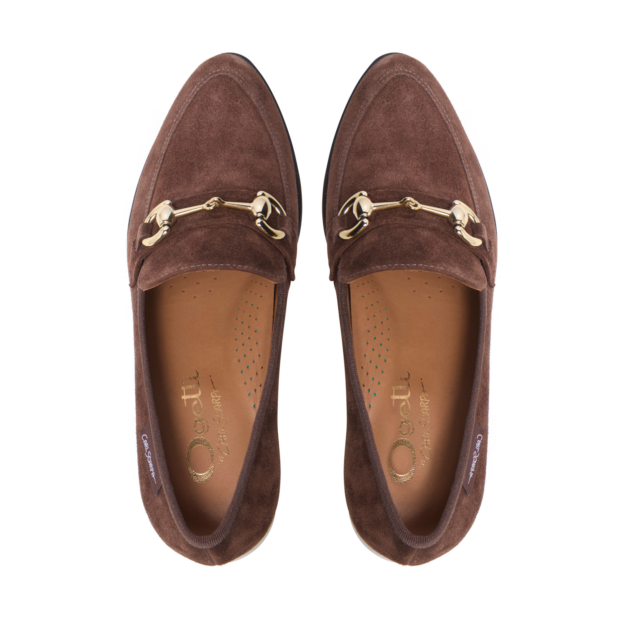 - Elongated silhouette, stitching, polished metal hardware, soft suede upper, horsebit detail, slip-on design, low stacked heel, leather-lined interior, cushioned footbed, durable rubber outsole