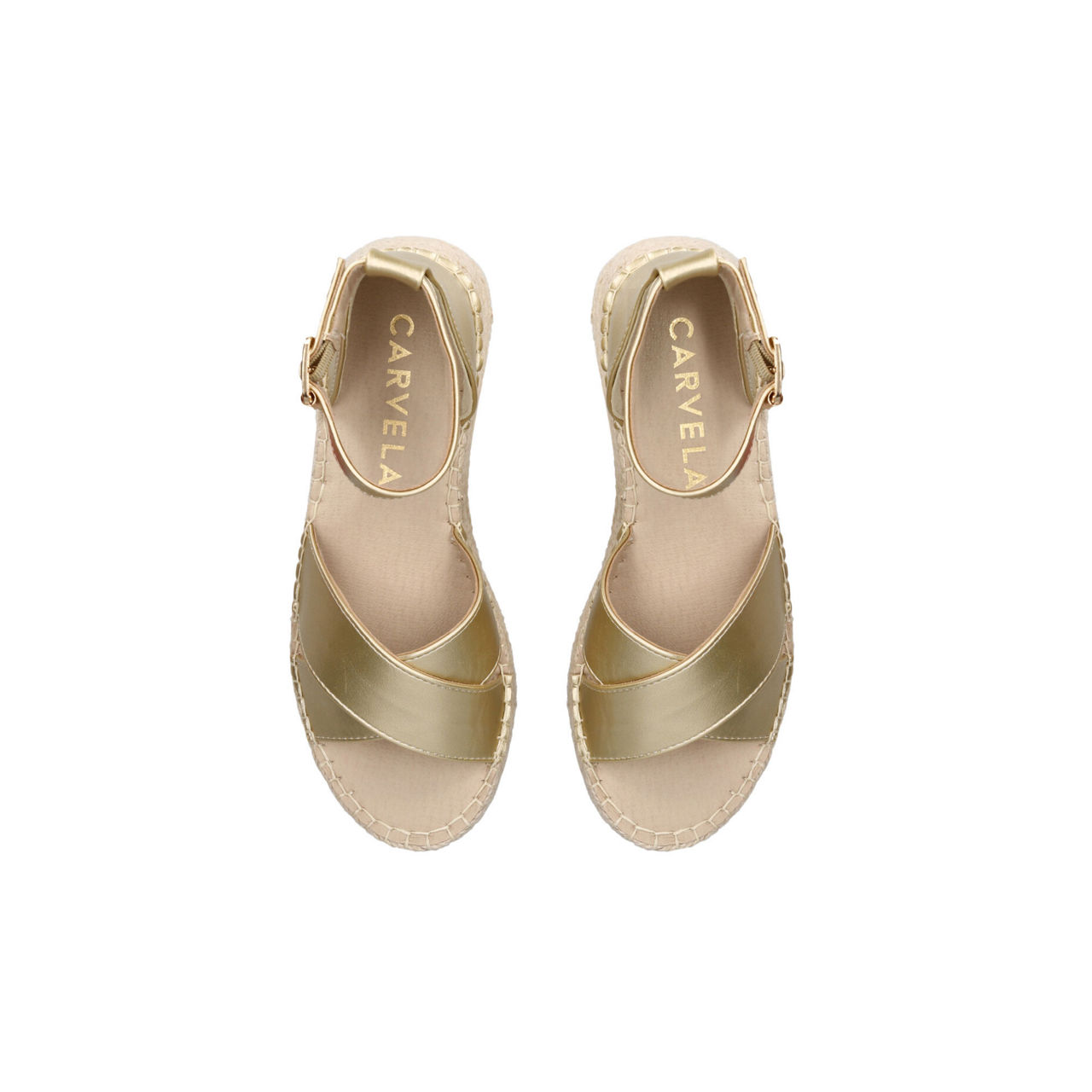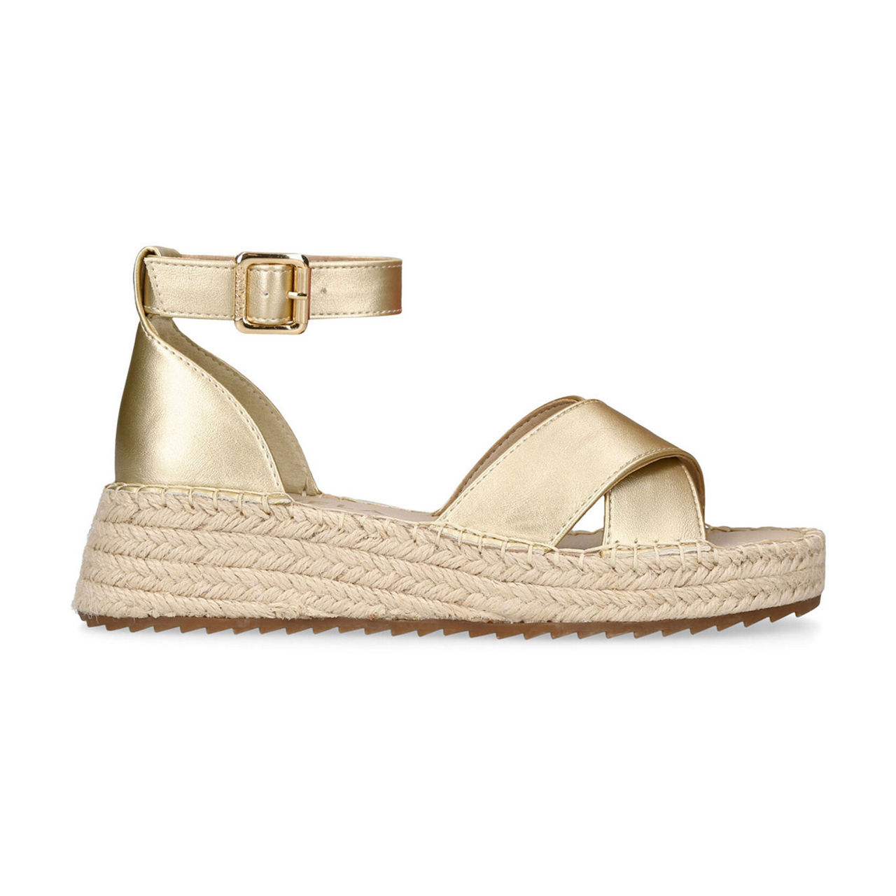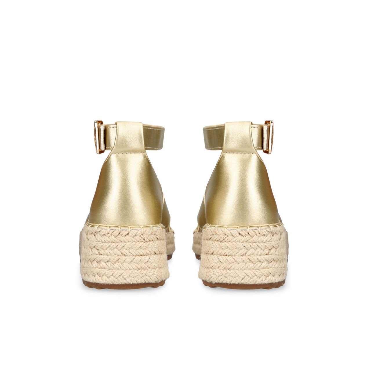 - Gold upper with crossed straps at the toe, buckled ankle strap, espadrille sole