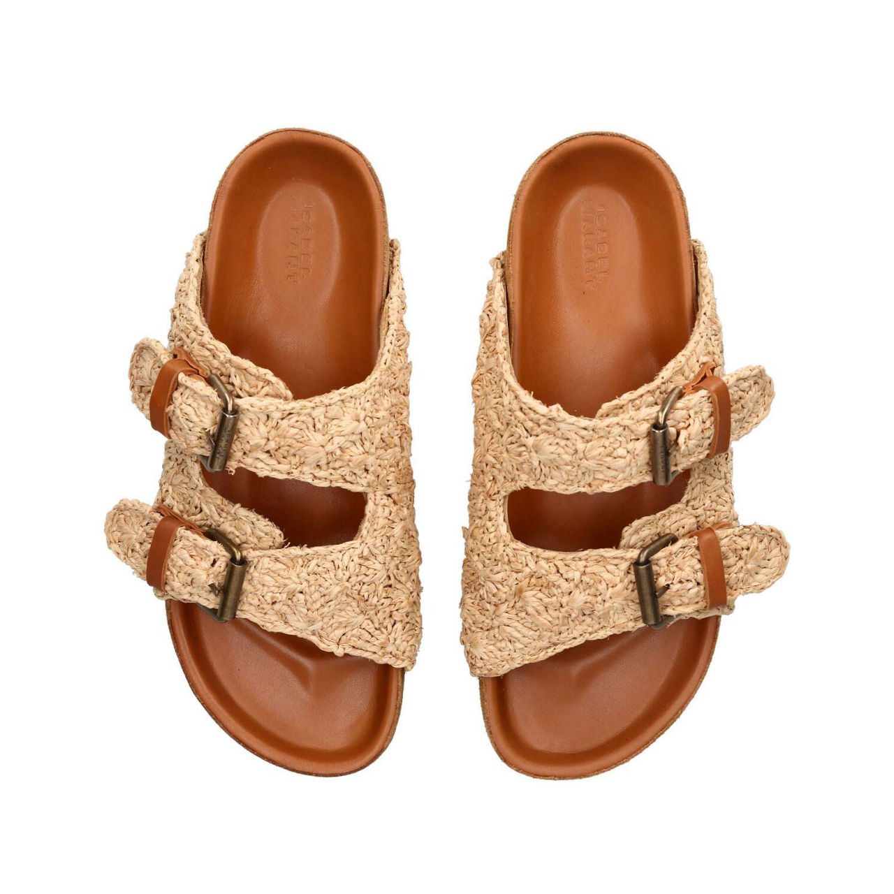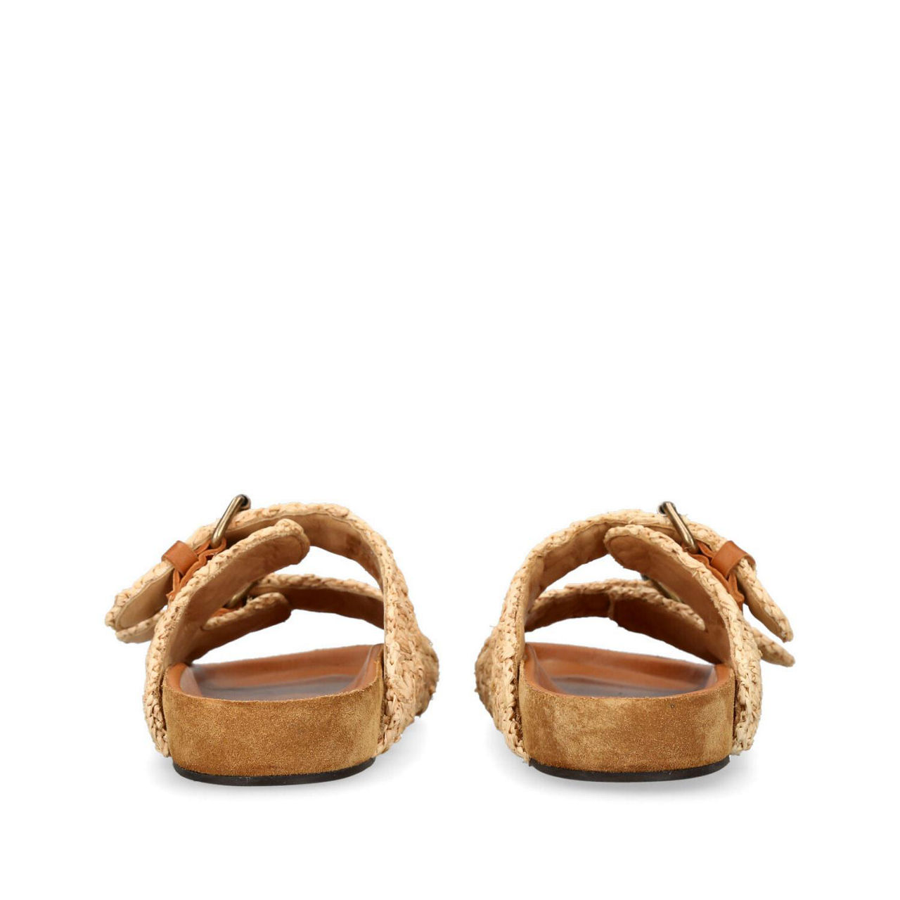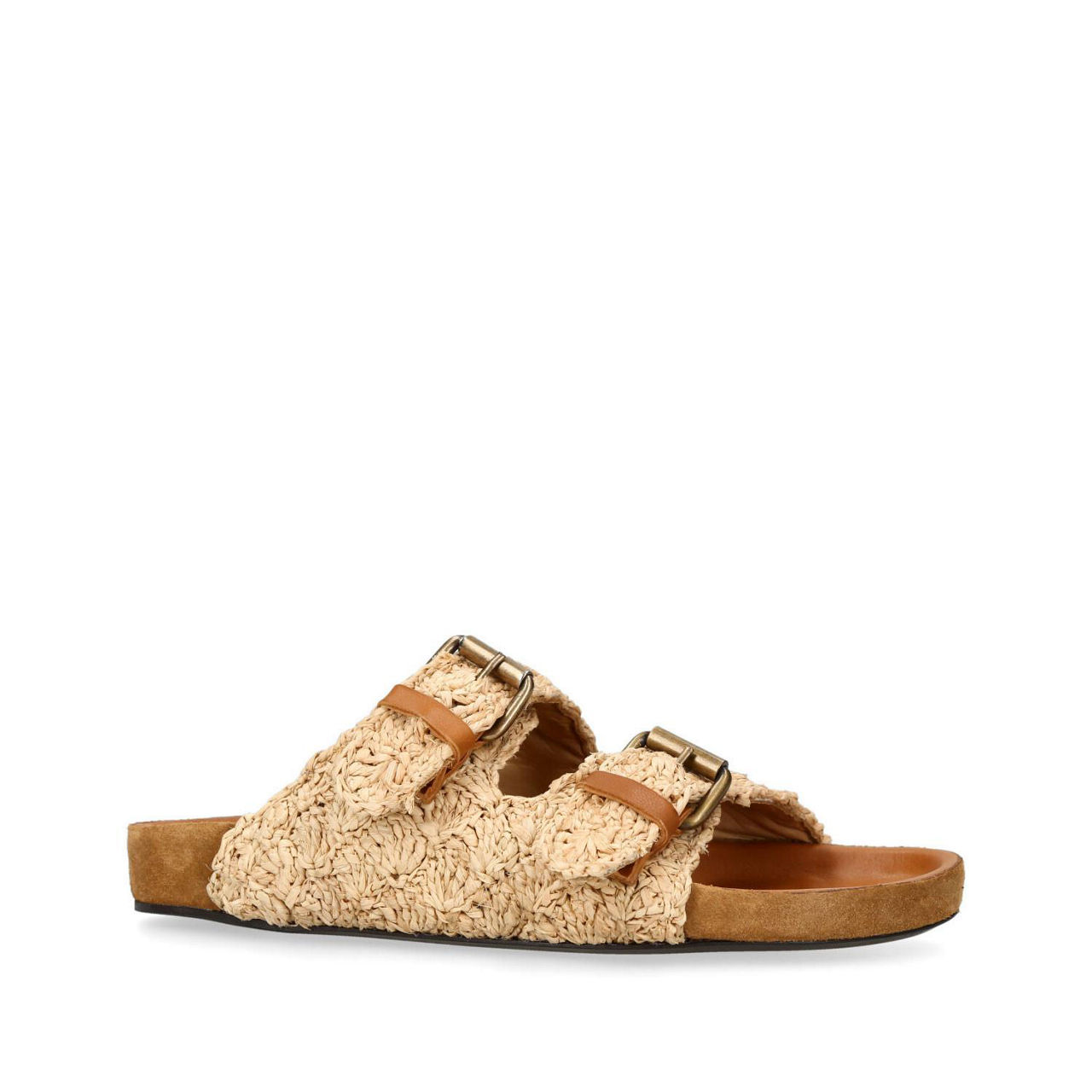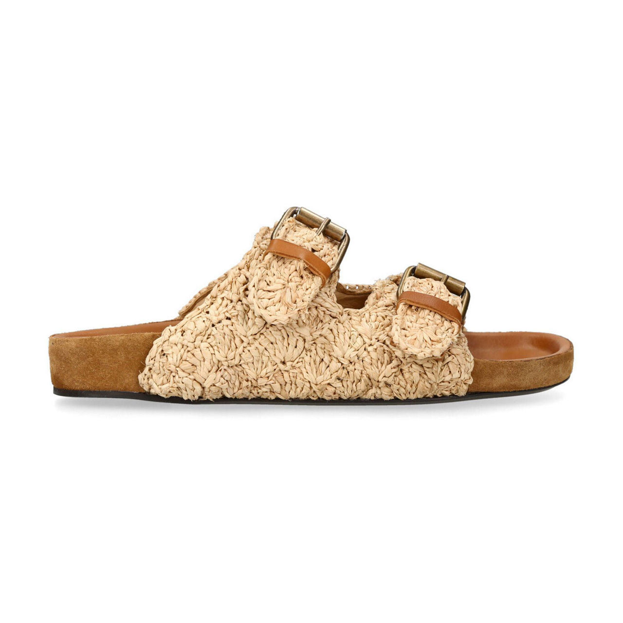 - Raffia upper, double buckle detail, slip-on style, molded footbed