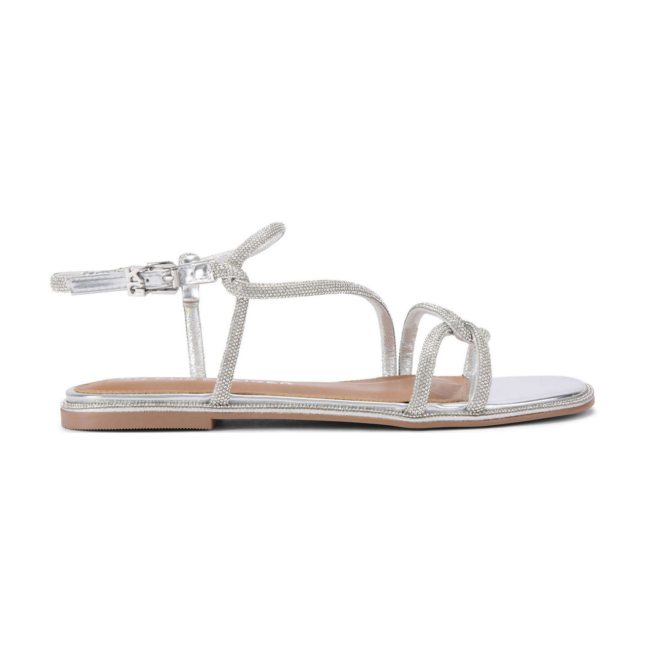 - Strappy upper, crystal embellishment, silver-tone branded buckle, ankle strap