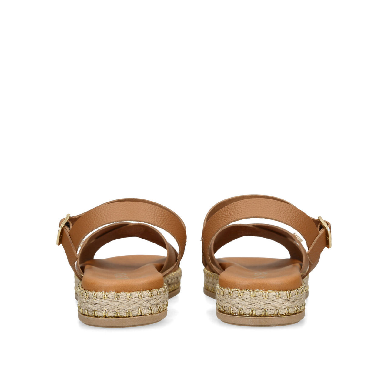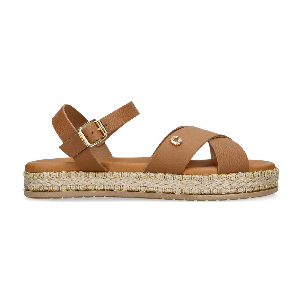 - Flat sole with rope detailing, ankle strap with gold-tone branded buckle fastening, cross-over foot strap, Icon C stud, open toe