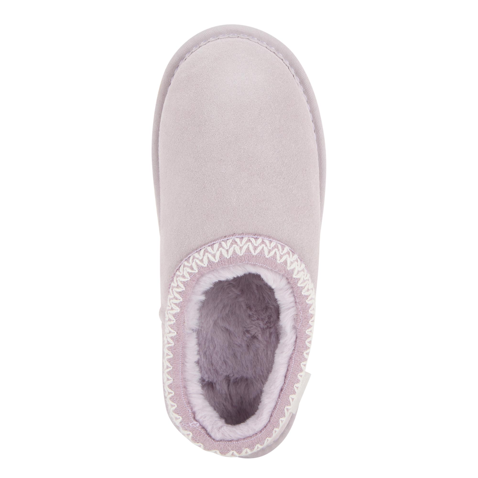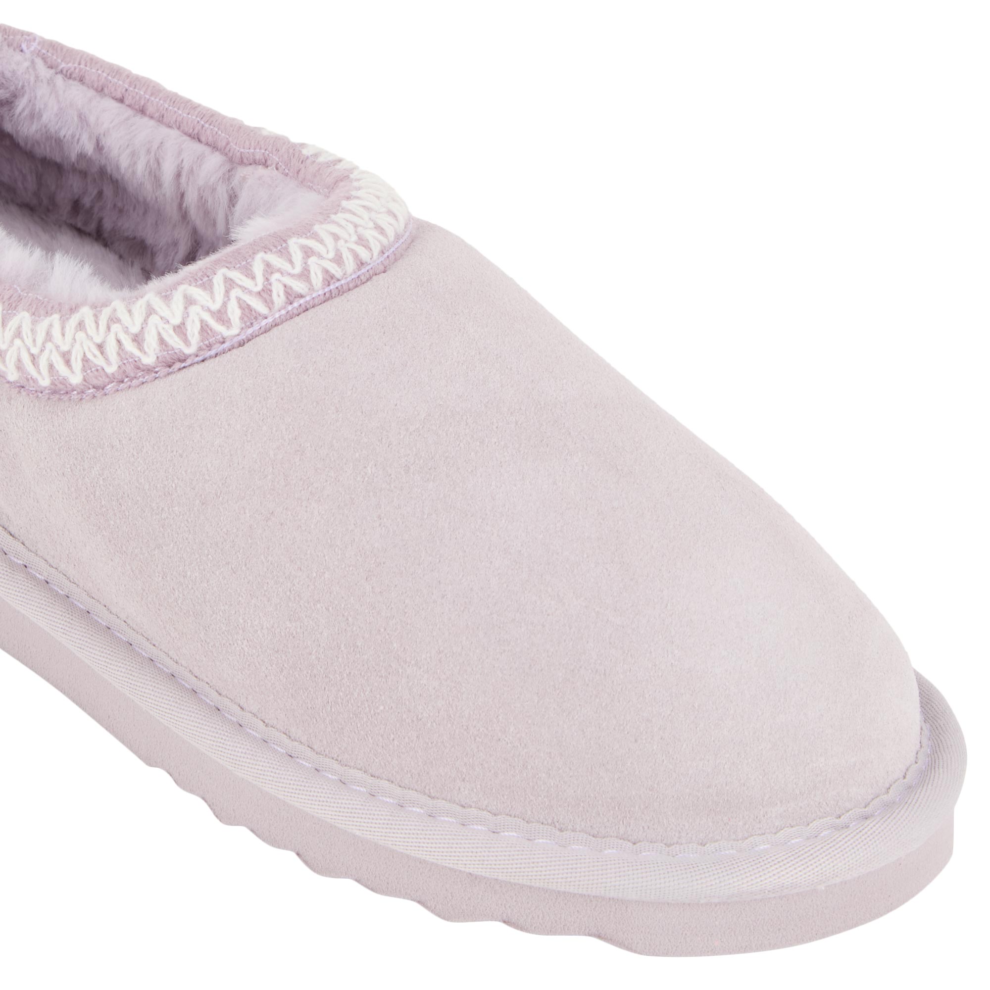 - Slip-on style, faux fur lining, embroidered detailing, memory foam, durable EVA sole, suede finish