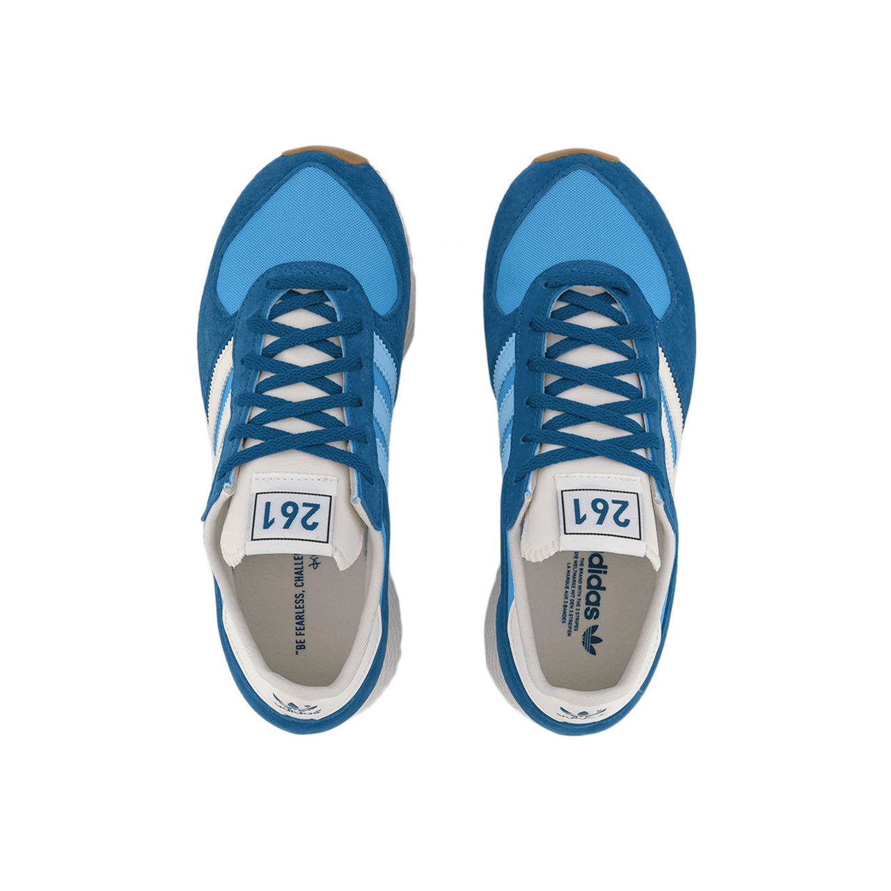 - Round toe, low-top, lace-up fastening, padded collar, signature three stripe detail, foil branding detail, logo badge, contrast thick sole, suede upper