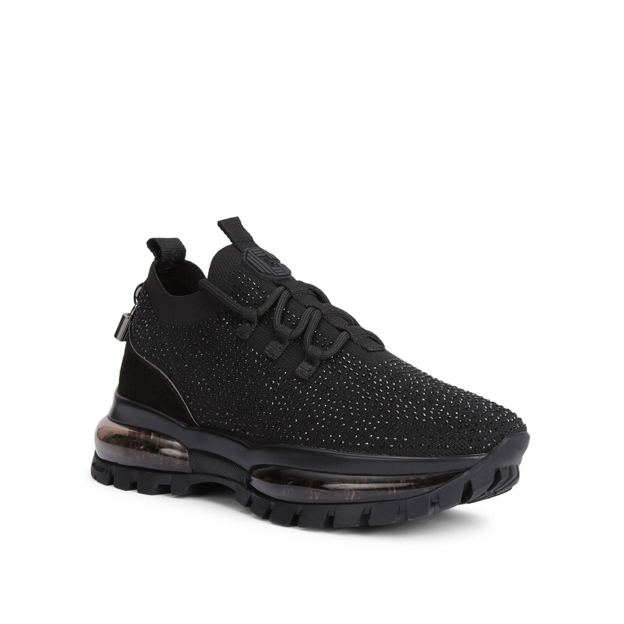 - Knit textile upper, jewel embellishment, laces, chunky sole with clear bubble details, cleated, metallic lock charm to ankle, branding.