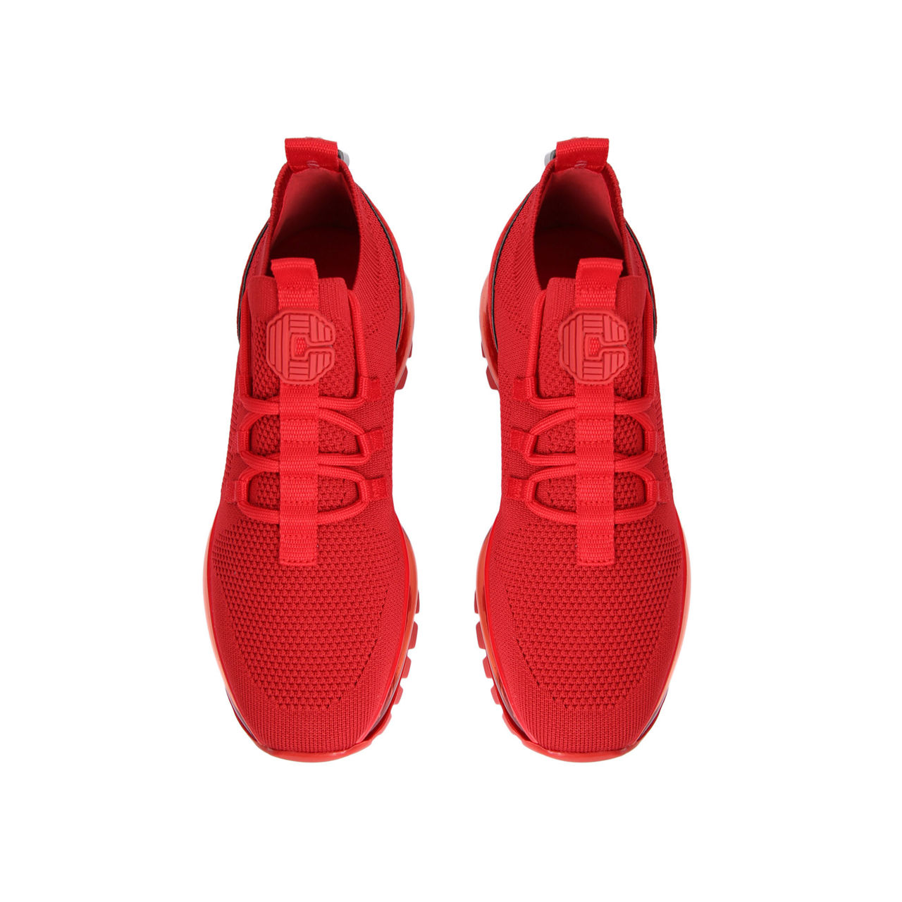 - Knit textile upper, laces, chunky sole with clear bubble details, cleated, metallic lock charm to ankle, branding.