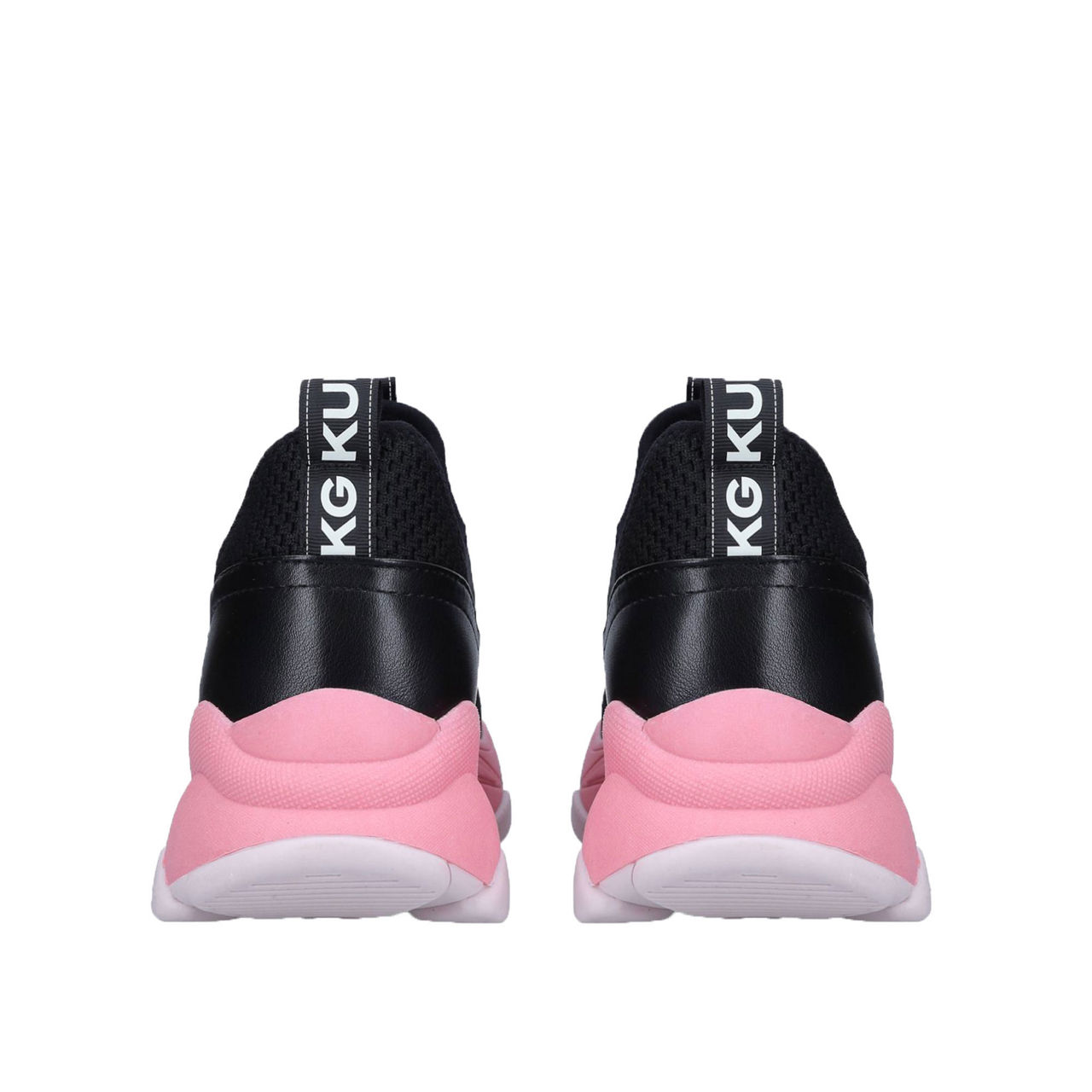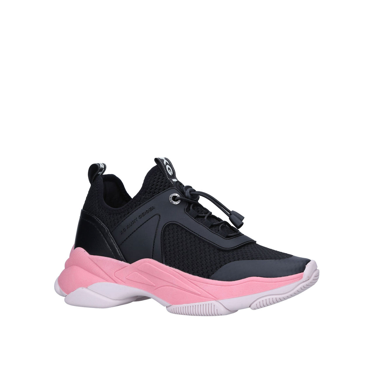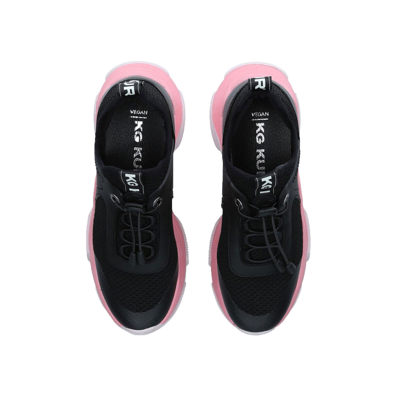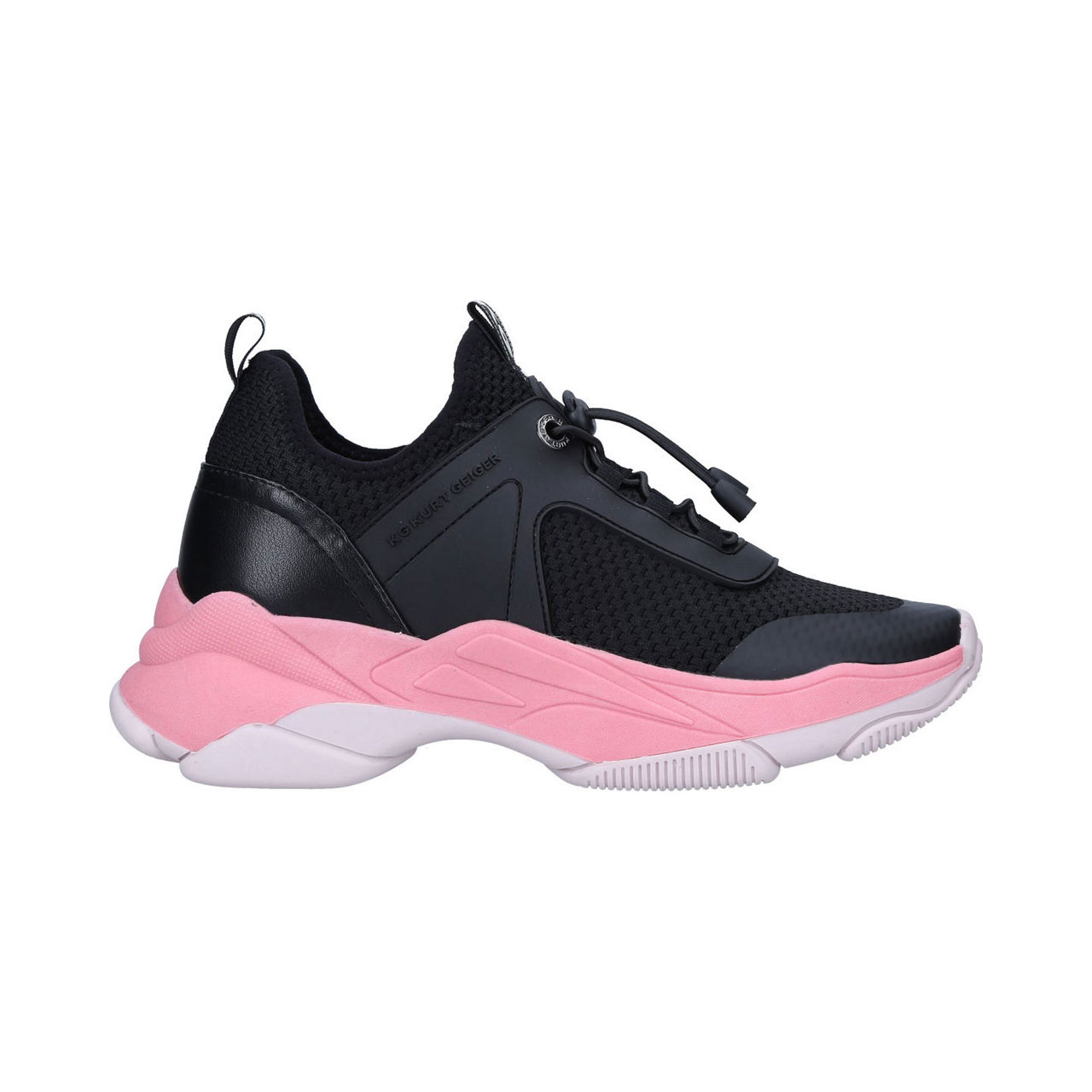 A blend of smooth panels and knit fabric creates an array of textures across KG by Kurt Geiger's Vegan Leighton style. Working a modern look in a black colour palette with a statement pink sole, these lace-up trainers are reminiscent of sporty styles.