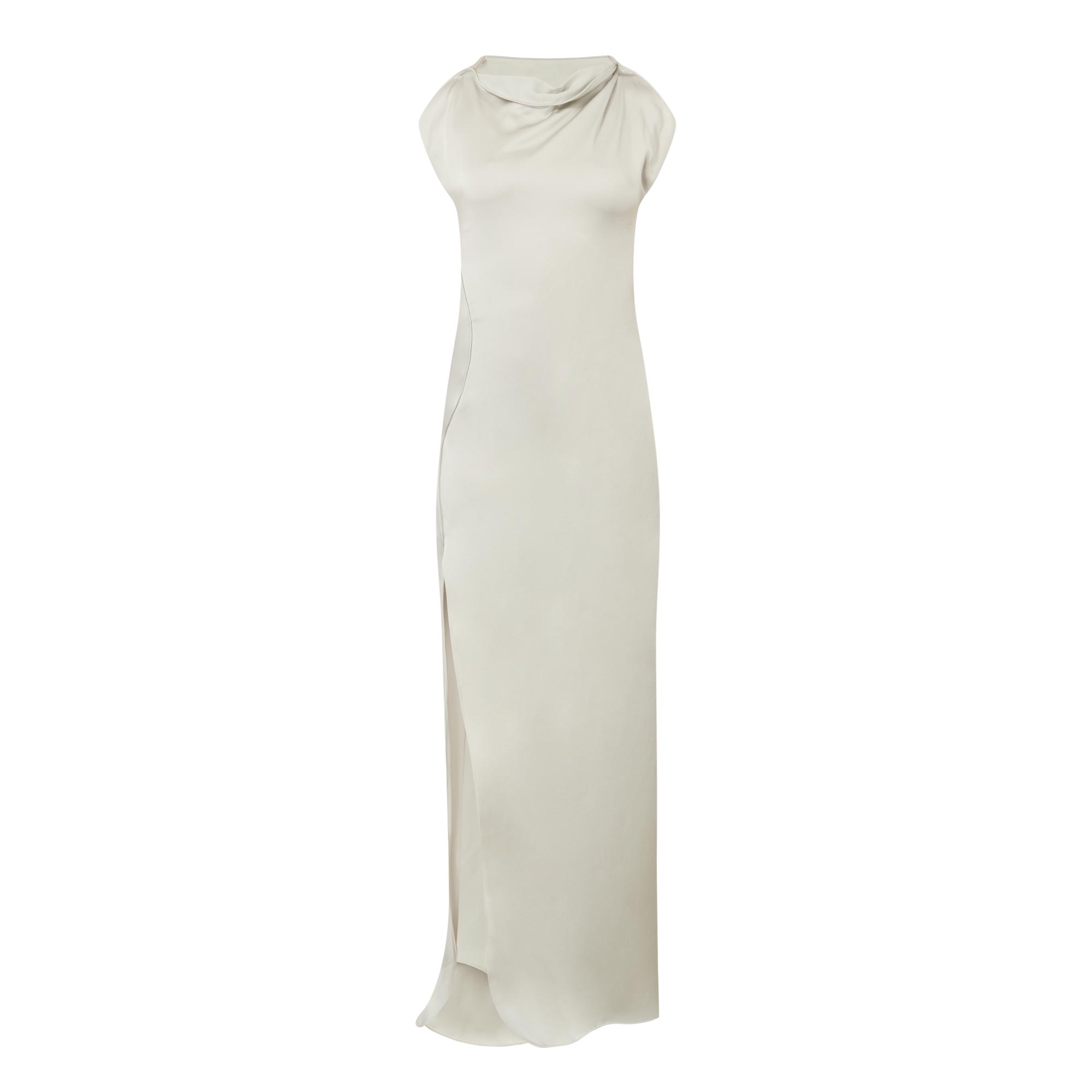 - Draped neckline, cap sleeves, fitted through the waist and hips, contoured seam detailing, side split, maxi length, smooth finish