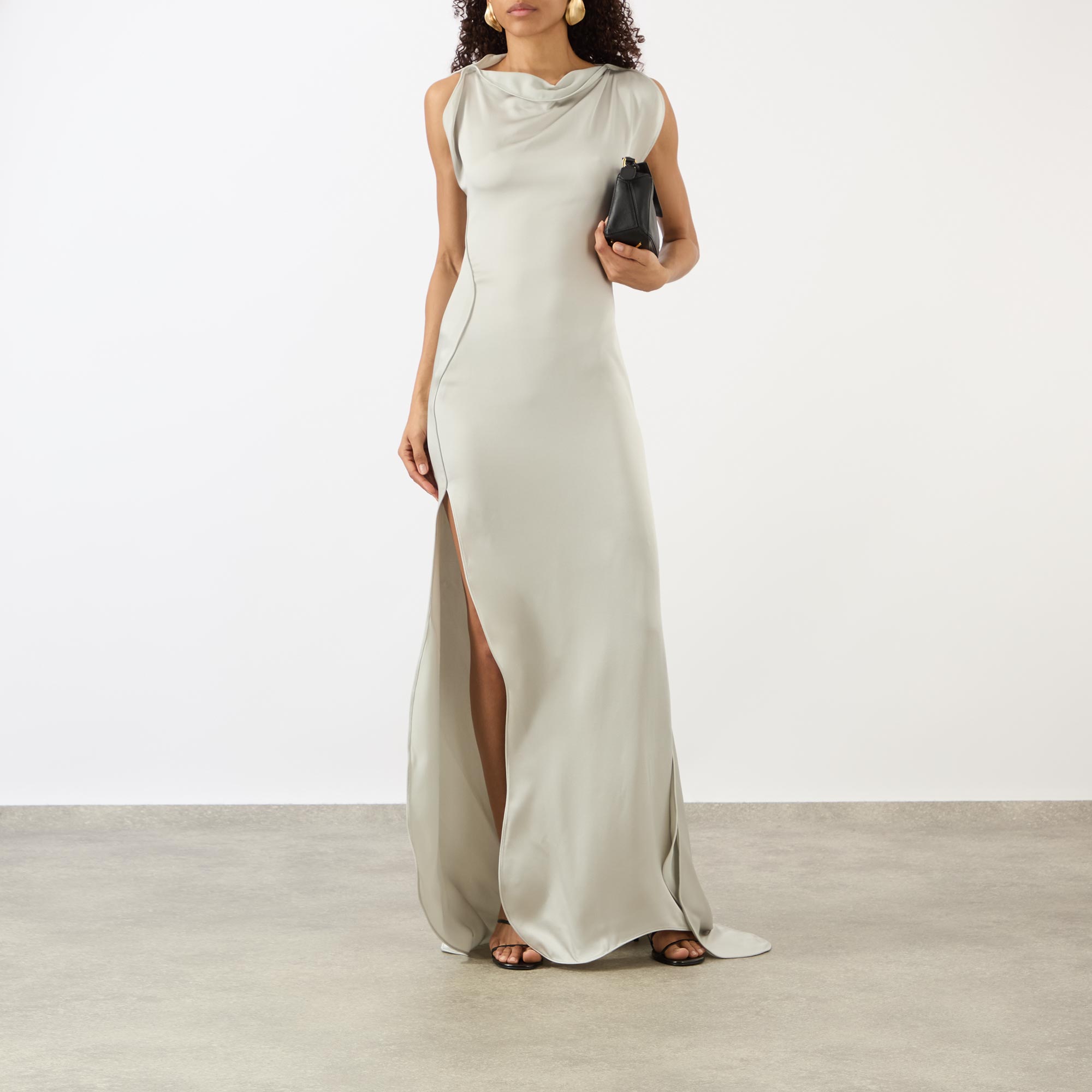 Deconstructed details and bias-cut silhouettes appear across the SS26 collection from Victoria Beckham, both of which can be seen in the design of this dress. It features a draped neckline and short cap sleeves, skimming the waist and hips before falling to a floor-sweeping asymmetric hemline and finished with a high side slit for a striking edit.