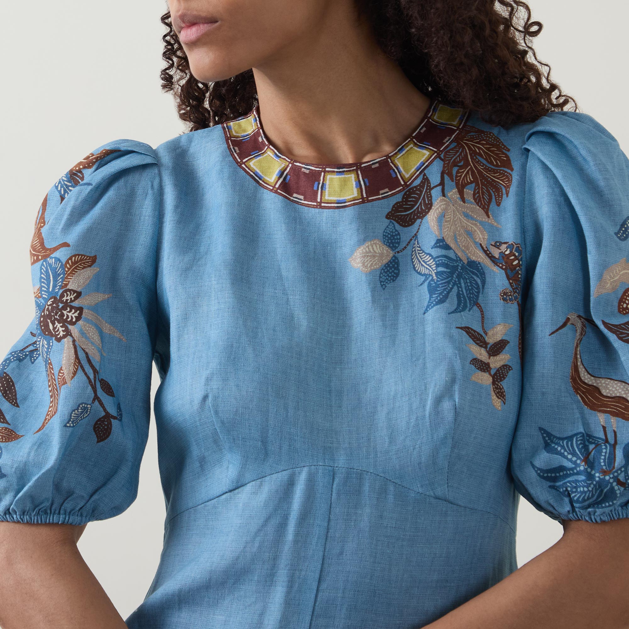 • Midi length, short puff sleeves with elasticated cuffs, concealed zip fastening to the back, round neckline, embroidered floral detailing, contrast hem