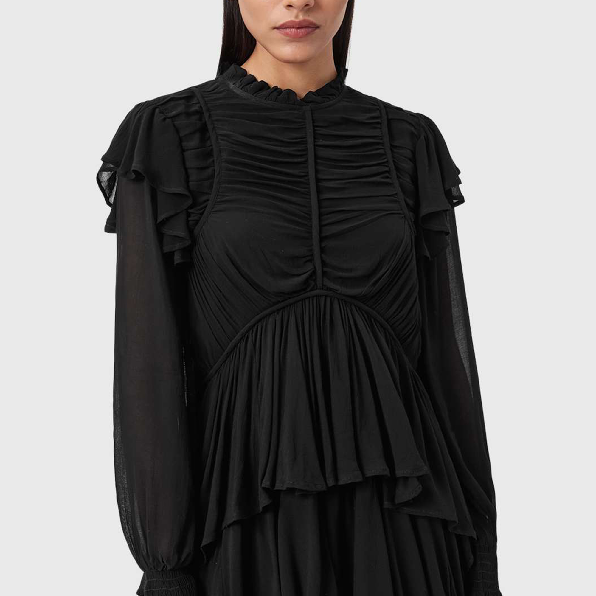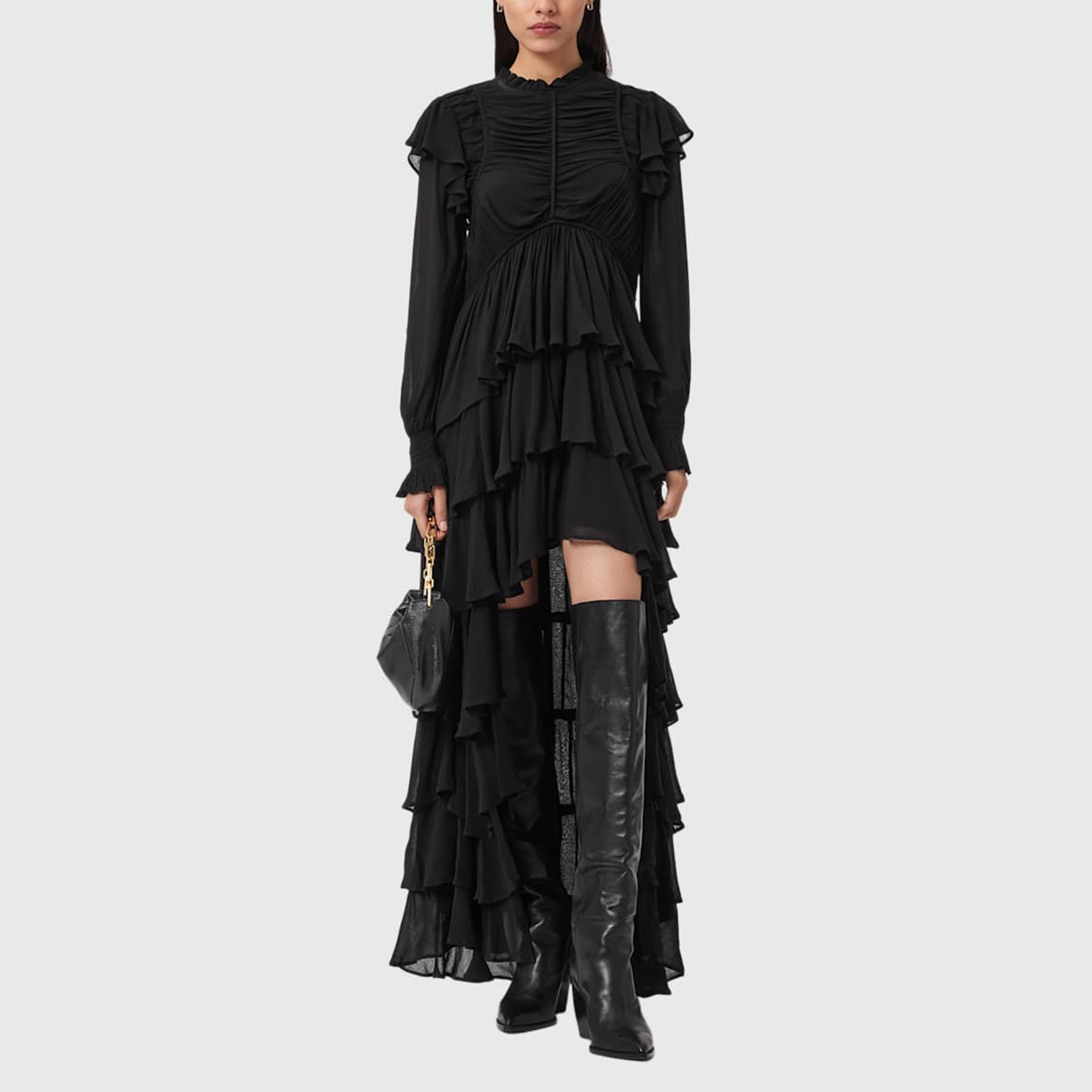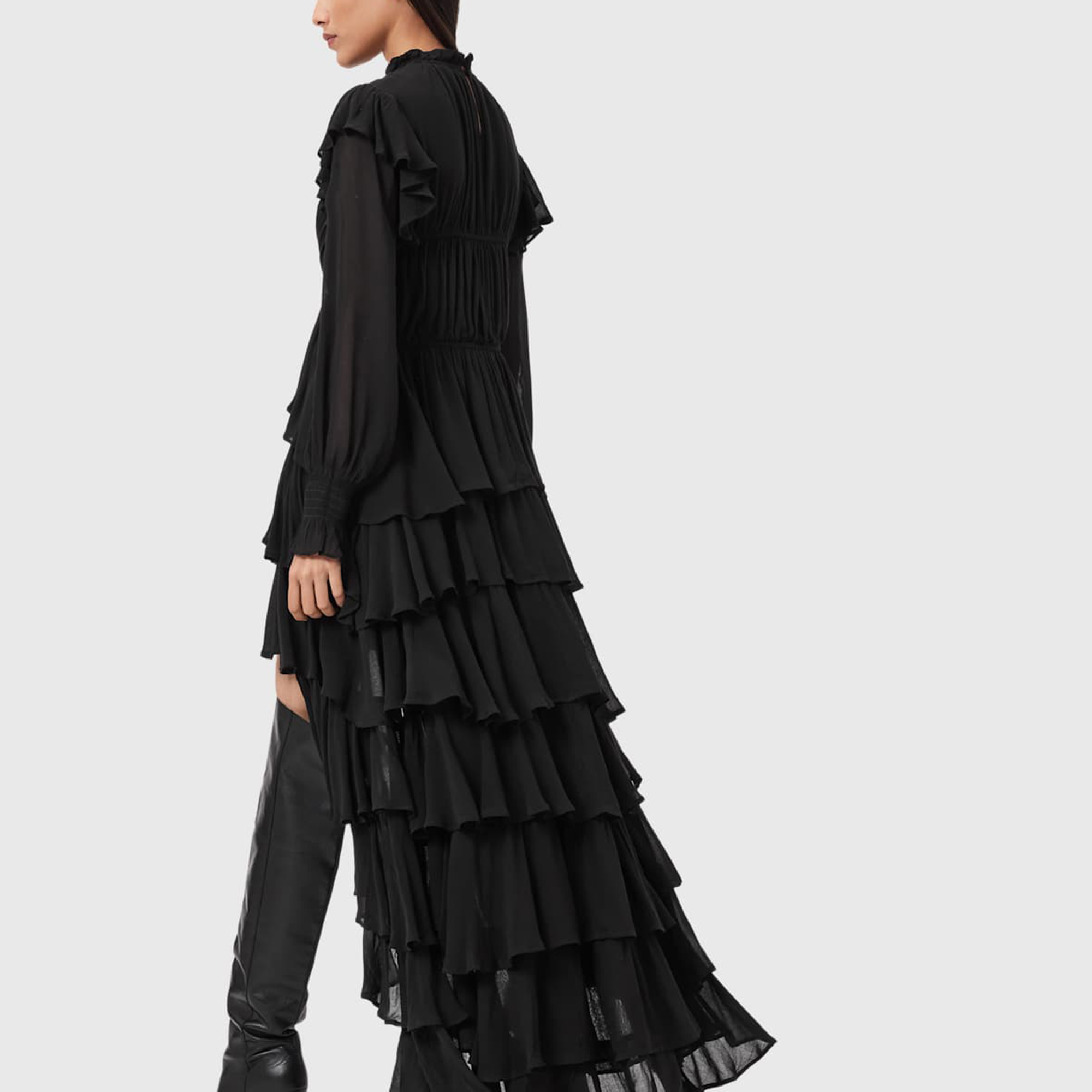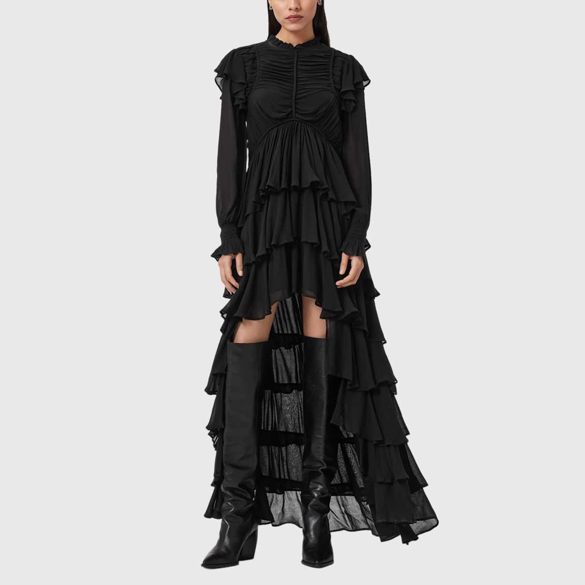- Long blouson sleeves, gathering, elasticated cuffs, frilled details, fully lined (except sleeves), tiered skirt, rouching, binding details, high-low hemline