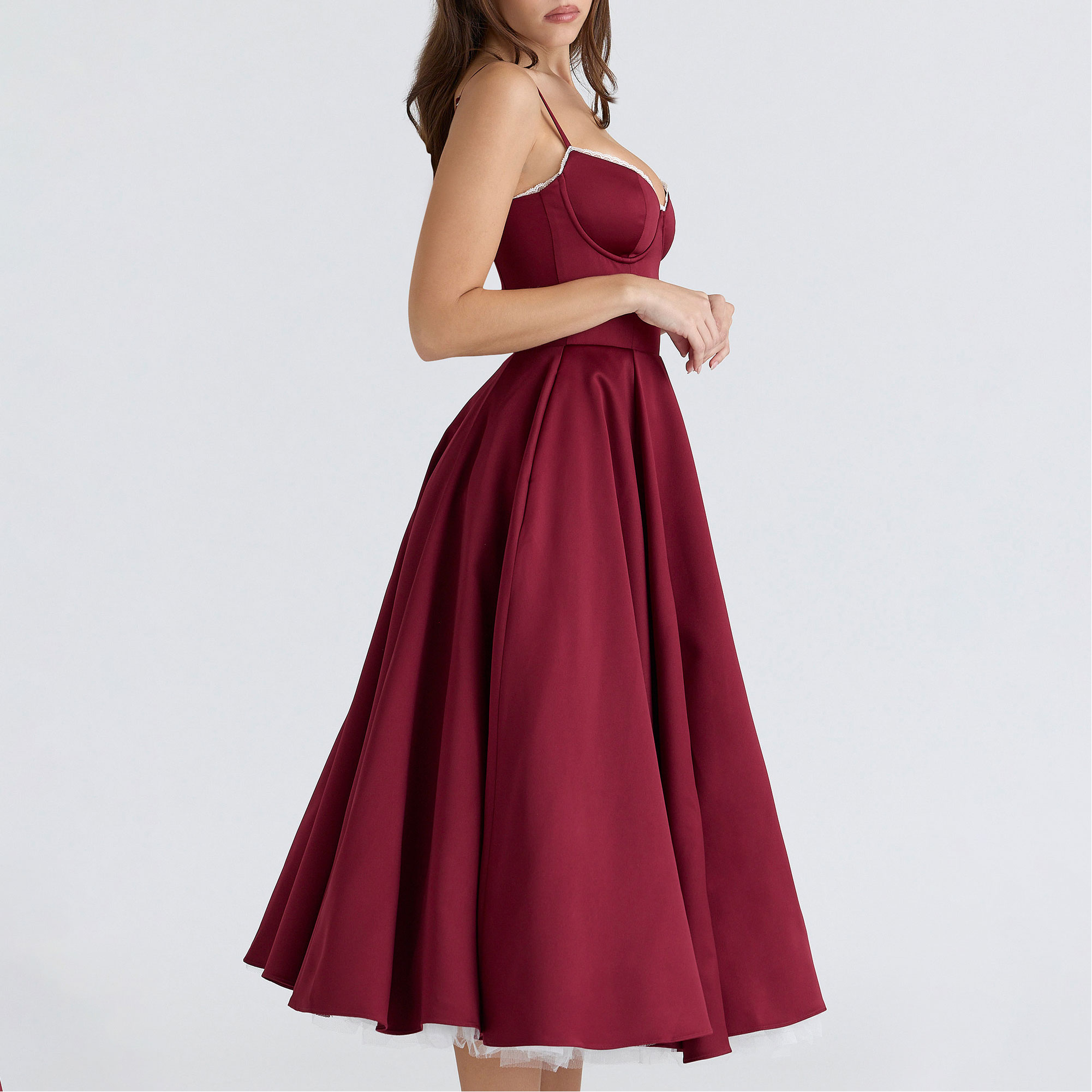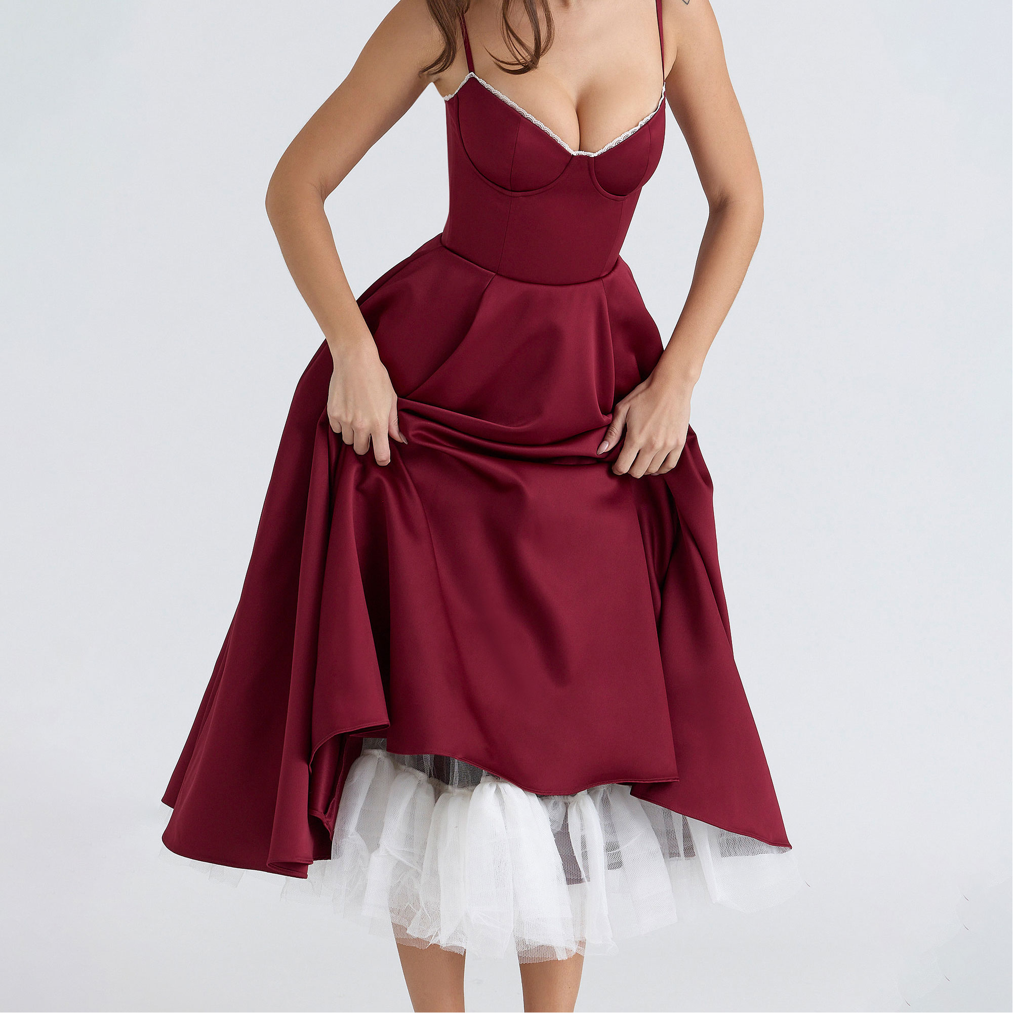 - Duchess satin, sweetheart neckline features supportive underwired cups, adjustable straps, floaty midi skirt, soft tulle underskirt creating volume