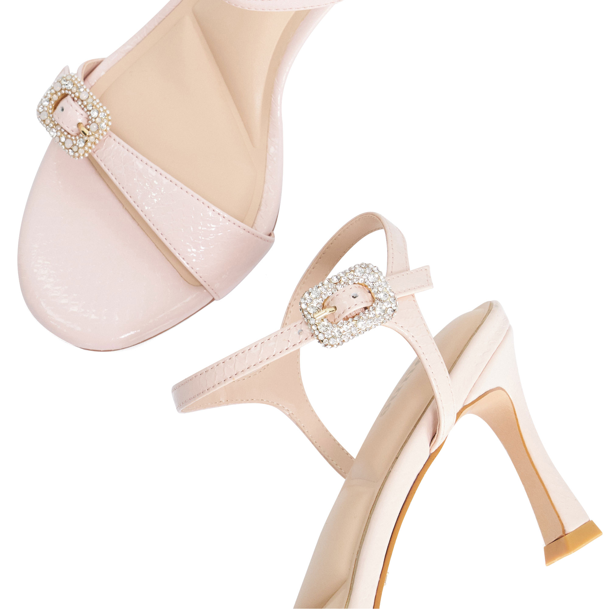 • Diamante buckle fastening, ankle strap, flared heel, sandal toe