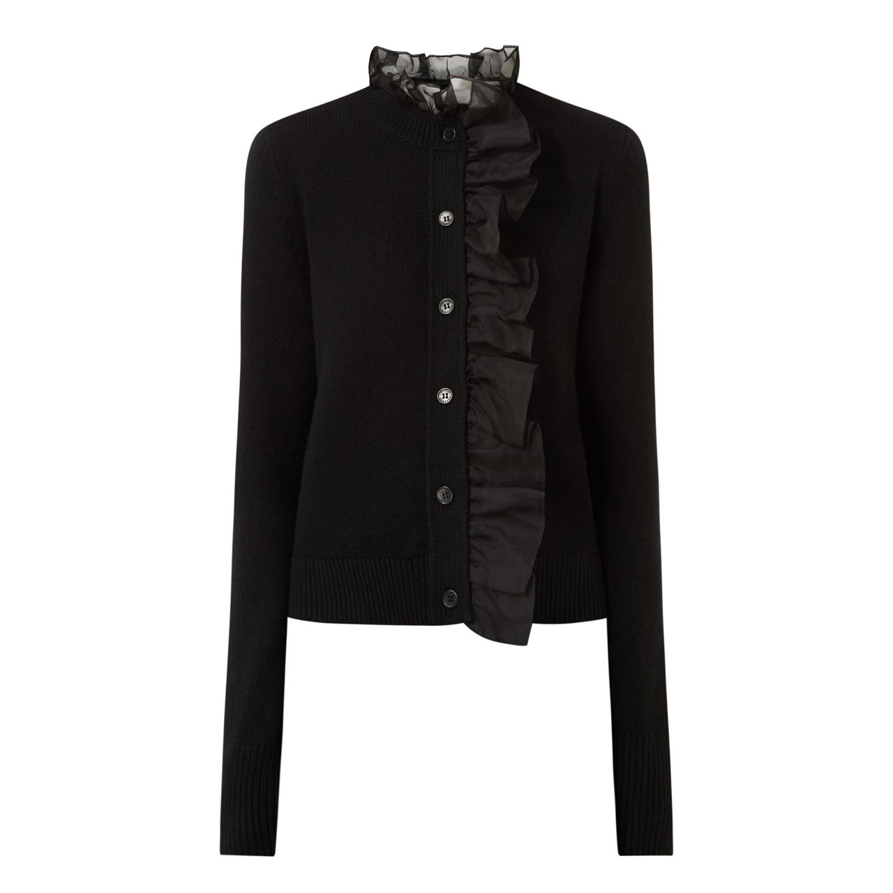 • Round neckline, button fastening, frill detailing, long sleeves, ribbed trims, knit structure