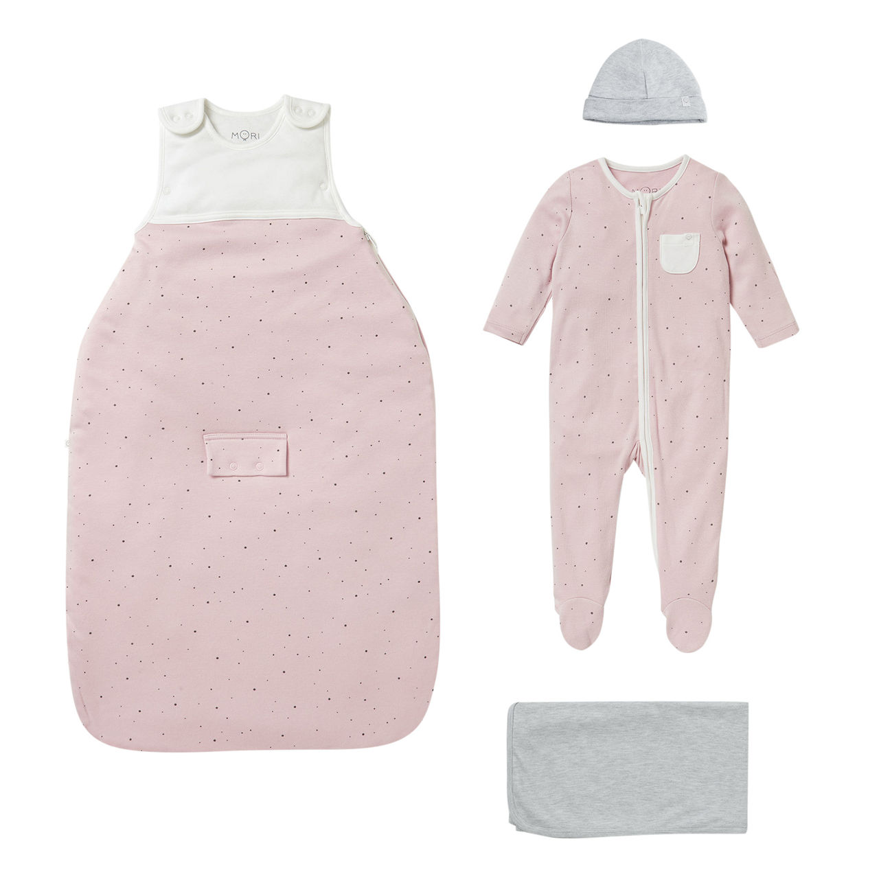 - Four piece set, hat, blanket, long sleeve sleepsuit, zip fastening, grow bag (0.5 Tog), snap button fastening.