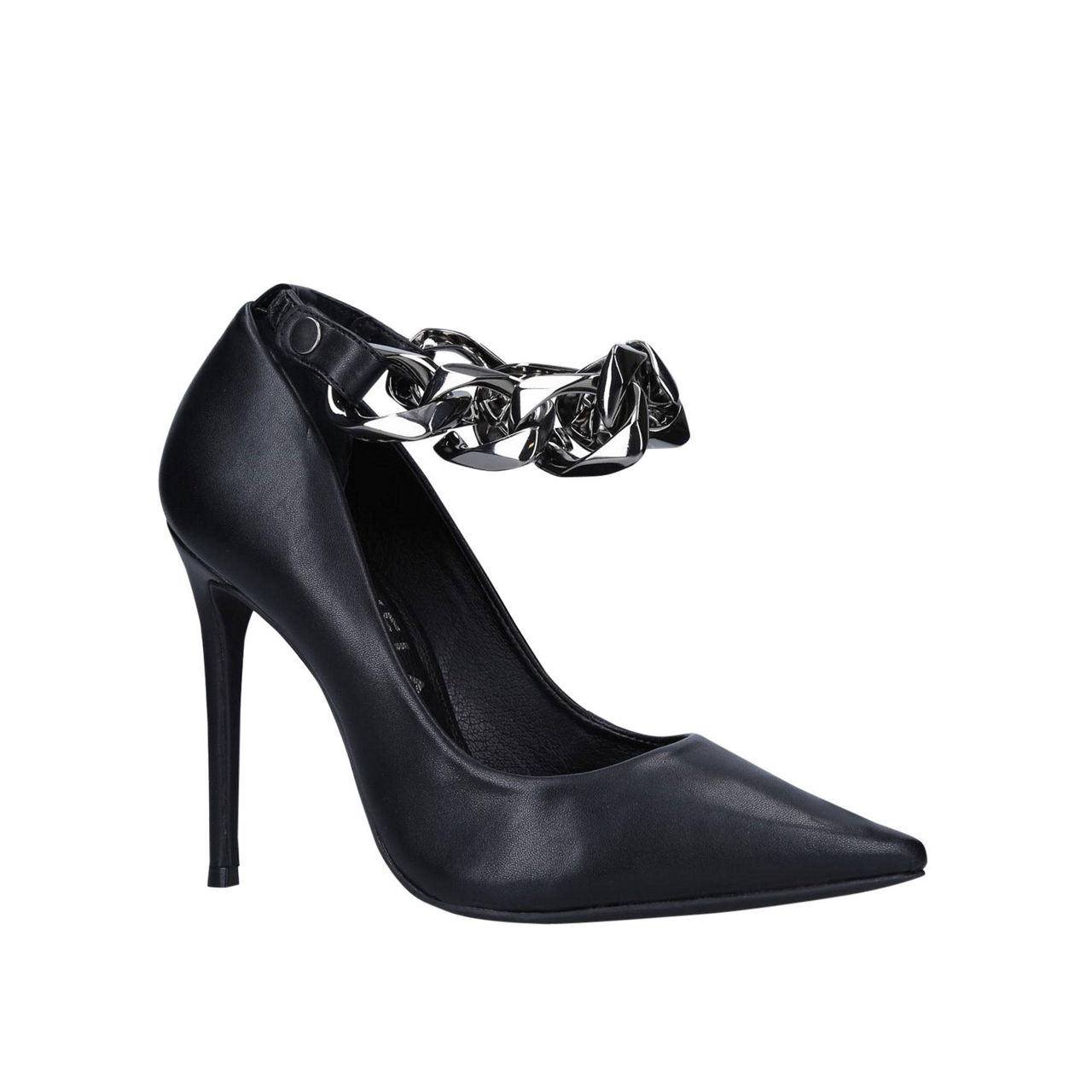 - Slip on style, pointed toe, removable chain detail, stiletto heel.