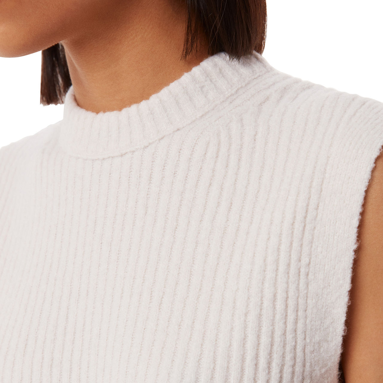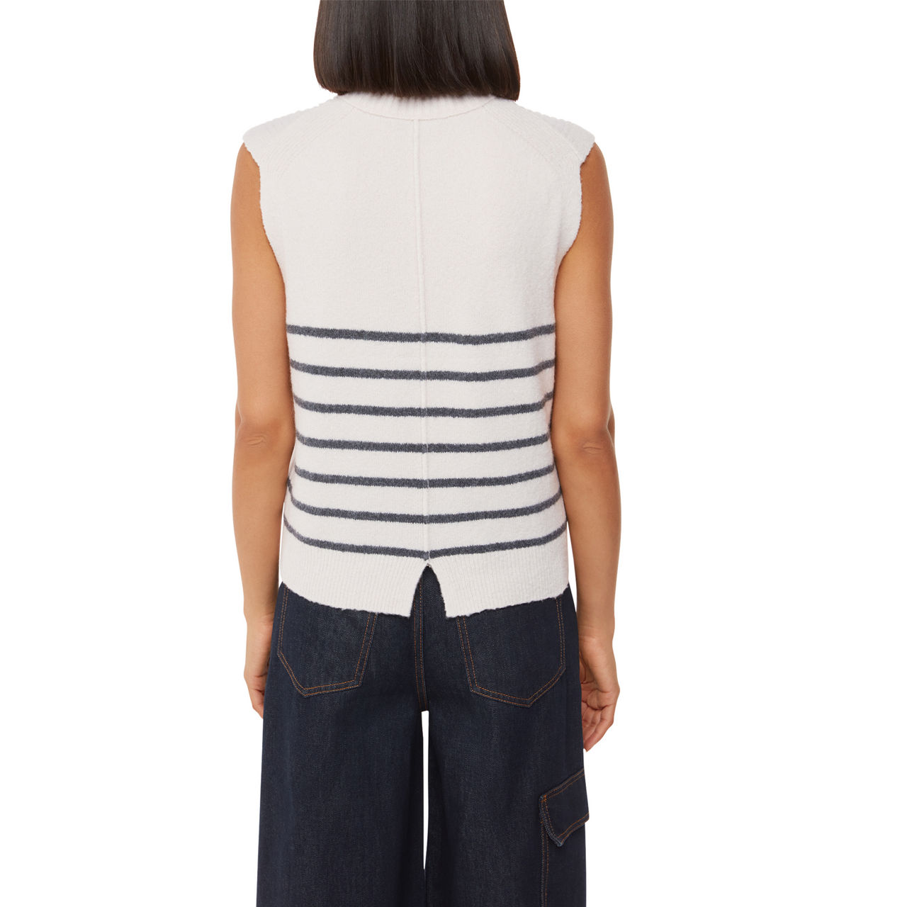 - Mock neckline, rib knit structure, straight hemline, sleeveless, striped pattern, notched hemline at back