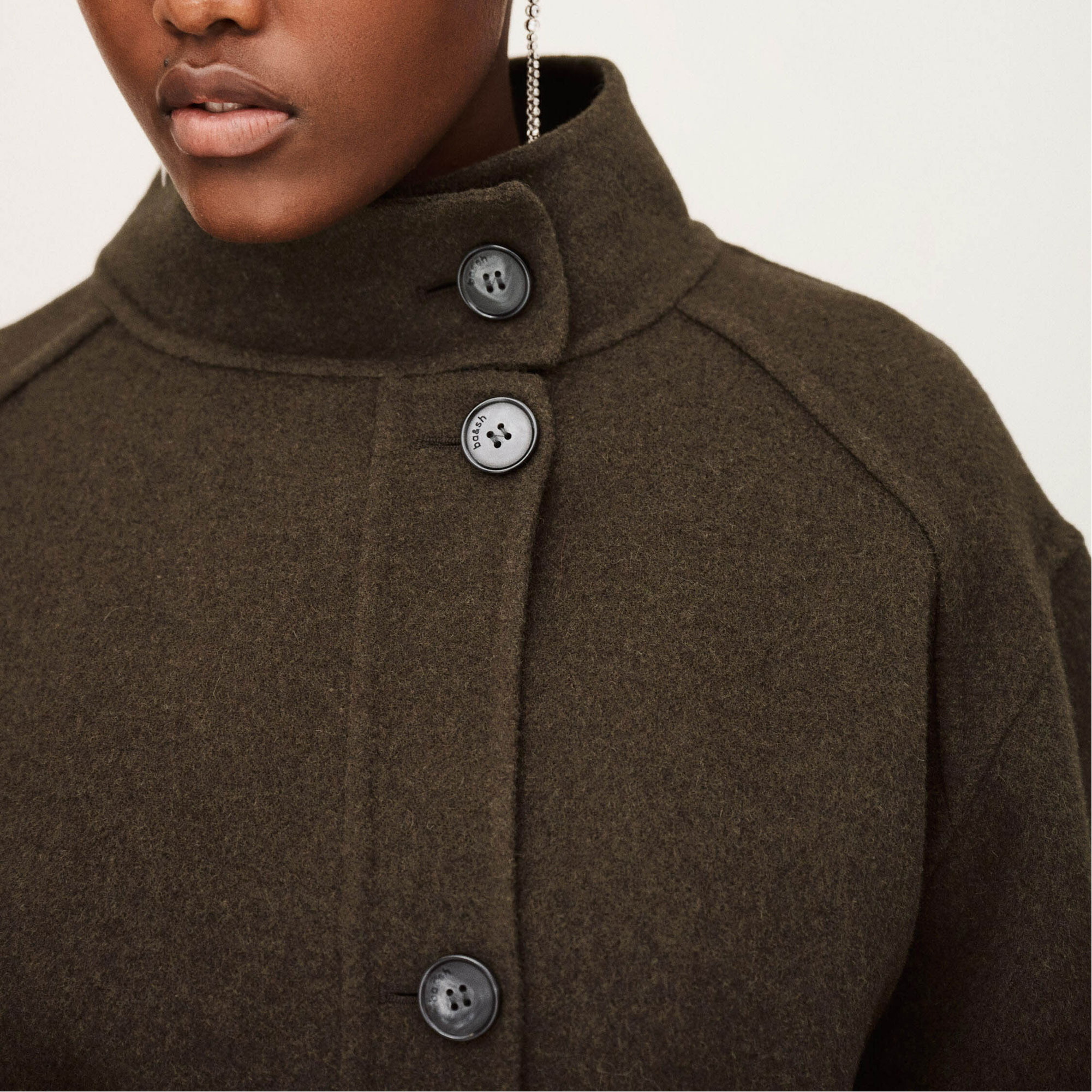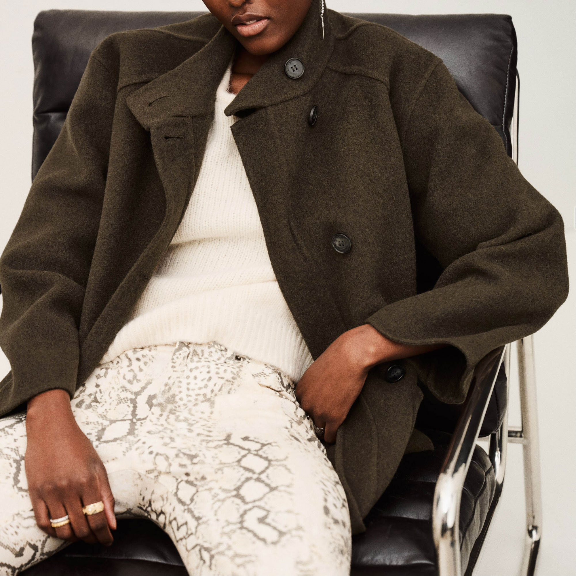 - Offset buttoning, patch pockets, double-sided design, button placket detail under the sleeves