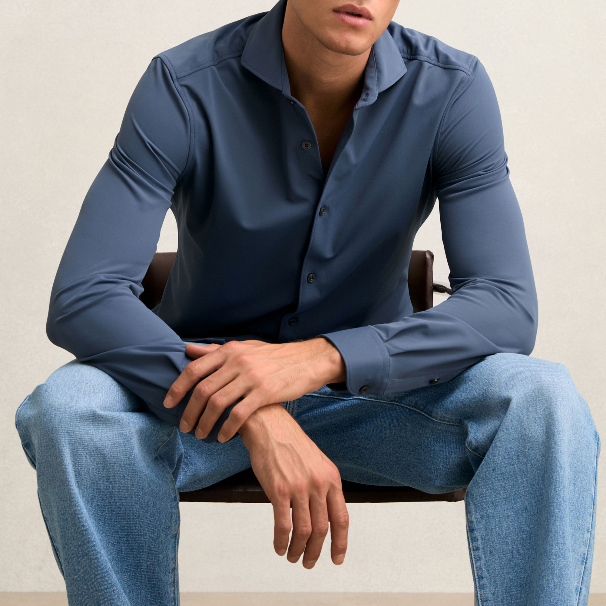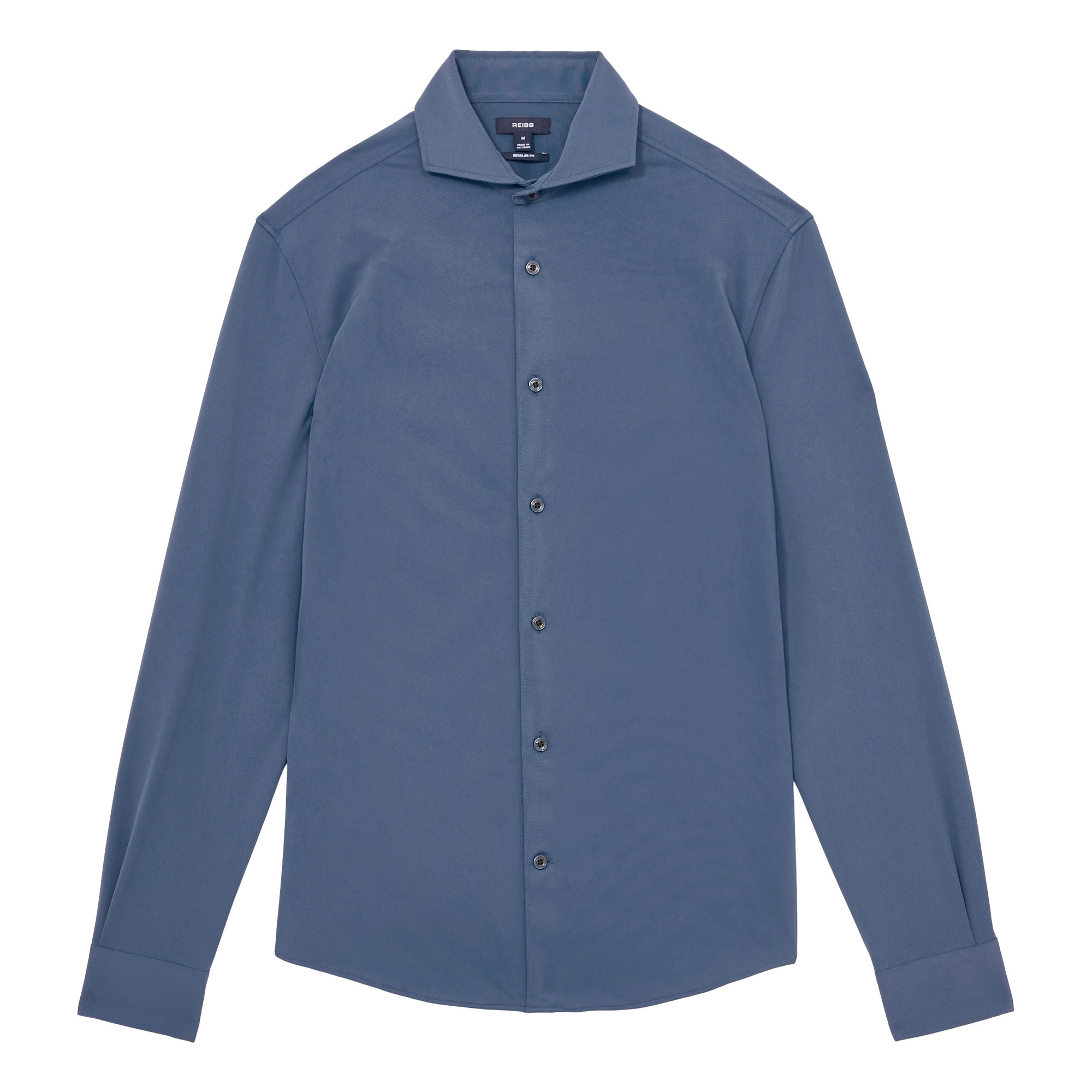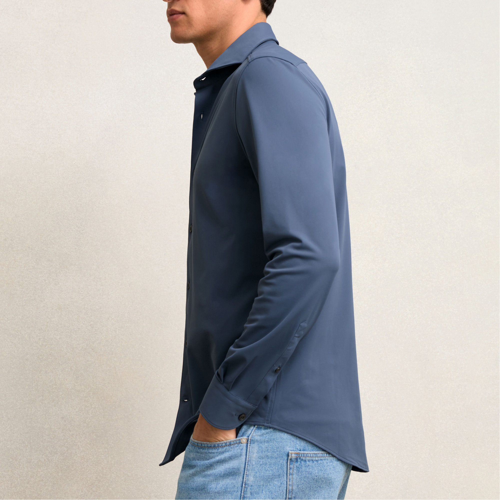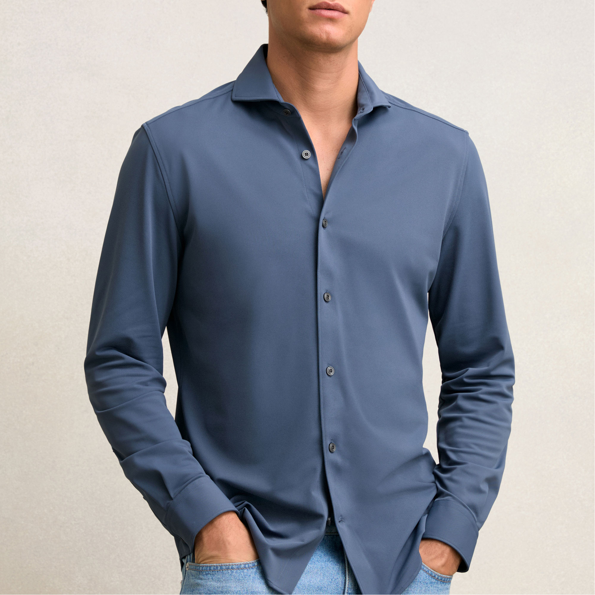 - Stretch-fused jersey fabric, cutaway collar, buttoned cuffs, relaxed silhouette, French button placket, long sleeves