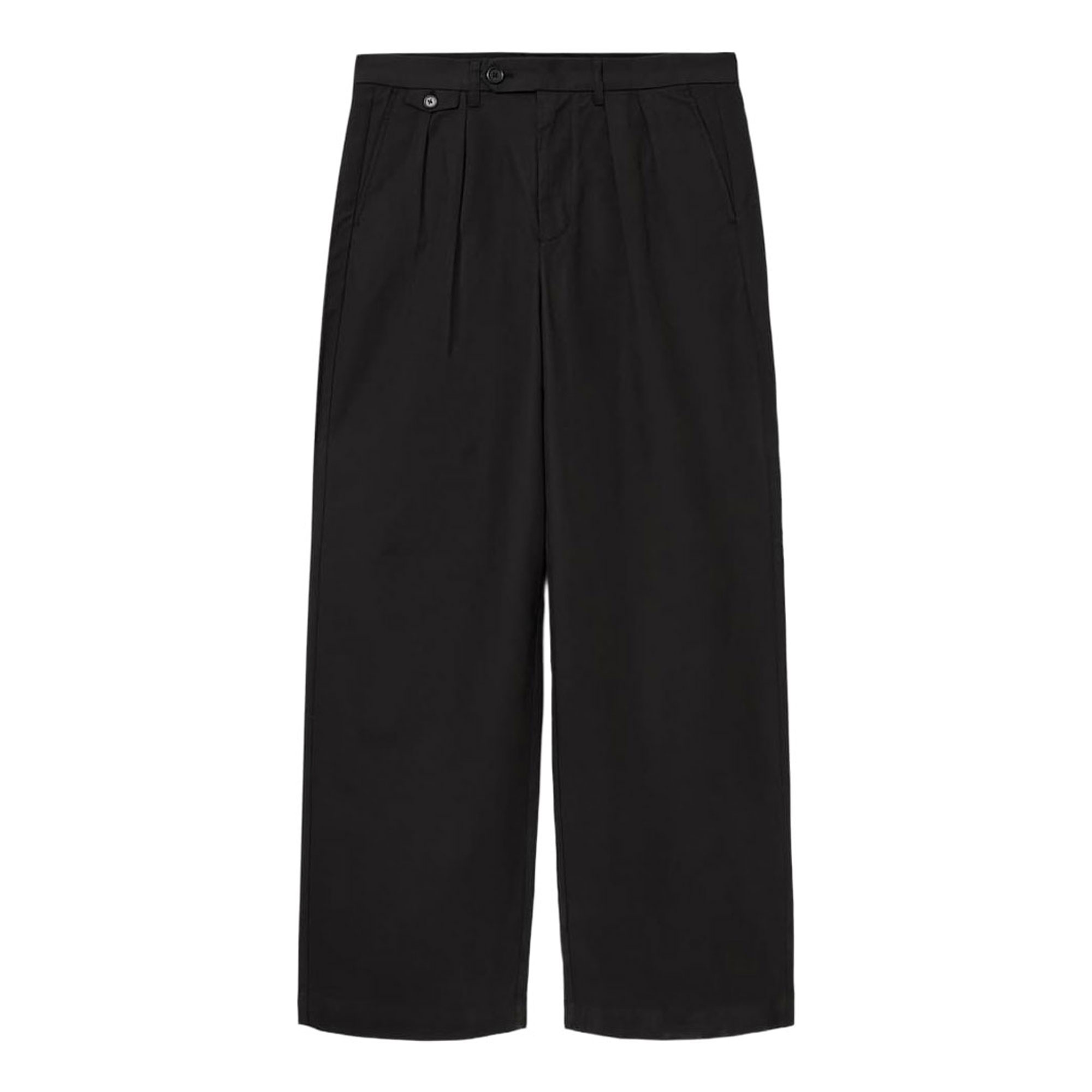 - Wide leg, double pleated, fly zip fastening, front slanted pockets, ticket pockets, belt loop, rear pockets with button fastening
