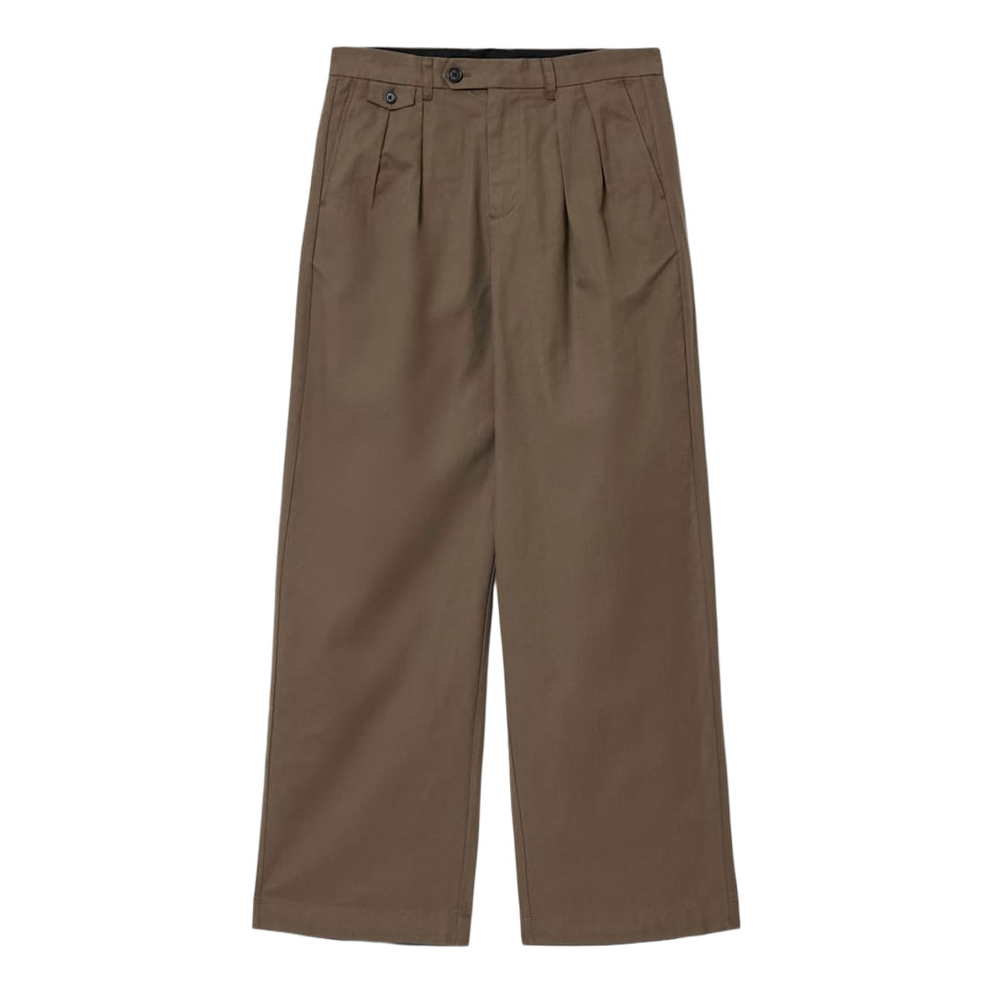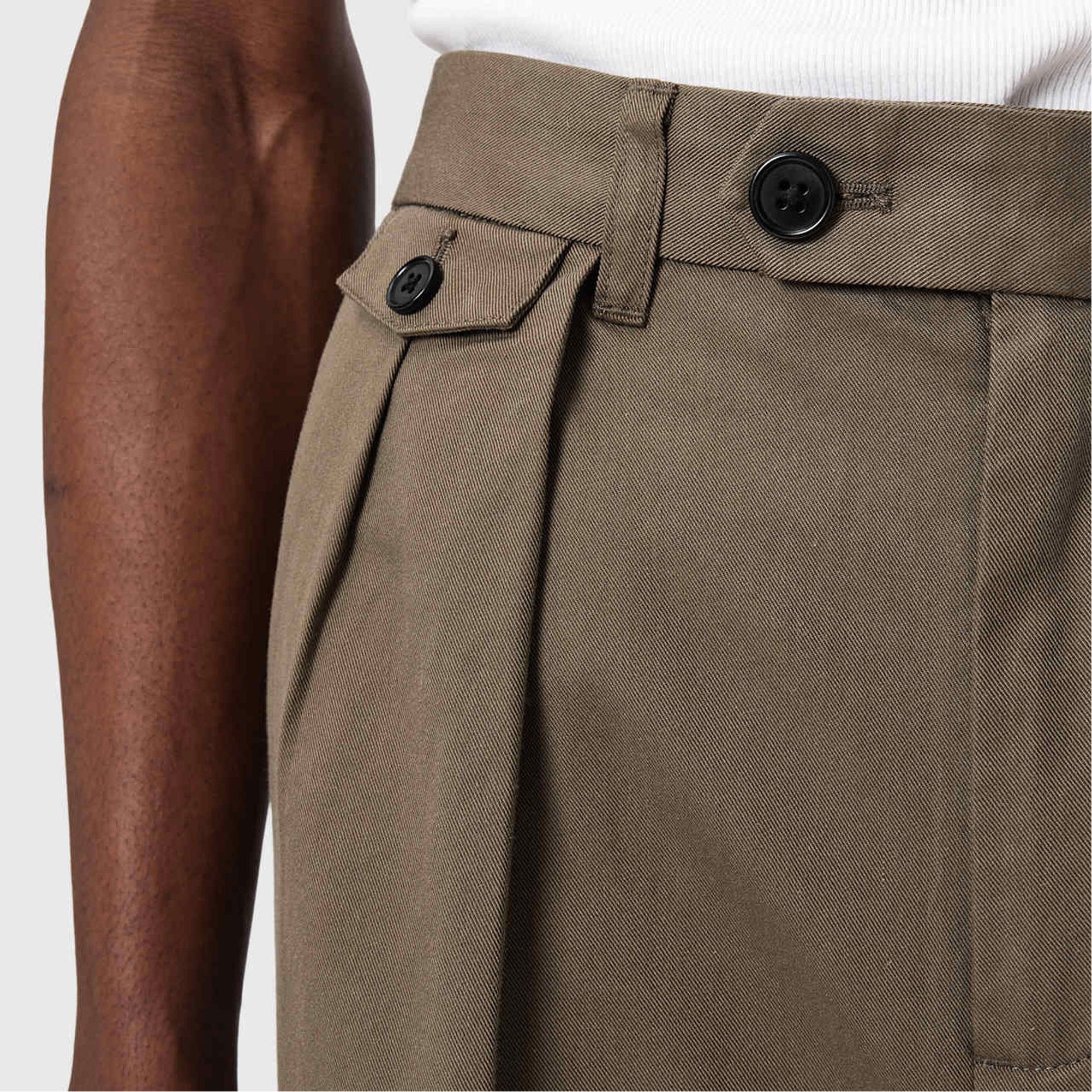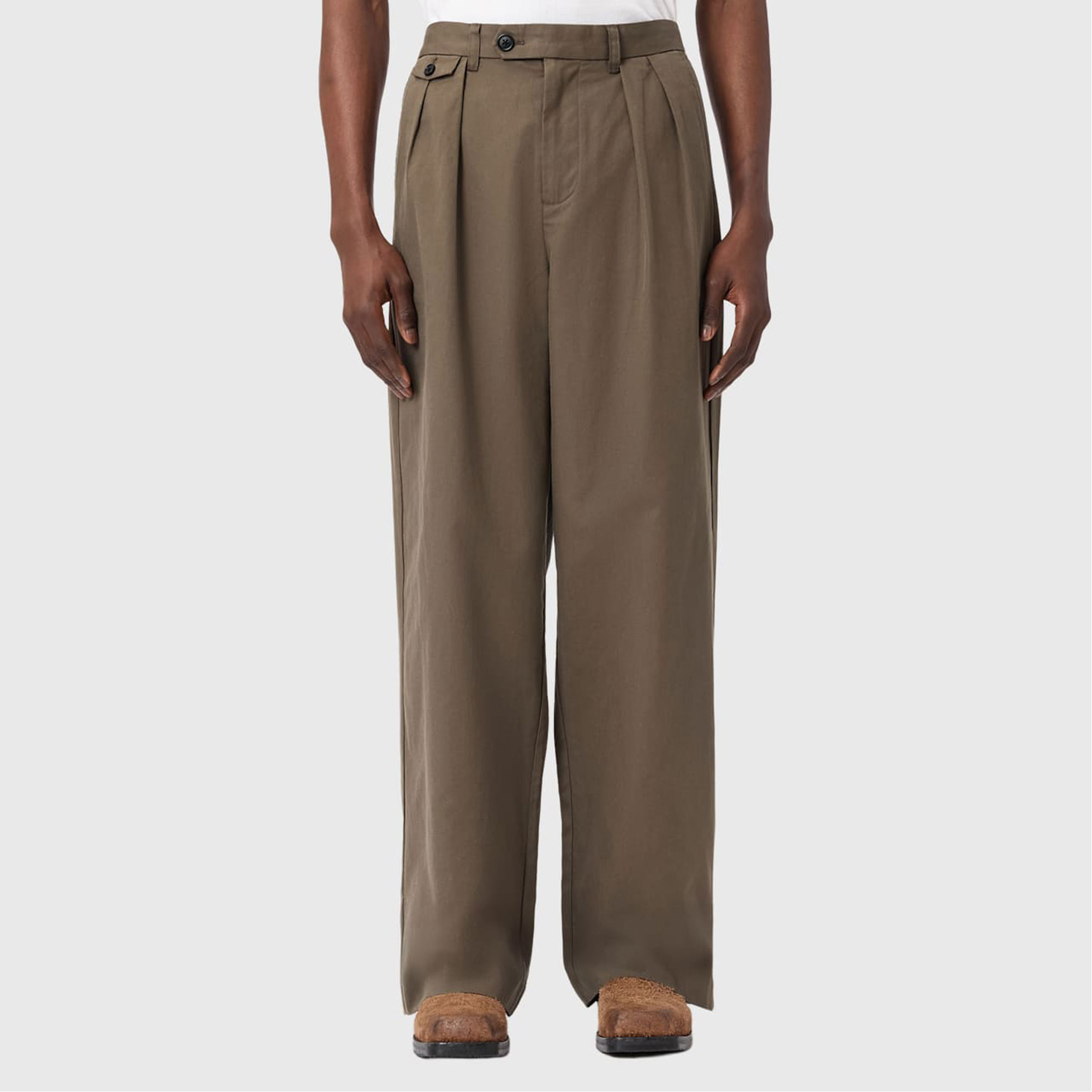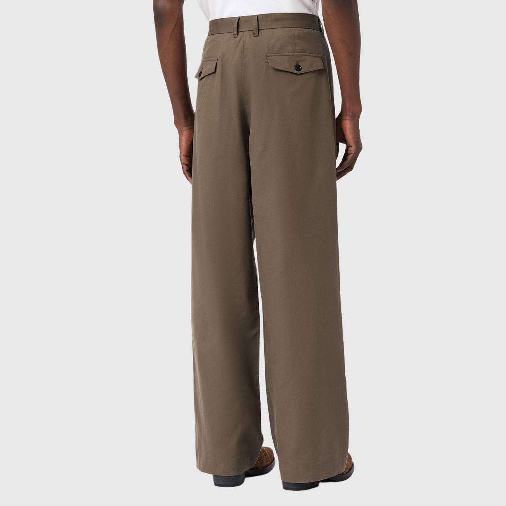 • Wide leg, double pleated trousers, front zip closure, front slanted pockets, ticket pocket, belt loops, back pockets with button fastening