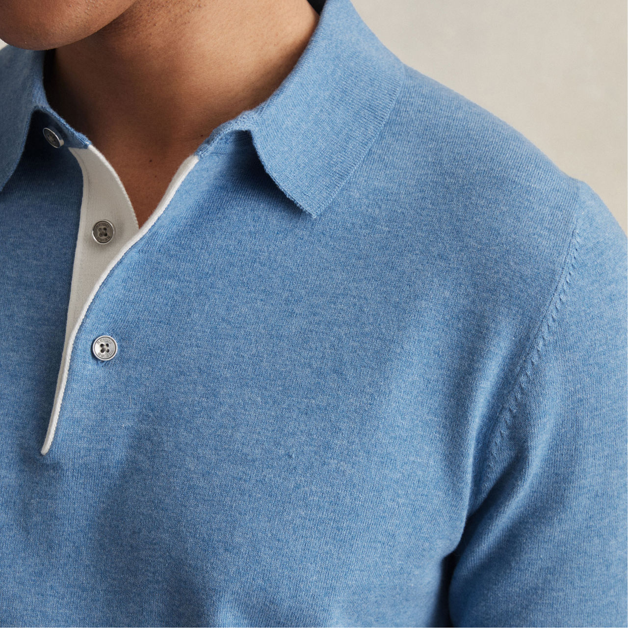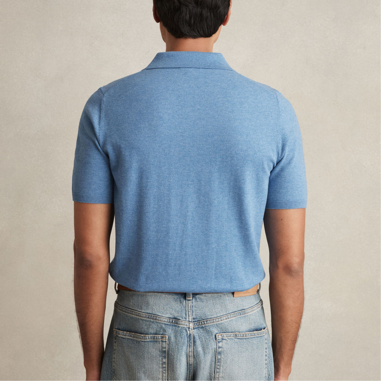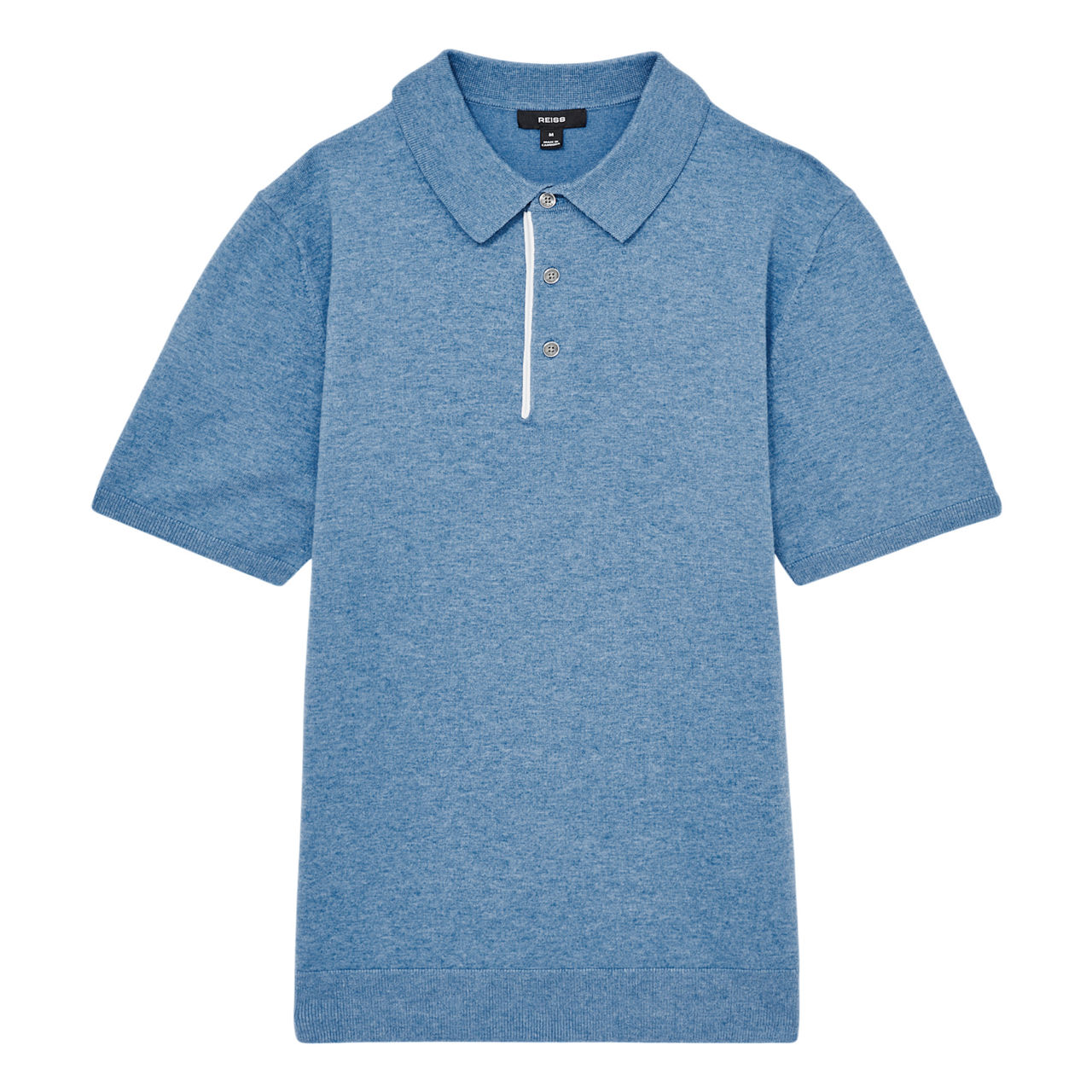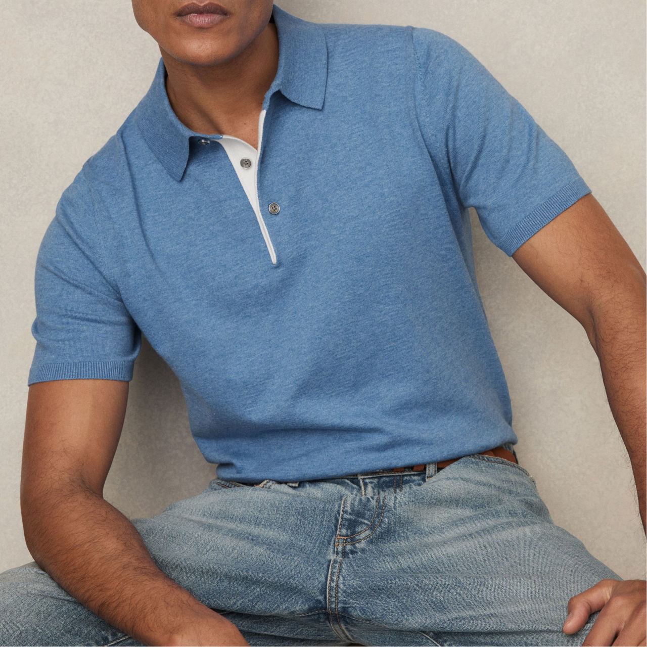 - Compact knit, mélange, contrasting short button placket, polo collar, short sleeves, regular length, button neckline