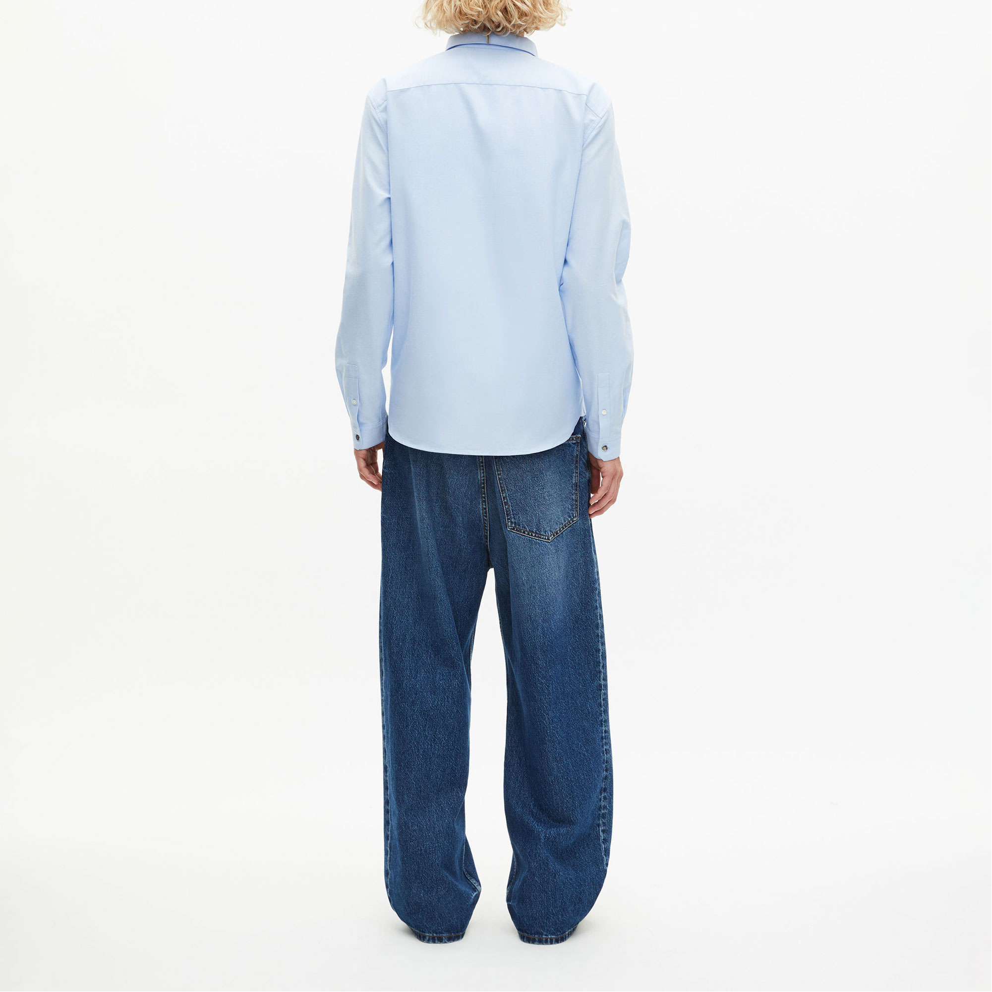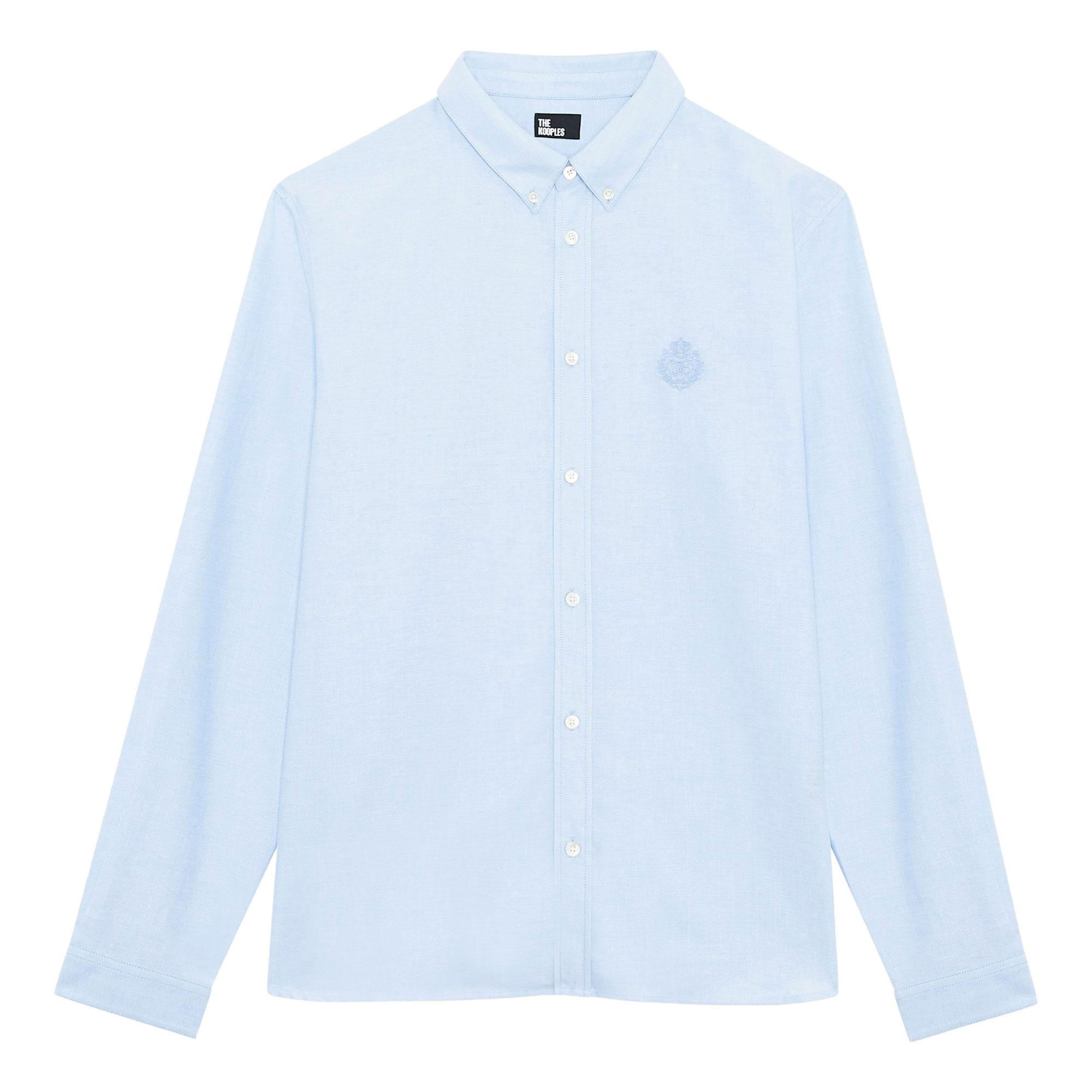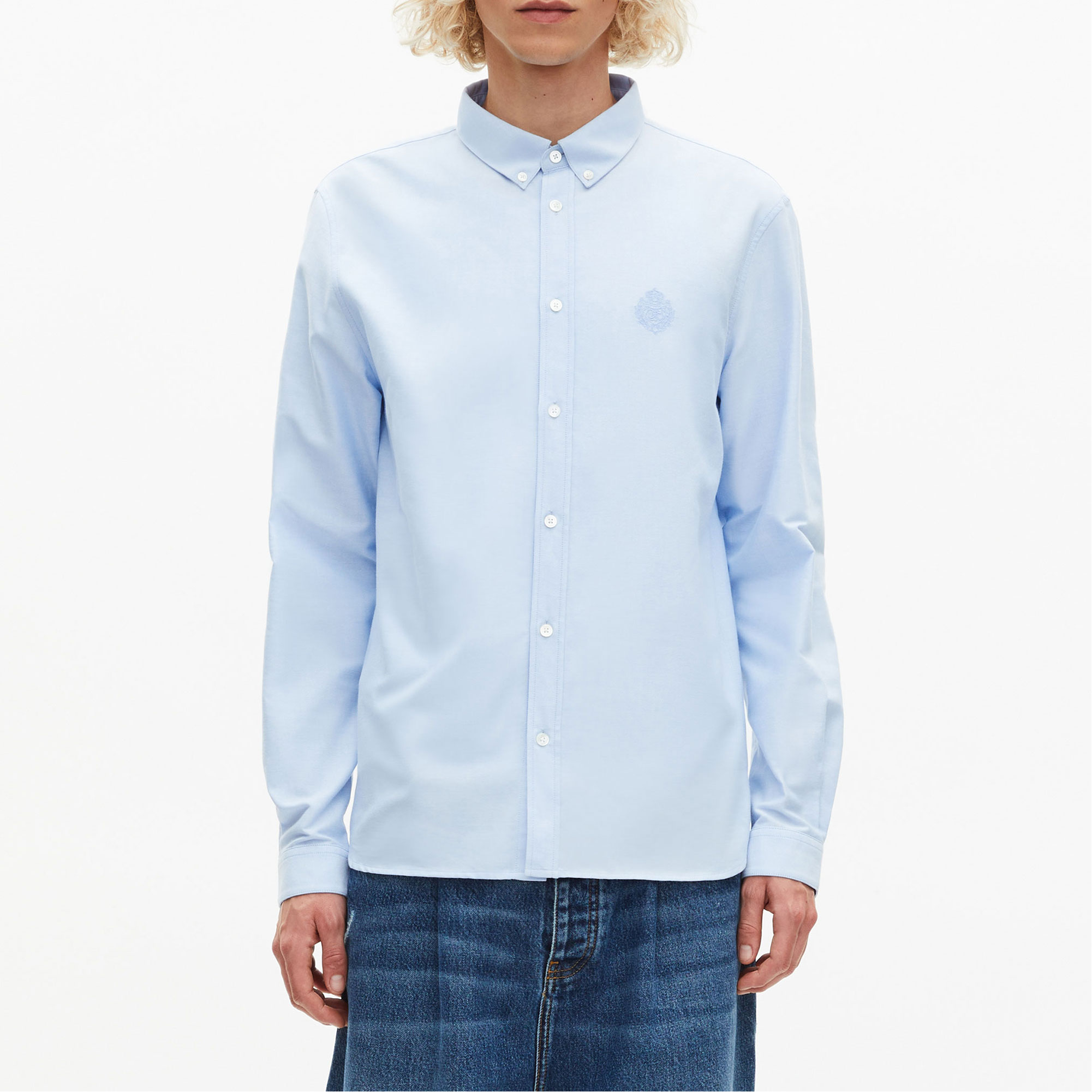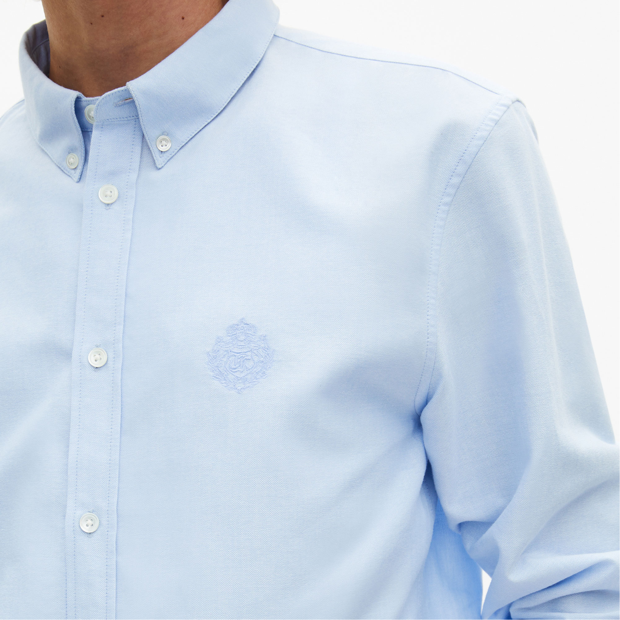 - Straight cut, classic button-down collar, tone-on-tone embroidered coat-of-arms, long sleeves, rivet at bottom of sleeve, American button placket, pearlescent buttons
